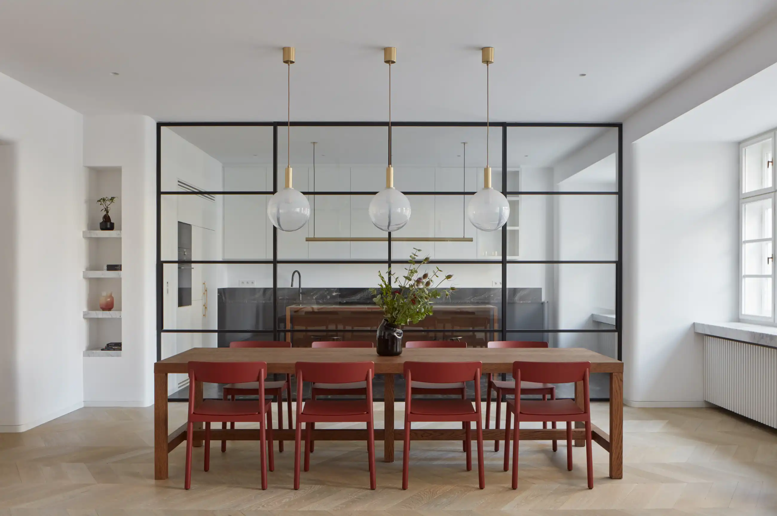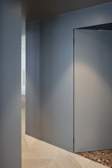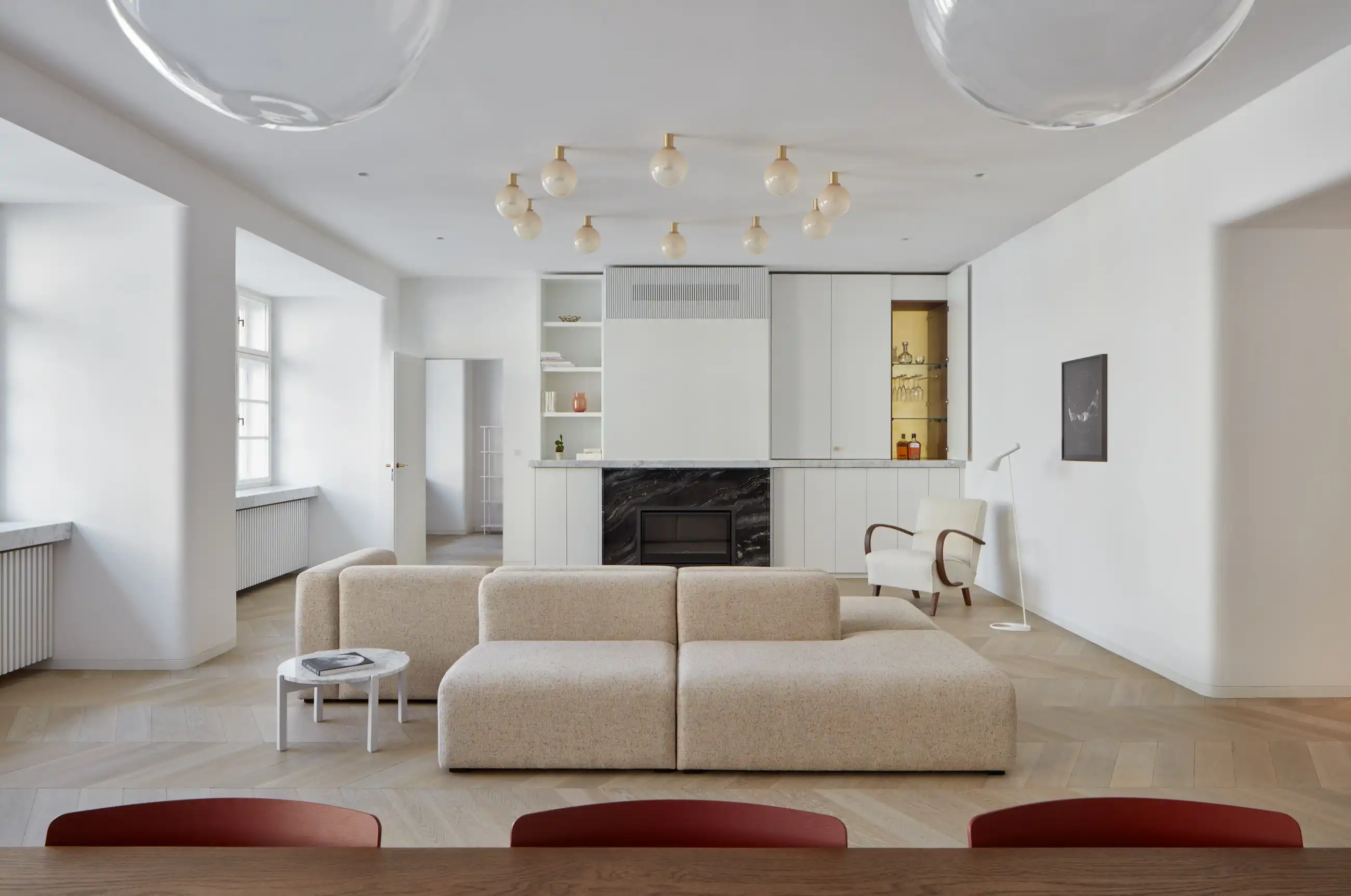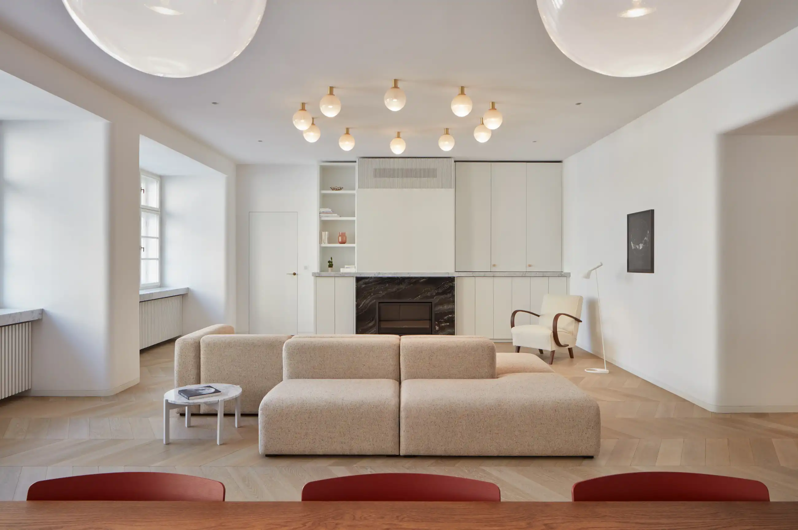 Velkorysý prostor si žádal velkorysé řešení. Byt se nachází v srdci Starého Města pražského a s plochou 250 m² se rozprostírá na celém podlaží rekonstruovaného bytového domu z pozdních 20. let. Architektura domu naznačuje posun od stylu art deco k ranému funkcionalismu, který se stal inspirací i pro samotný interiér. Hlavní roli hrají nadčasové materiály, rafinované detaily, vestavné nábytky a vybavení řešené na míru. Zadání i náš záměr bylo vytvořit neokázalé a spíše minimalistické současné bydlení, kde zdánlivá jednoduchost v sobě nese určitou vnitřní bohatost a rozmanitost prožitků. Při vstupu tak přivítá čistý obytný prostor zalitý denním světlem, v druhém kroku však interiér nabízí momenty překvapení a objevování – podobně jako v adventním kalendáři člověk předem neví, co se za kterými dveřmi či dvířky ukrývá… Tady se při otevření odhalují odlišné atmosféry – například dýhované vnitřky skříní, mosazný bar nebo celá červená toaleta.