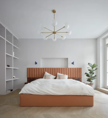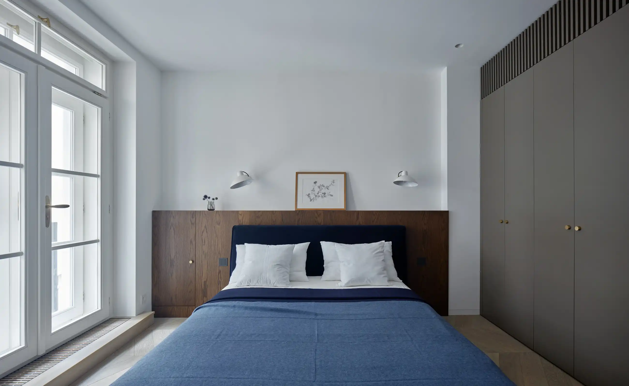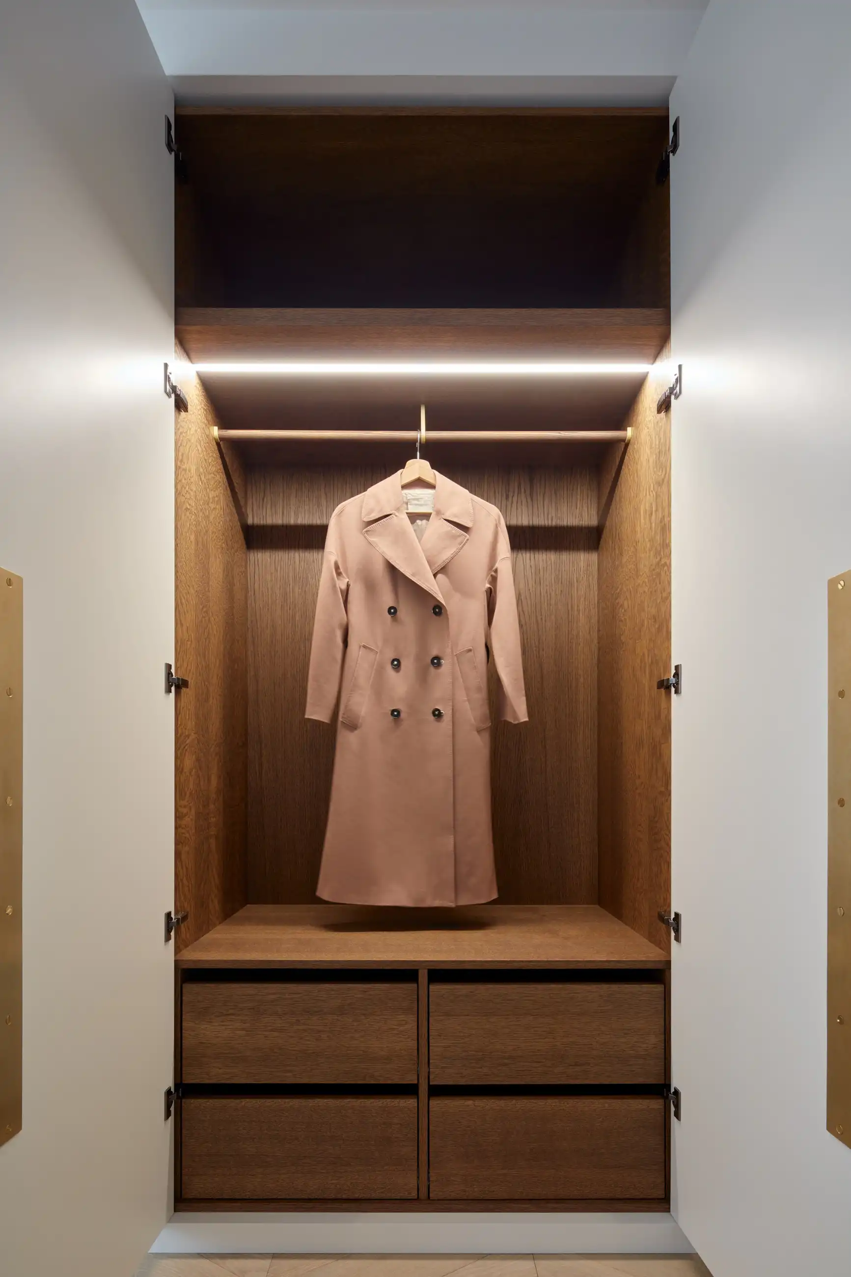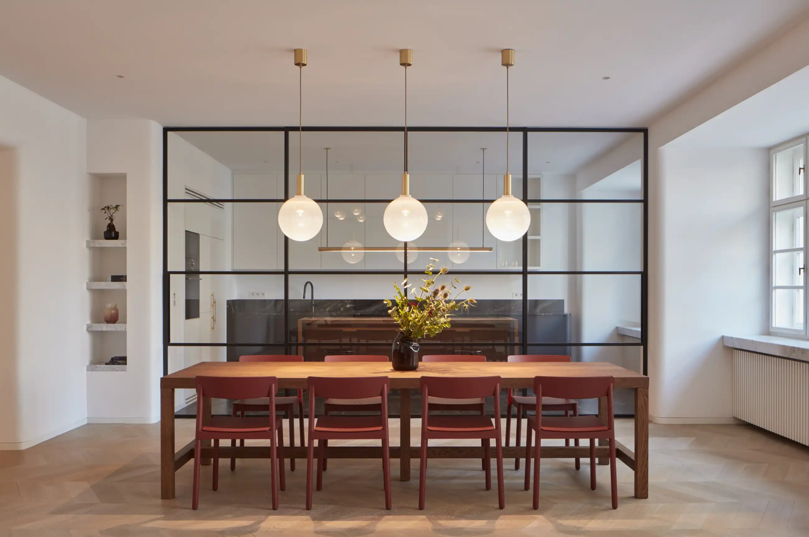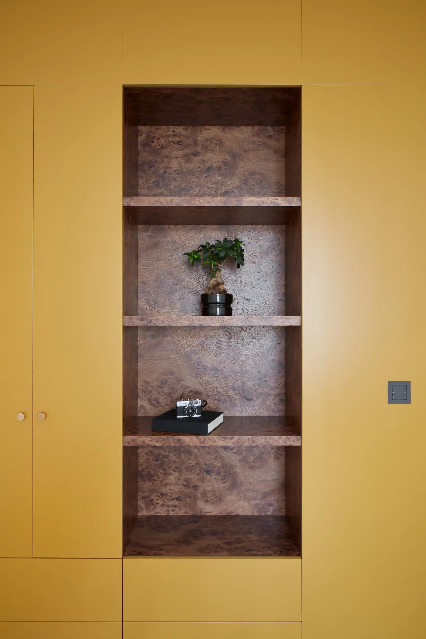 Velkorysý prostor si žádal velkorysé řešení. Byt se nachází v srdci Starého Města pražského a s plochou 250 m² se rozprostírá na celém podlaží rekonstruovaného bytového domu z pozdních 20. let. Architektura domu naznačuje posun od stylu art deco k ranému funkcionalismu, který se stal inspirací i pro samotný interiér. Hlavní roli hrají nadčasové materiály, rafinované detaily, vestavné nábytky a vybavení řešené na míru. Zadání i náš záměr bylo vytvořit neokázalé a spíše minimalistické současné bydlení, kde zdánlivá jednoduchost v sobě nese určitou vnitřní bohatost a rozmanitost prožitků. Při vstupu tak přivítá čistý obytný prostor zalitý denním světlem, v druhém kroku však interiér nabízí momenty překvapení a objevování – podobně jako v adventním kalendáři člověk předem neví, co se za kterými dveřmi či dvířky ukrývá… Tady se při otevření odhalují odlišné atmosféry – například dýhované vnitřky skříní, mosazný bar nebo celá červená toaleta.