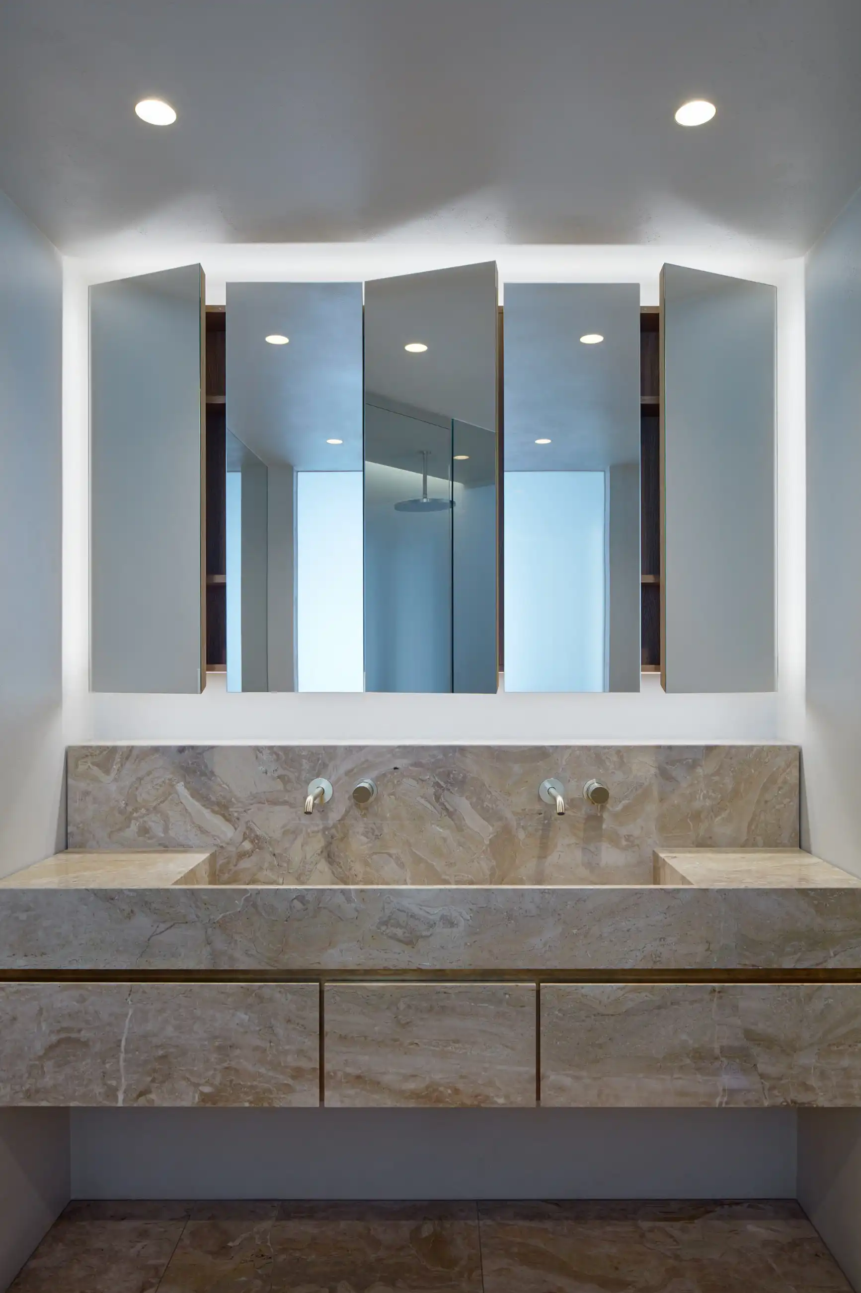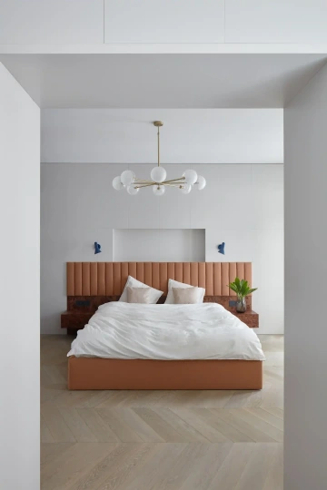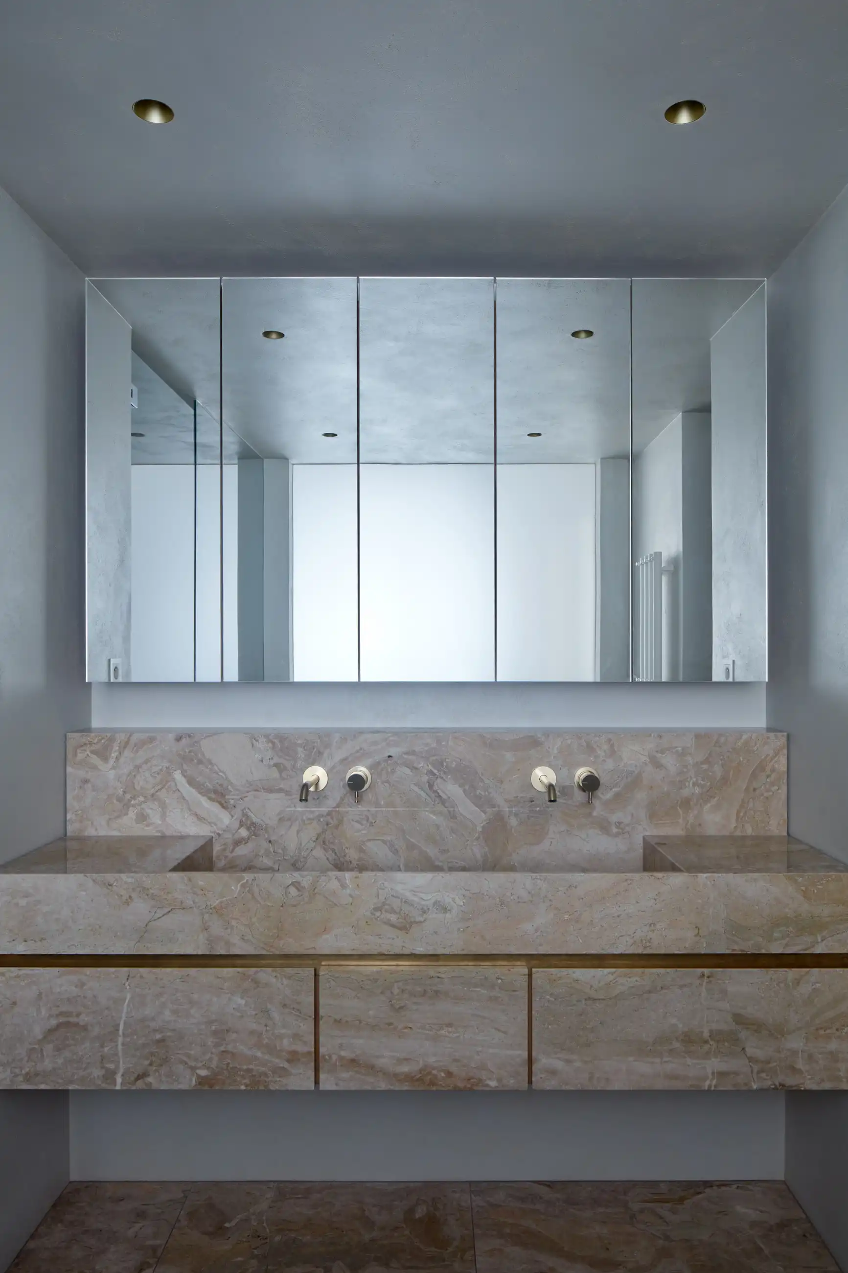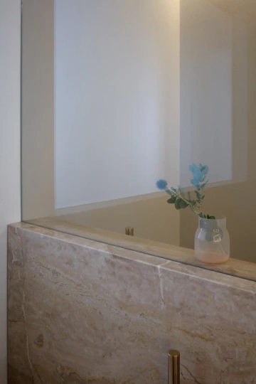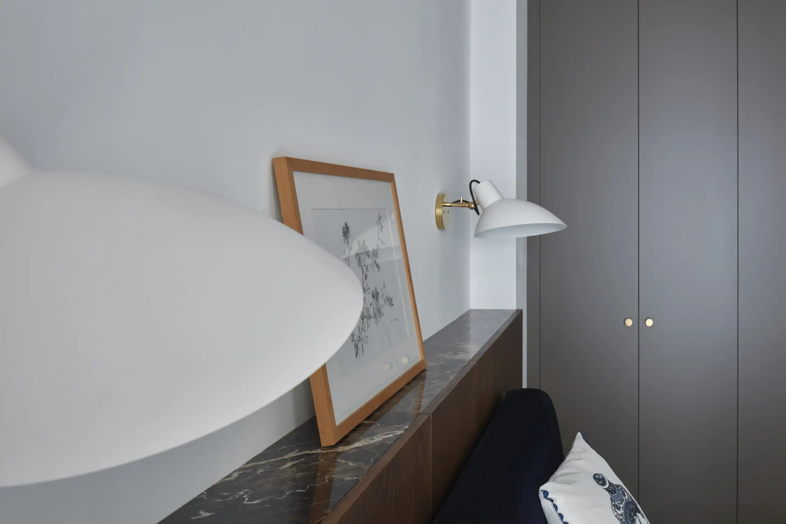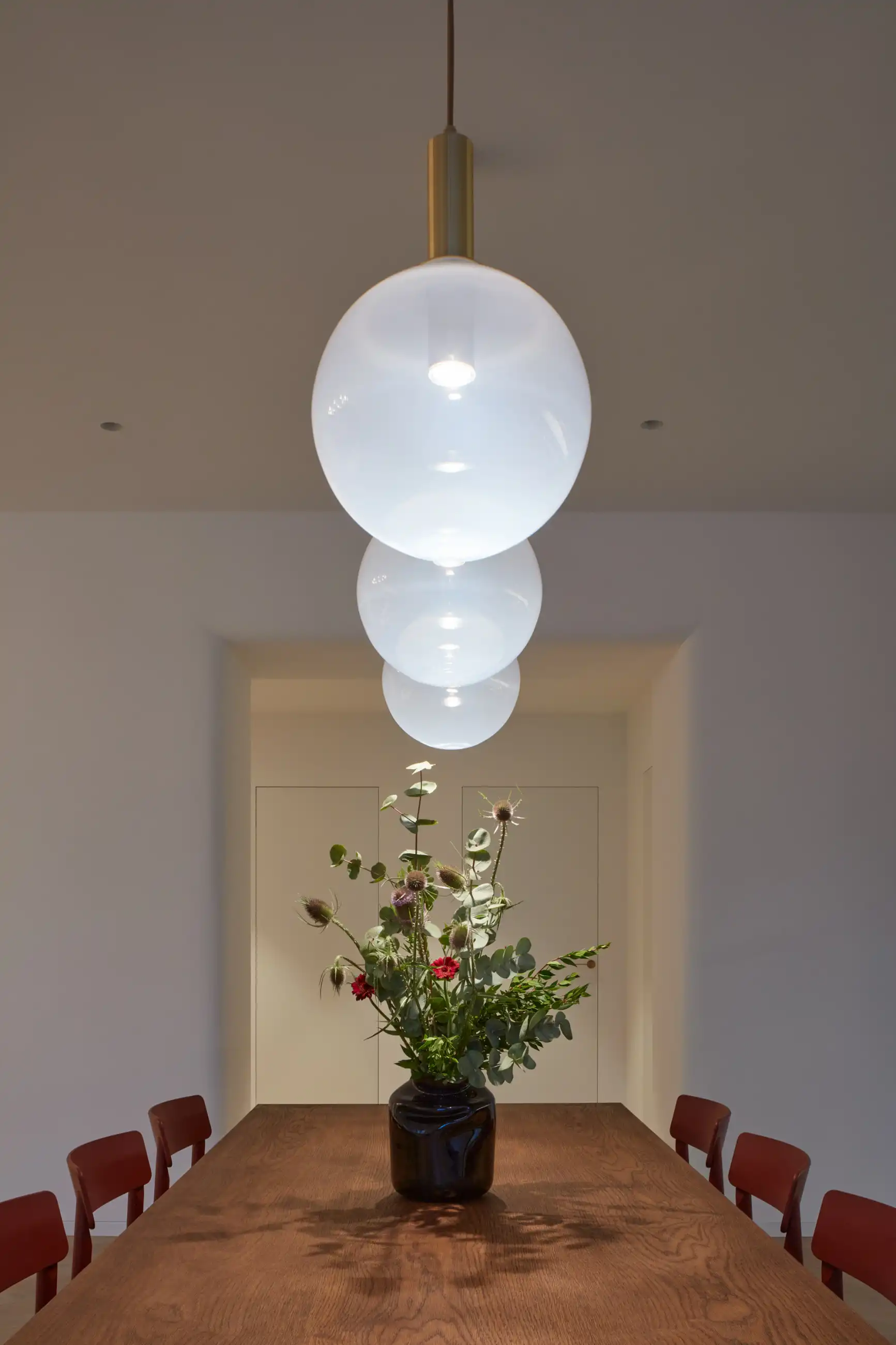 Návrh zahrnuje mnoho prvků řešených na míru: parapety s kryty topení a umyvadlové sestavy, obklad stěn a skříňové stěny včetně mosazných úchytek, kuchyně s ostrůvkem a velký jídelní stůl i odkládací stolky. Na zakázku vznikalo i osvětlení v obytném prostoru ve spolupráci se studiem Dechem, které vytvořilo propojený set svítidel - přisazené koule nad sofa, zavěšené lustry nad stolem, mosaznou trubku nad barem a přisazené kruhy v hale – a jako bonus i skleněné úchytky.