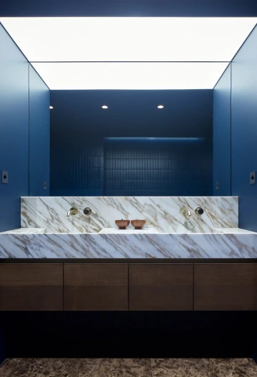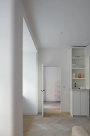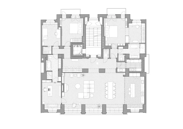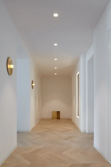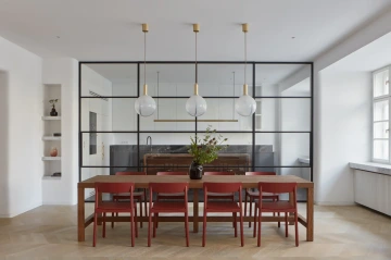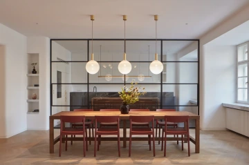 Velkorysý prostor si žádal velkorysé řešení. Byt se nachází v srdci Starého Města pražského a s plochou 250m2 se rozprostírá na celém podlaží rekonstruovaného bytového domu z pozdních 20.let. Architektura domu naznačuje posun od stylu art deco k ranému funkcionalismu, který se stal inspirací i pro samotný interiér. Hlavní roli hrají nadčasové materiály, rafinované detaily, vestavné nábytky a vybavení řešené na míru. Zadání i náš záměr bylo vytvořit neokázalé a spíše minimalistické současné bydlení, kde zdánlivá jednoduchost v sobě nese určitou vnitřní bohatost a rozmanitost prožitků. Při vstupu tak přivítá čistý obytný prostor zalitý denním světlem, v druhém kroku však interiér nabízí momenty překvapení a objevování – podobně jako v adventním kalendáři člověk předem neví, co se za kterými dveřmi či dvířky ukrývá… Tady se při otevření odhalují odlišné atmosféry – například dýhované vnitřky skříní, mosazný bar nebo celá červená toaleta.