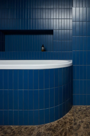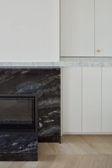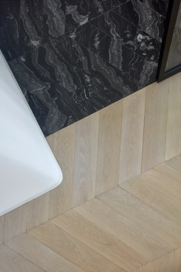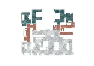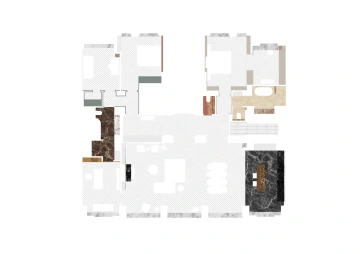Pestrá škála barev a materiálů podporuje odlišný charakter prostorů, skrz opakování vytváří různé vnitřní vztahy a nebojí se odvážných kombinací. Podlaha z louhovaných masivních parket pomyslně propojuje všechny obytné místnosti, na její francouzskou skladbu přesně navazuje i na míru řezaná kamenná dlažba v kuchyni. V celém bytě se nachází celkem šest druhů kamene (4 druhy mramoru, černá žula a červený travertin), akcenty tvoří mosazné prvky a kořenová dýha.