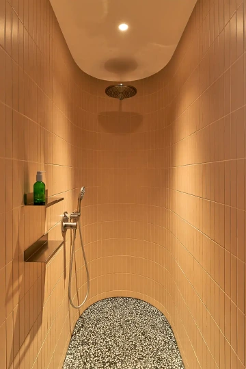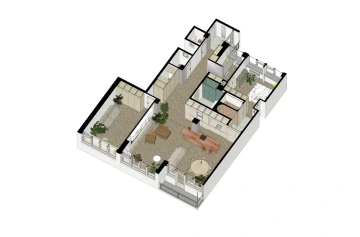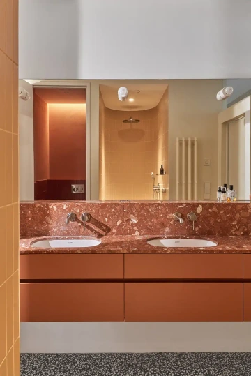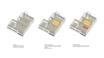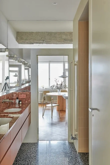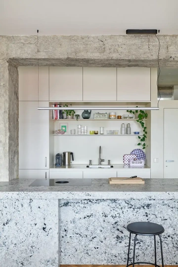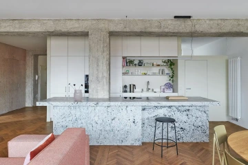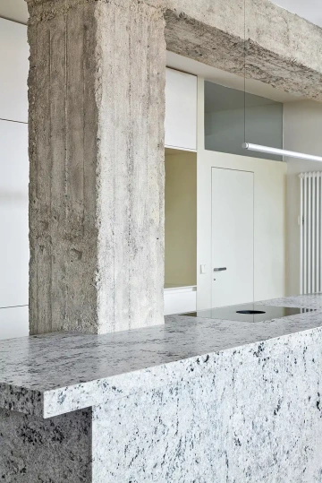 Prvním krokem bylo odstranění velké části příček a odhalení sloupů a průvlaků nosného systému. Mezi ně je přiznaně vložené nové členění a prvky, tvořící s původní betonovou konstrukcí prostorový dialog. Záměrně jsme nechali otevřený průhled už od vstupu až k protější fasádě pro vnímání celé hloubky bytu. Zachovali jsme jeden oddělený pokoj u uliční fasády, zbytek bytu je možné procházet dokola jako tzv obíhačku. Hlavní ložnice se nově přesunula k oknům do dvora a průchozí koupelnou je propojená i s obytným prostorem. Před ložnicí je pracovní koutek, který se dá oddělit posuvnou stěnou, ta zároveň může vymezit zádveří v předsíni anebo nechat oba průchody otevřené a tvořit jen pohledovou příčku. Do střední části dispozice jsme vložili nové jádro zahrnující kuchyni a dvě koupelny v návaznosti na původní stoupačky. V prostorné hale je přidaná i vestavná šatna. Obytnému prostoru dominuje dlouhý ostrůvek obložený kamenem, který tvoří středobod domácnosti.