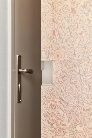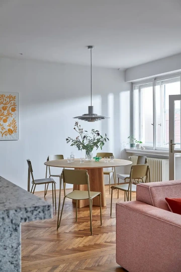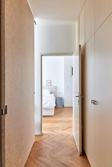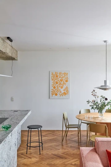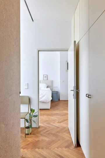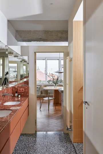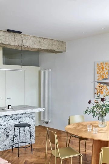 Materiálové řešení navazuje částečně na charakter celého domu. Středová vestavba s kuchyní je zcelena krémovou barevností, která odpovídá odstínu původních rámů oken a dveří a drží světlý dojem z prostoru. Vedle odhalených betonů pak materiálovou kombinaci oživuje zesvětlená kořenová dýha použitá na vestavnou šatnu a posuvnou stěnu. V koupelnách a předsíni se objevují další barevné akcenty, naopak na podlaze se opakuje dlažba z drceného kamene. Zbytek bytu propojuje parketová podlaha s tmavší barevností, která světlý prostor pocitově uzemňuje. Snaha byla zachovat aspoň část původních parket s typicky štíhlým formátem, v obytném prostoru se v nich přiznaně propisuje doplnění po zrušené příčce. Z původních charakteristických prvků se podařilo udržet a repasovat i některé původní dveře a kliky.