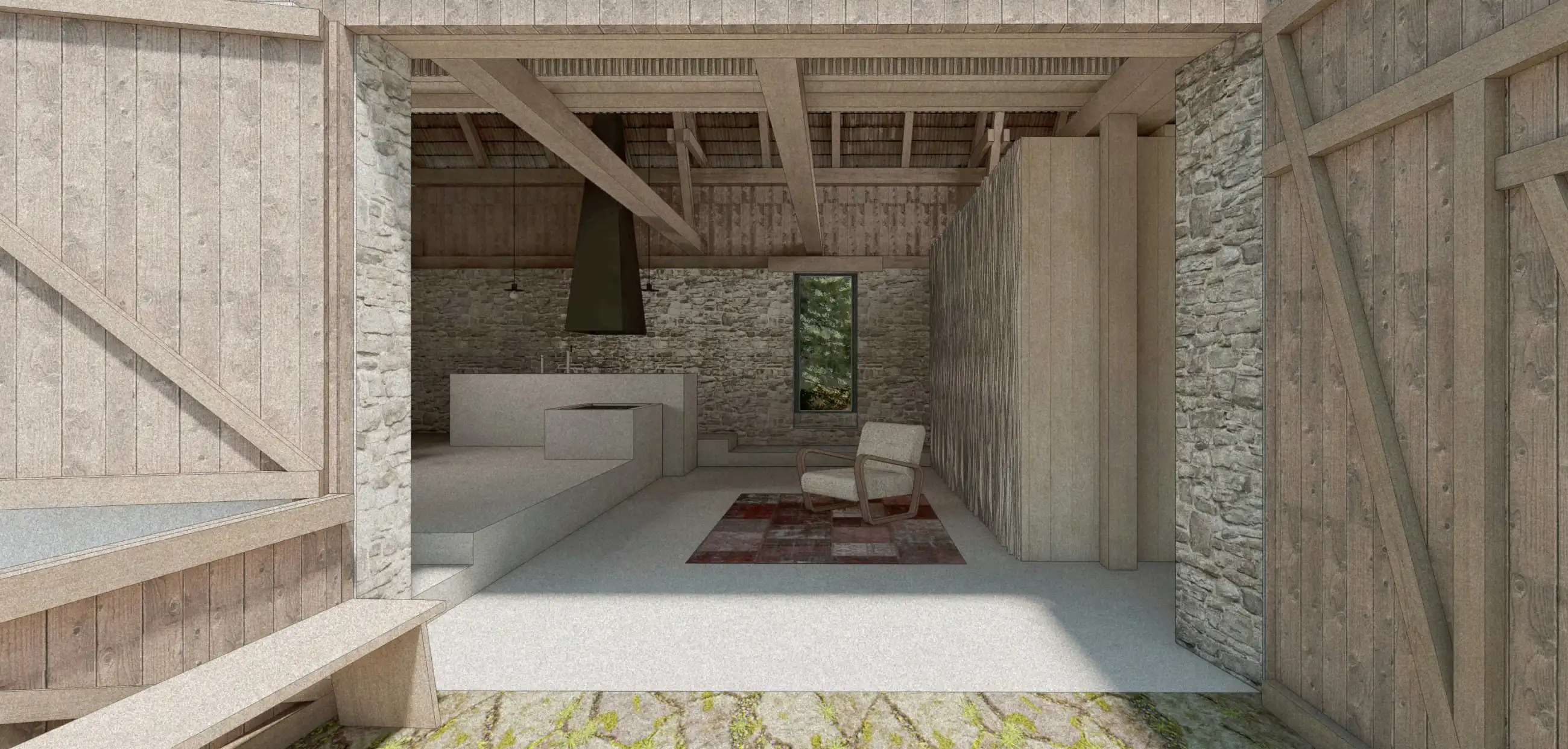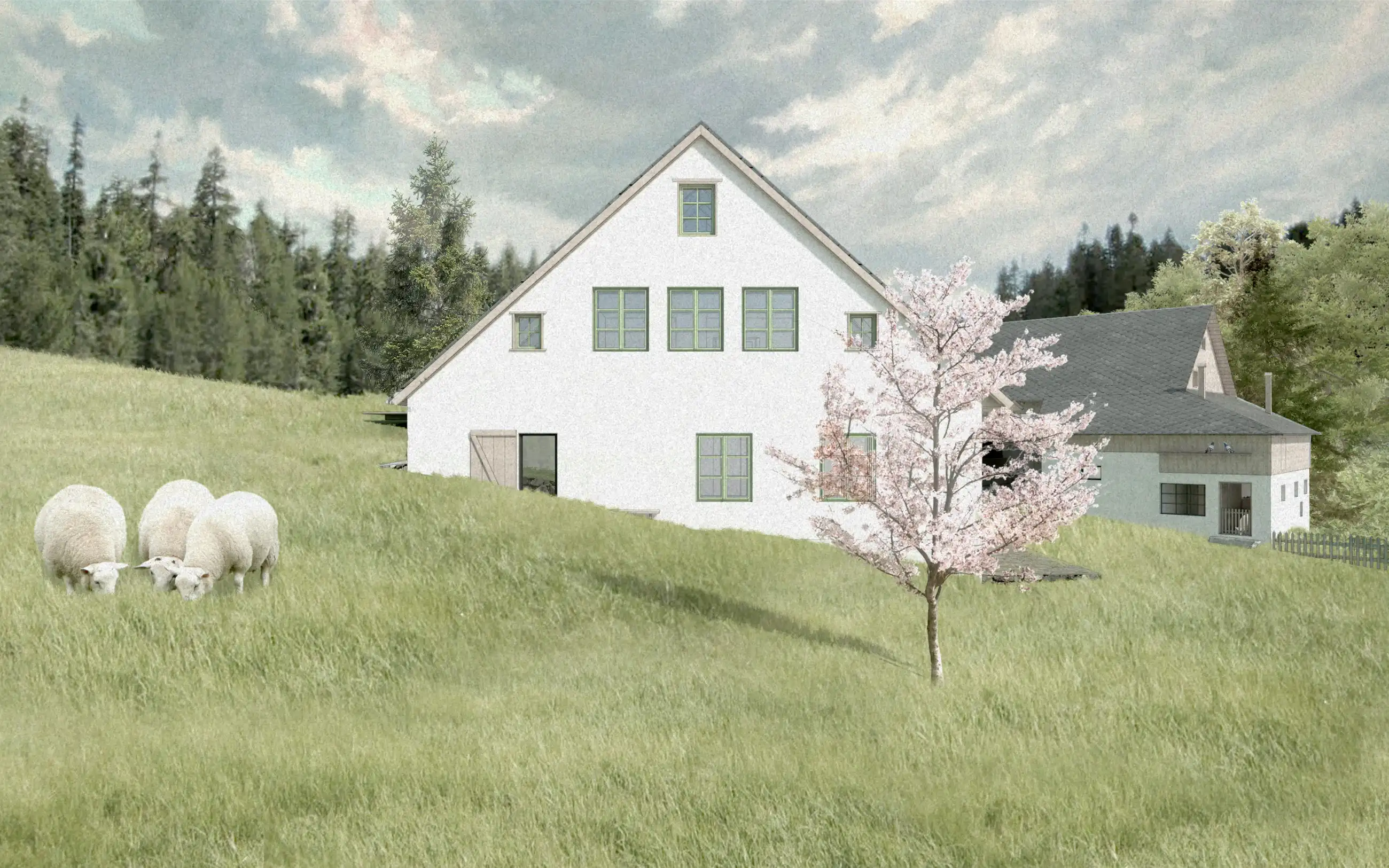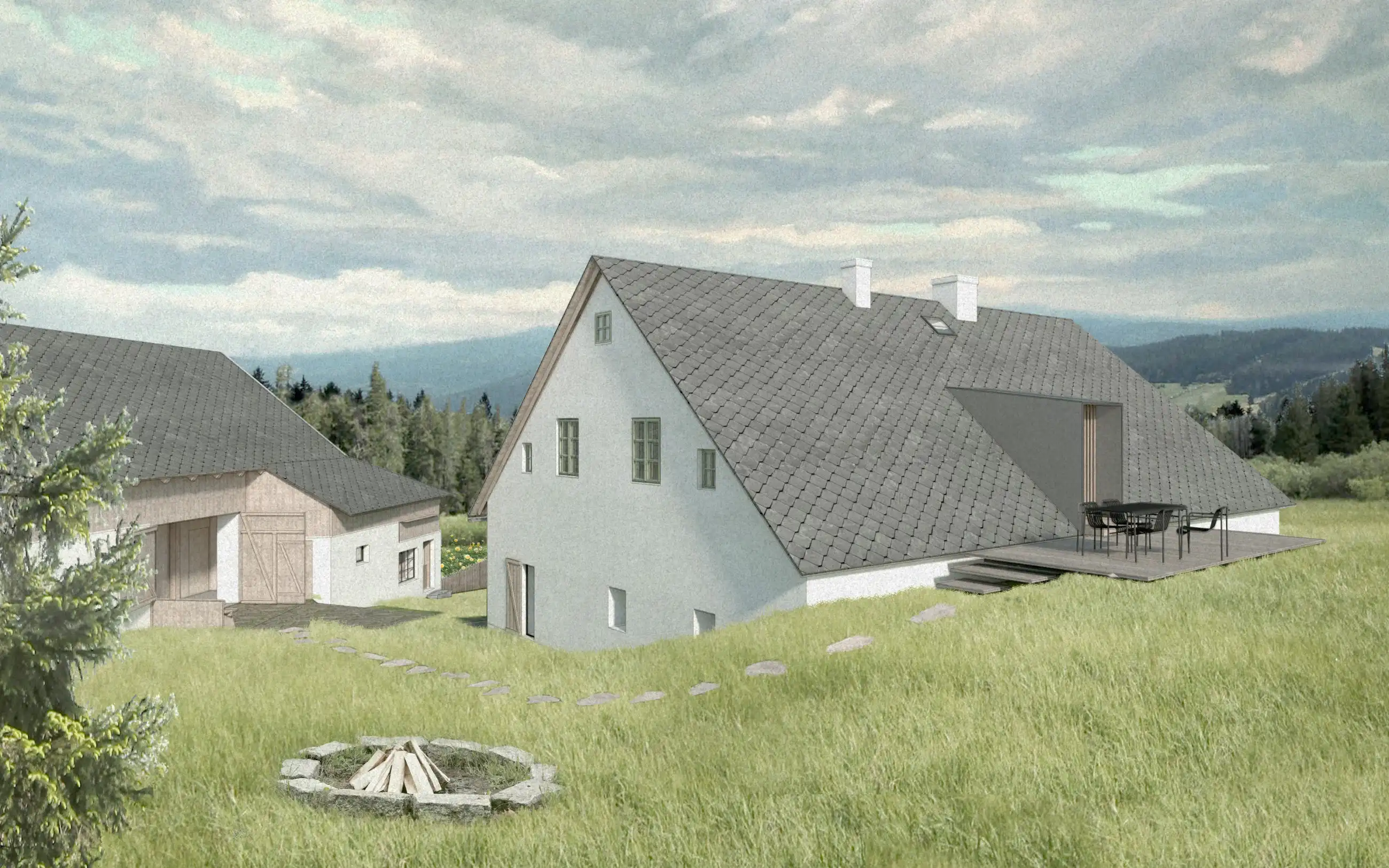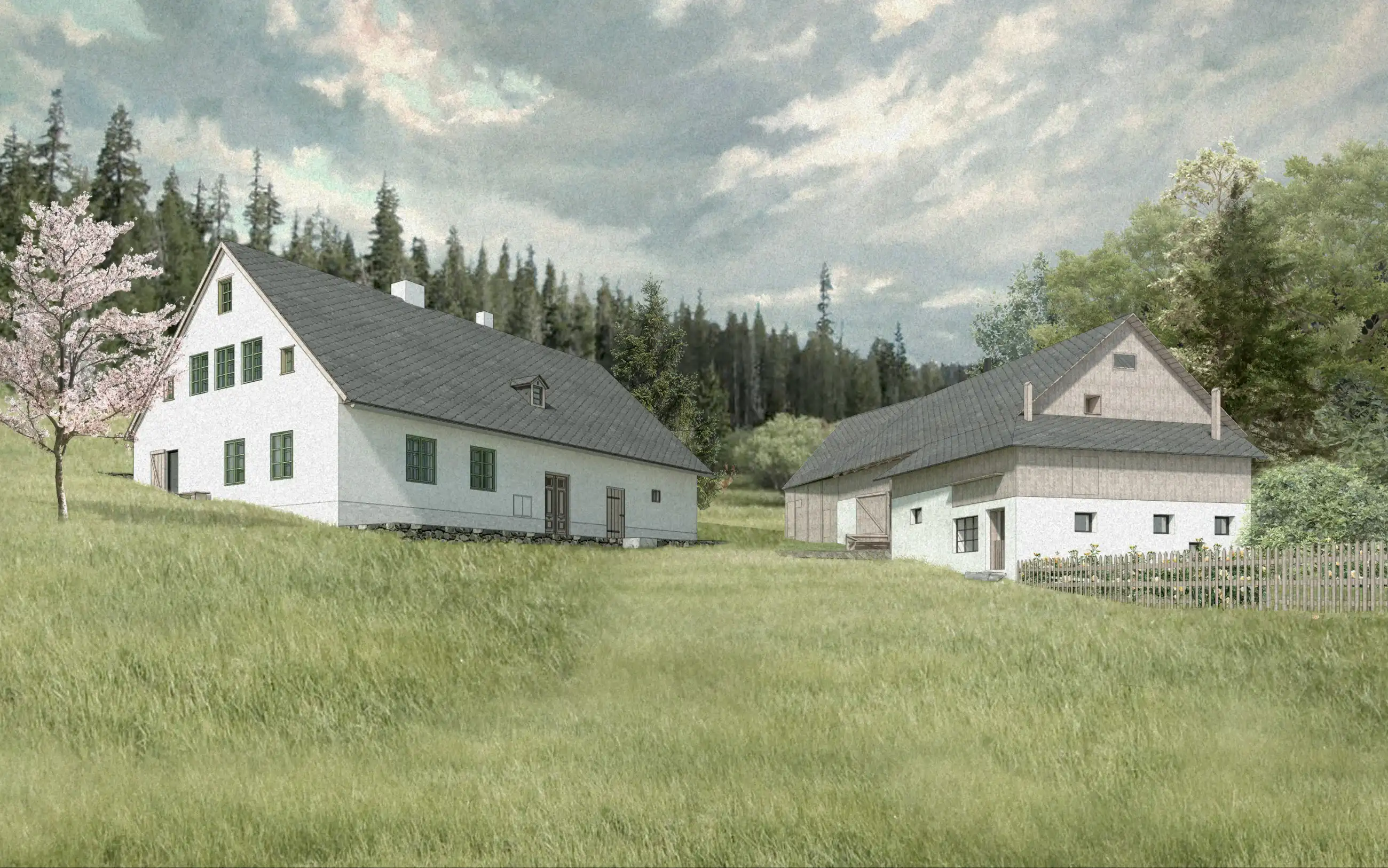 Usedlost zasazená v krásné přírodě šumavského podhůří, v malé obci, kde končí cesty v lesích a pár mohutných chalup ještě připomíná tradiční ráz šumavských roubených domů. Tuhle konkrétní usedlost sice poznamenalo několik radikálních přestaveb, i tak ale její půdorys a objem nese určité svědectví, které má smysl zachovat. Hospodářská část stodoly a chlévů byla proměněna v 80.letech nenávratně, návrh sem proto přináší už přiznaně současné dostavby. Skrz mírnou úpravu hmot a tvarování střech získává nový celek čistější výraz a nechává tak zároveň vyniknout přední části domu, kde se aspoň částečně dochoval historický charakter a konstrukce. Hlavní štít do návsi tak zachovává tradiční tvář, zatímco dostavba střední části se už otevírá velkorysým prosklením na výhledy do krajiny. Provozně jsou tyto části uvnitř propojené a nabízejí tak pestrou škálu prostorů jako zázemí pro rozvětvenou rodinu na rekreační pobyt, vnitřní členění umožňuje užívání domu v zónách podle obsazenosti. Nová dřevěná konstrukce stodoly drží její tradiční objem a uvnitř vytváří velkorysý otevřený prostor a kryté zázemí k posezení na terase nebo kolem otevřeného krbu a také nezávislý přístup do jednoho dalšího apartmánu.