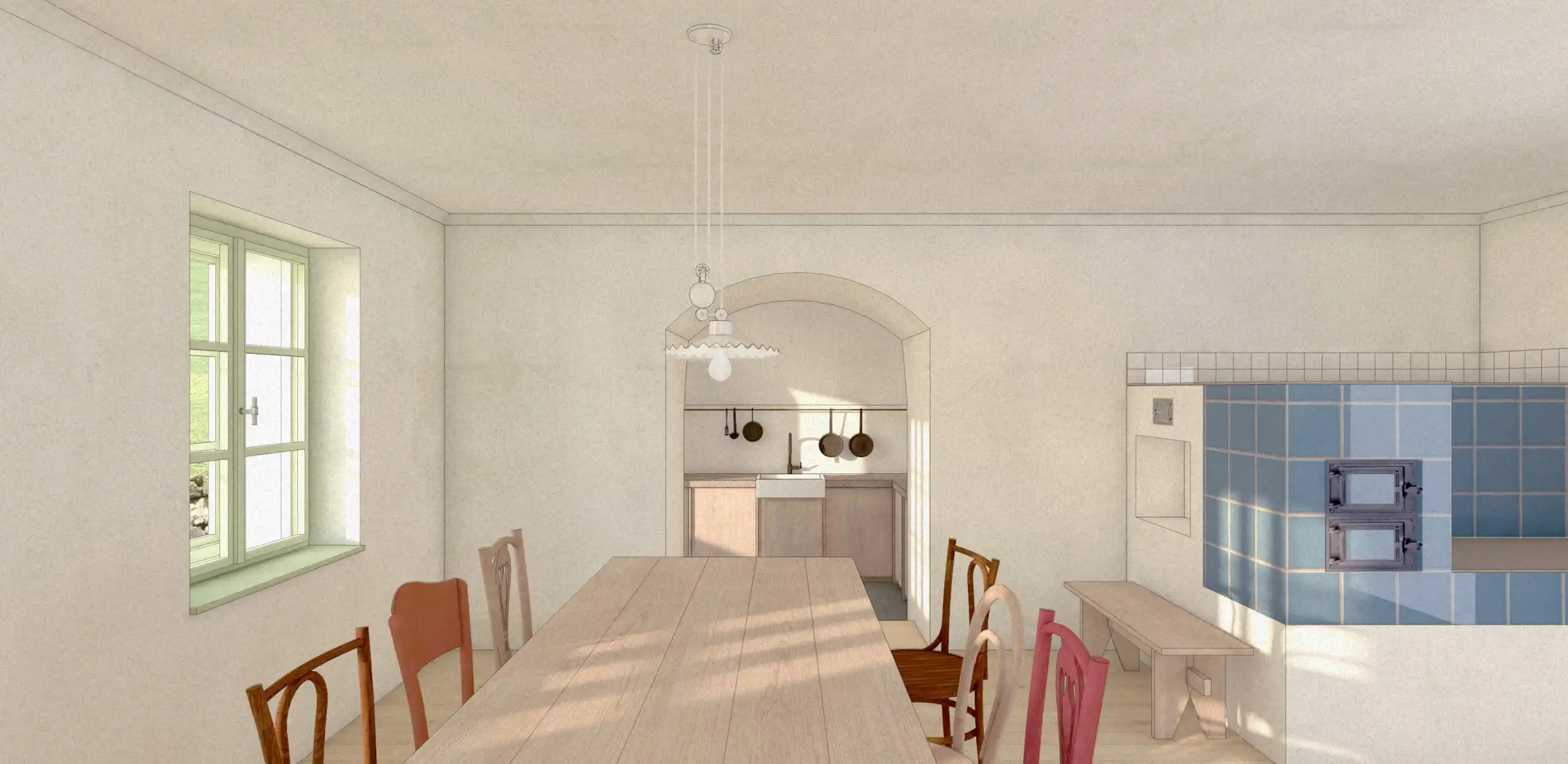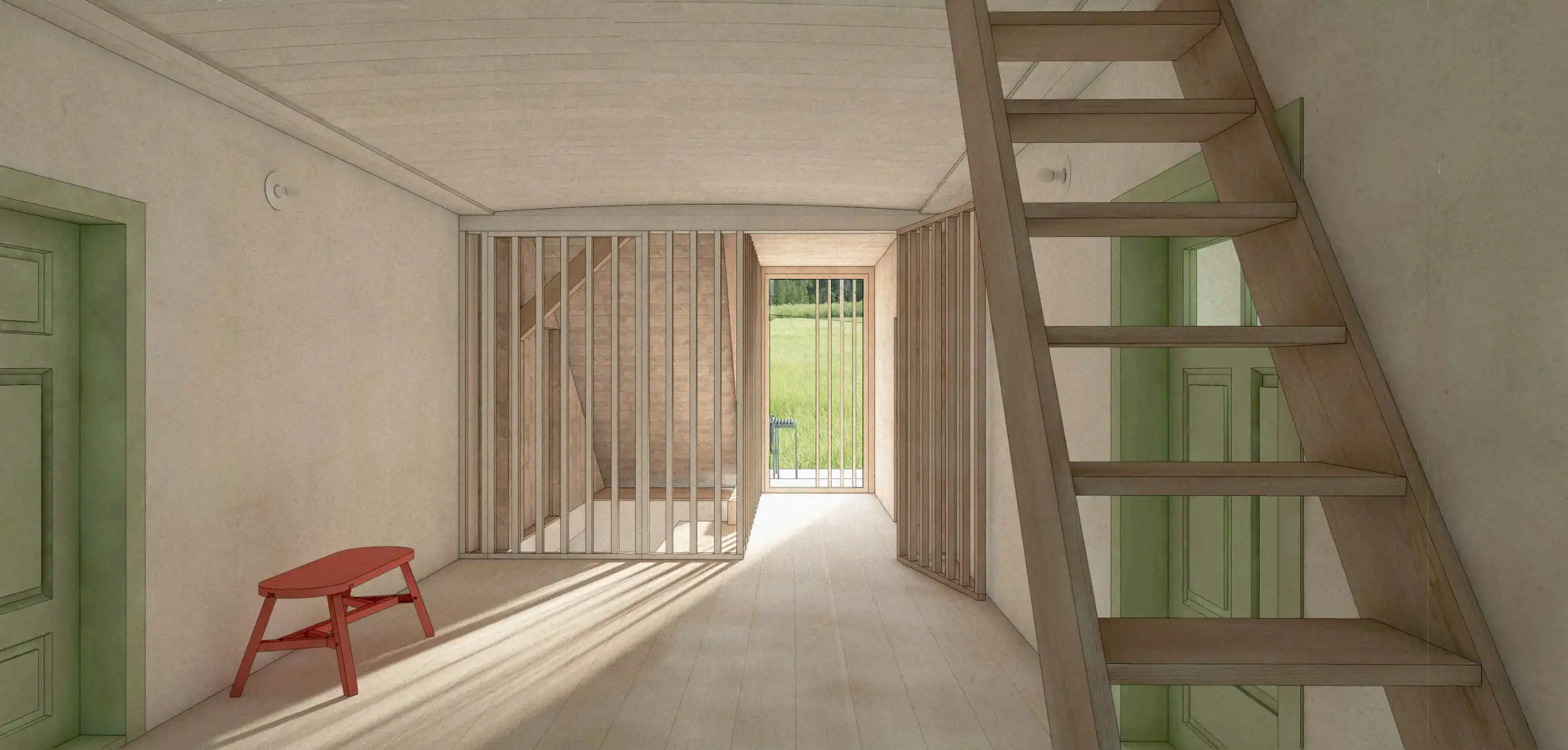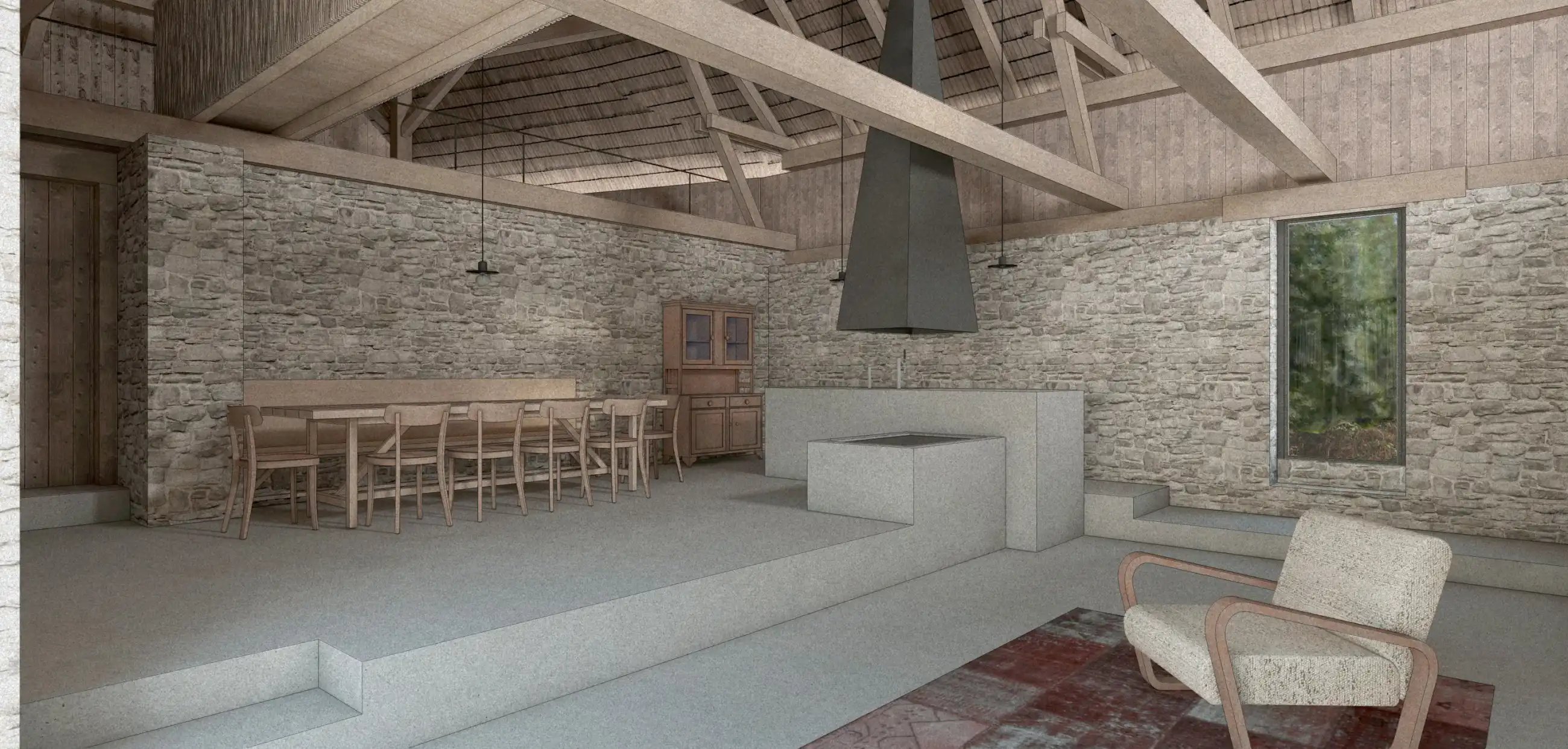 Usedlost zasazená v krásné přírodě šumavského podhůří, v malé obci, kde končí cesty v lesích a pár mohutných chalup ještě připomíná tradiční ráz šumavských roubených domů. Tuhle konkrétní usedlost sice poznamenalo několik radikálních přestaveb, i tak ale její půdorys a objem nese určité svědectví, které má smysl zachovat. Hospodářská část stodoly a chlévů byla proměněna v 80.letech nenávratně, návrh sem proto přináší už přiznaně současné dostavby. Skrz mírnou úpravu hmot a tvarování střech získává nový celek čistější výraz a nechává tak zároveň vyniknout přední části domu, kde se aspoň částečně dochoval historický charakter a konstrukce. Hlavní štít do návsi tak zachovává tradiční tvář, zatímco dostavba střední části se už otevírá velkorysým prosklením na výhledy do krajiny. Provozně jsou tyto části uvnitř propojené a nabízejí tak pestrou škálu prostorů jako zázemí pro rozvětvenou rodinu na rekreační pobyt, vnitřní členění umožňuje užívání domu v zónách podle obsazenosti. Nová dřevěná konstrukce stodoly drží její tradiční objem a uvnitř vytváří velkorysý otevřený prostor a kryté zázemí k posezení na terase nebo kolem otevřeného krbu a také nezávislý přístup do jednoho dalšího apartmánu.