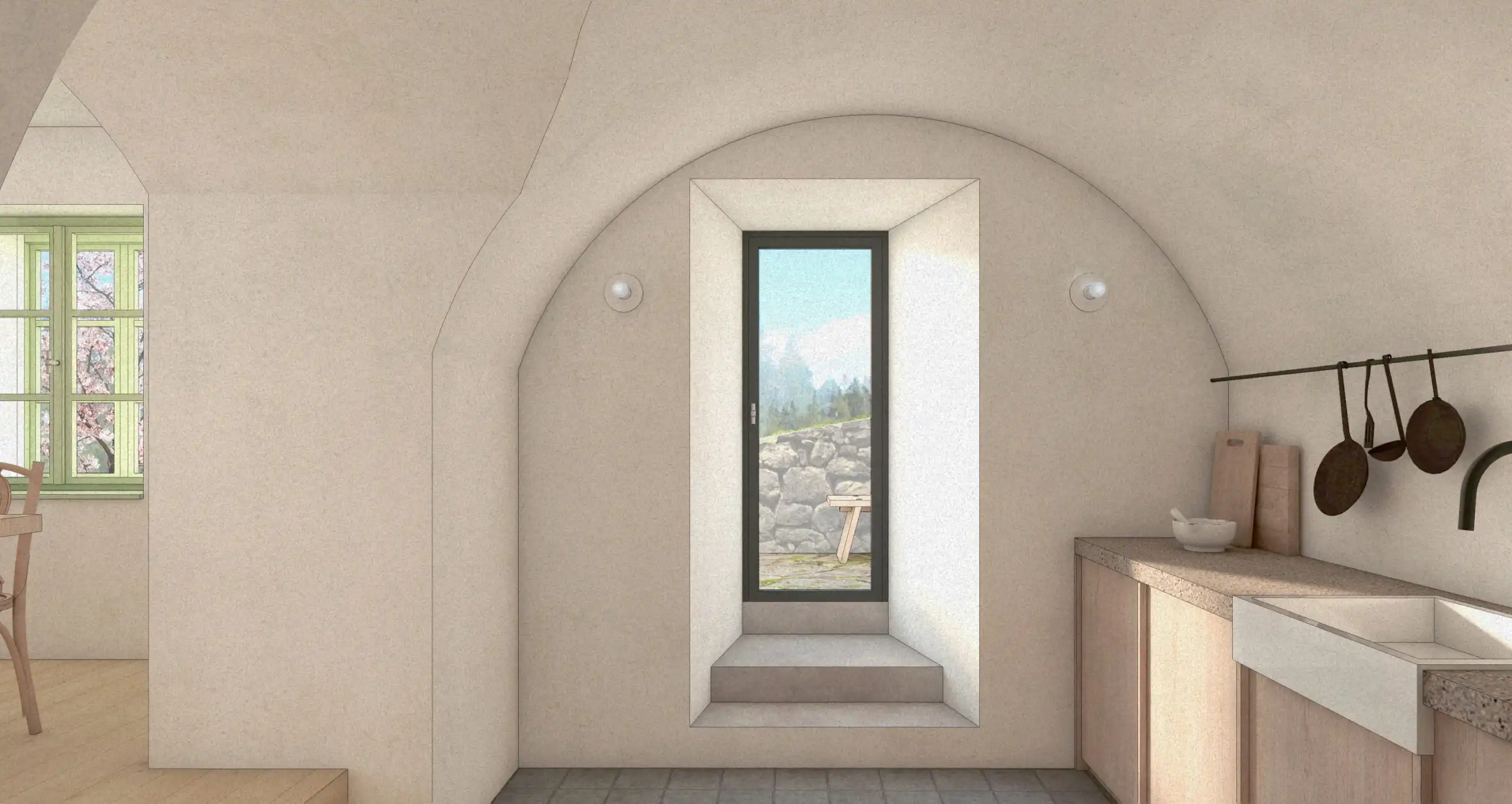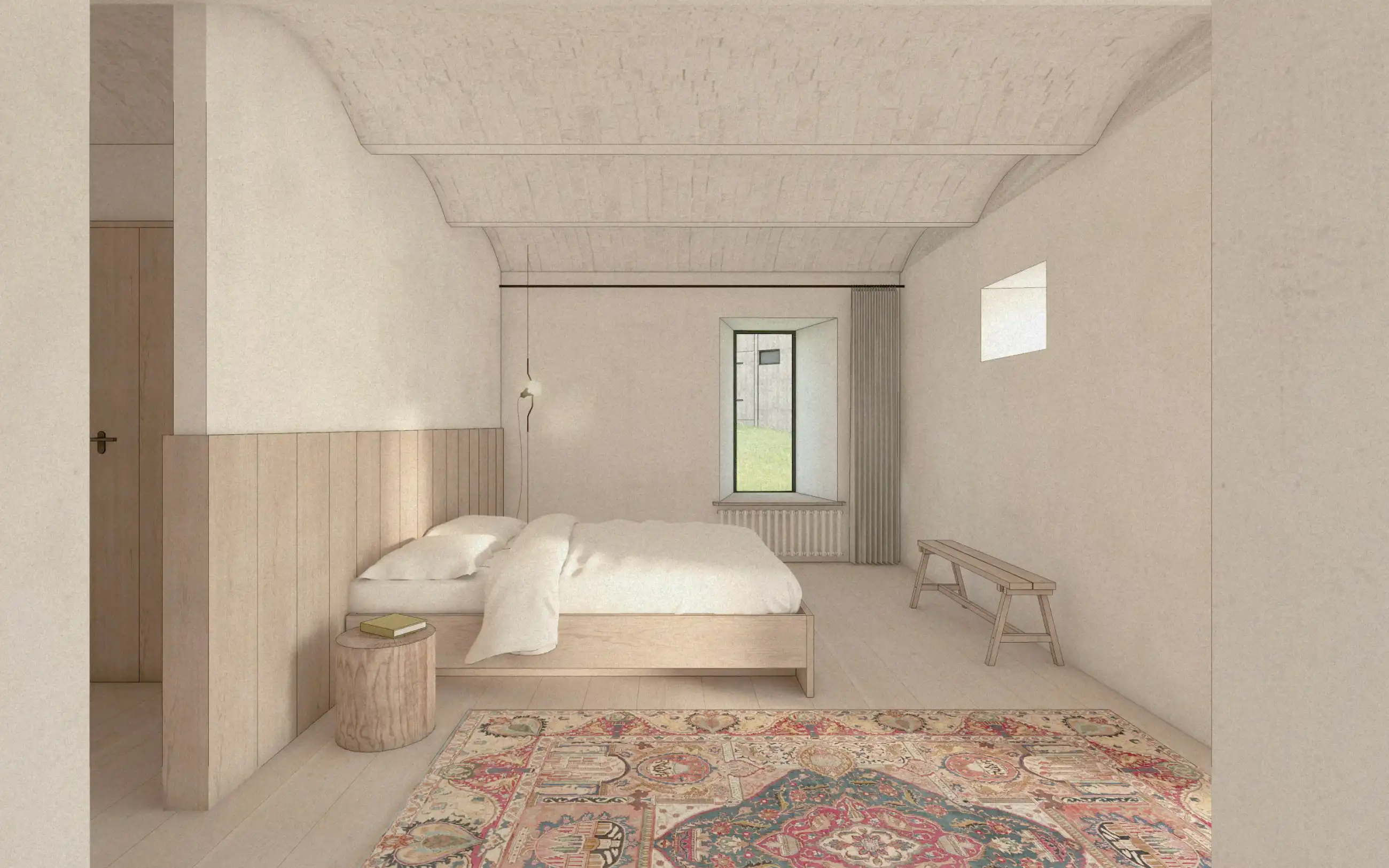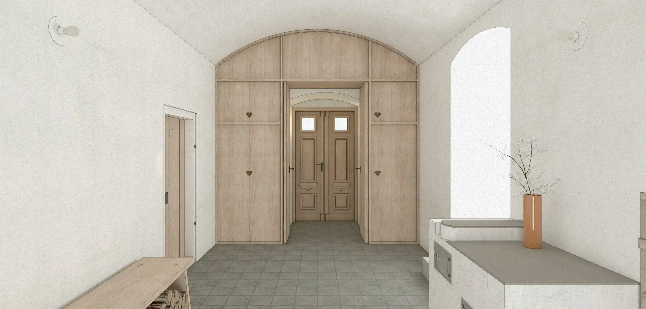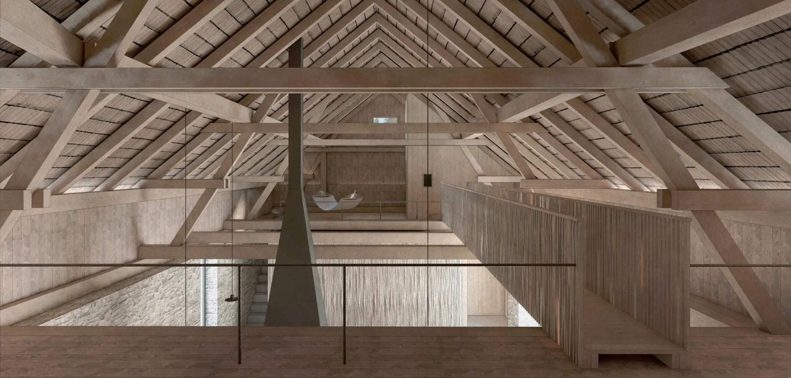 Usedlost zasazená v krásné přírodě šumavského podhůří, v malé obci, kde končí cesty v lesích a pár mohutných chalup ještě připomíná tradiční ráz šumavských roubených domů. Tuhle konkrétní usedlost sice poznamenalo několik radikálních přestaveb, i tak ale její půdorys a objem nese určité svědectví, které má smysl zachovat. Hospodářská část stodoly a chlévů byla proměněna v 80.letech nenávratně, návrh sem proto přináší už přiznaně současné dostavby. Skrz mírnou úpravu hmot a tvarování střech získává nový celek čistější výraz a nechává tak zároveň vyniknout přední části domu, kde se aspoň částečně dochoval historický charakter a konstrukce. Hlavní štít do návsi tak zachovává tradiční tvář, zatímco dostavba střední části se už otevírá velkorysým prosklením na výhledy do krajiny. Provozně jsou tyto části uvnitř propojené a nabízejí tak pestrou škálu prostorů jako zázemí pro rozvětvenou rodinu na rekreační pobyt, vnitřní členění umožňuje užívání domu v zónách podle obsazenosti. Nová dřevěná konstrukce stodoly drží její tradiční objem a uvnitř vytváří velkorysý otevřený prostor a kryté zázemí k posezení na terase nebo kolem otevřeného krbu a také nezávislý přístup do jednoho dalšího apartmánu.