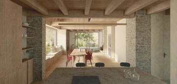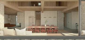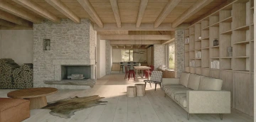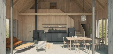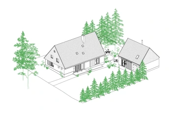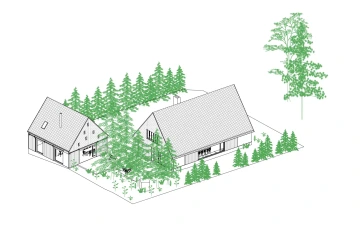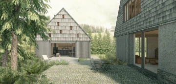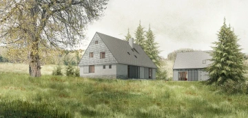 Skoro pohádkové místo, mezi svahy Krušných hor, mezi vsí a pastvinami – a téměř typická krušnohorská chalupa se stodolou bohužel v tak krušném stavu, že už nejdou zachránit. Návrh proto vzniká jako novostavba, nicméně drží původní malebné kompozice obou stavení včetně jejich půdorysné stopy a charakteristický objem střechy včetně jejího sklonu. Zůstává tak i poměr střechy vůči přízemí typický pro místní lidovou architekturu. Záměr je, aby novostavba v dálkových pohledech v krajině působila nerušivě, zatímco v přízemí se velkoryse otevírá a propojuje interiér s okolím. Proto i zvenku jsou materiály barevně sjednocené do tlumené šedé a rozehrané jen strukturou, zatímco vnitřky jsou víc hřejivé. Každé stavení má svůj charakter podle účelu, ale v obou je částečně převýšený prostor až k hřebeni střechy, v chalupě dokonce přes tři patra.