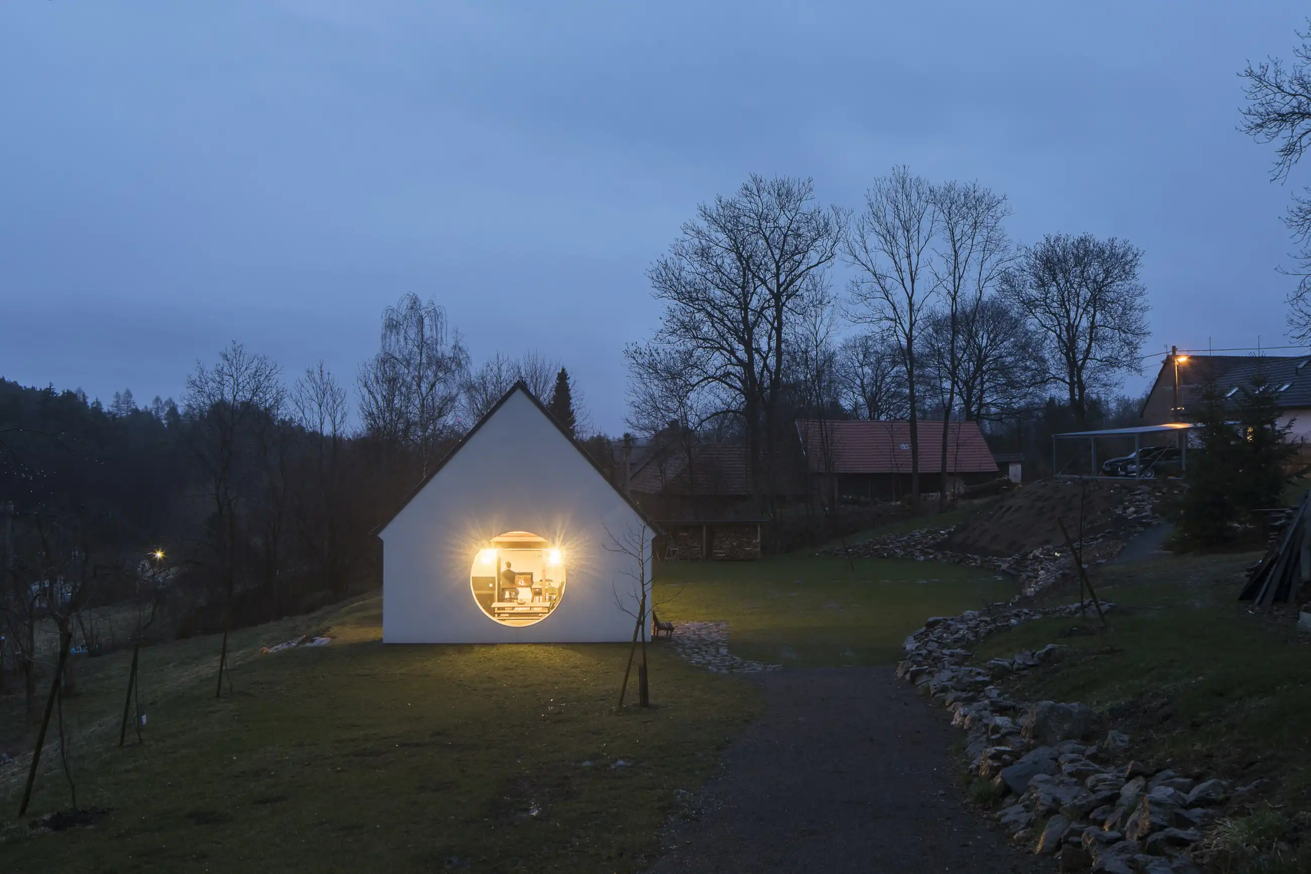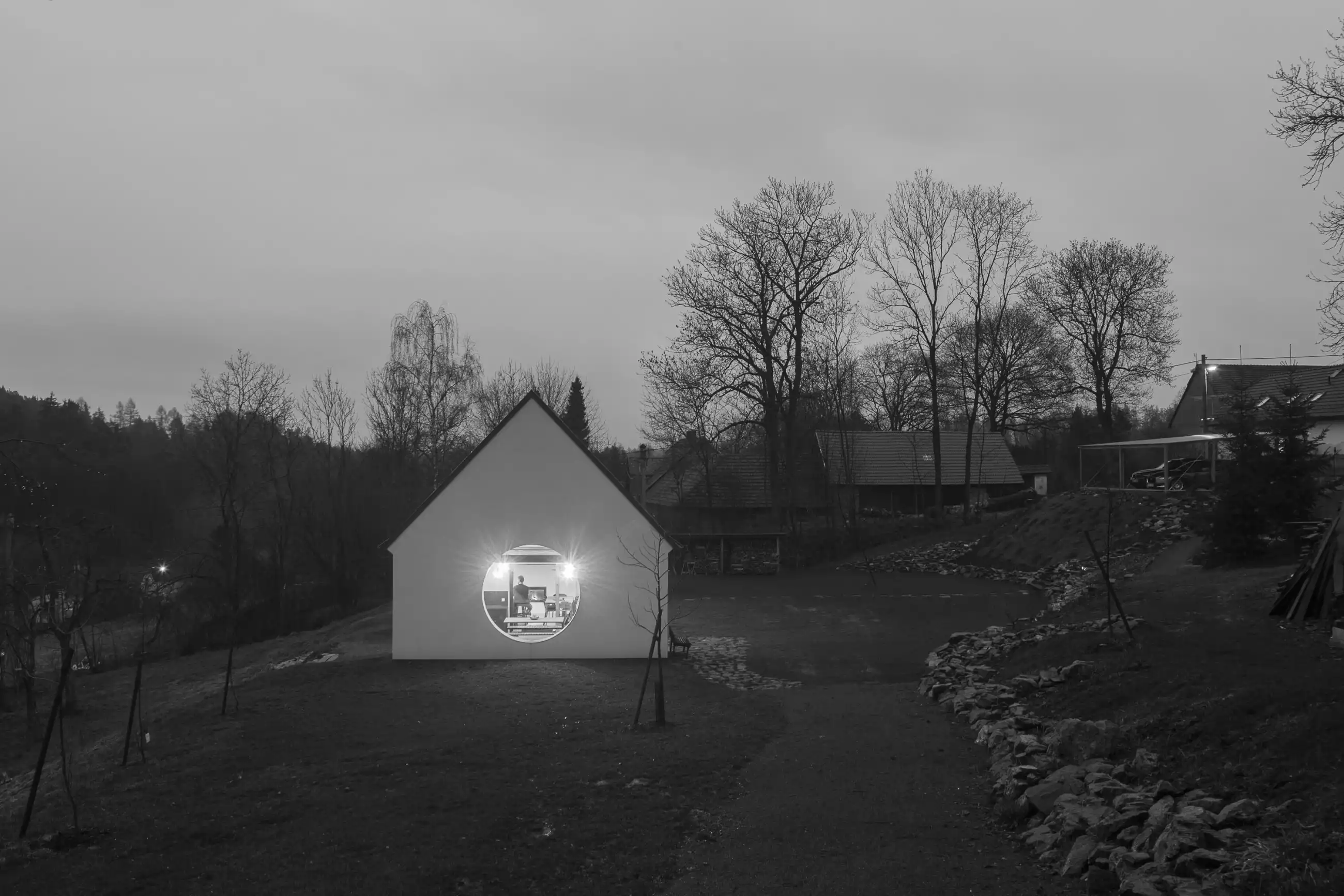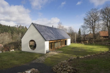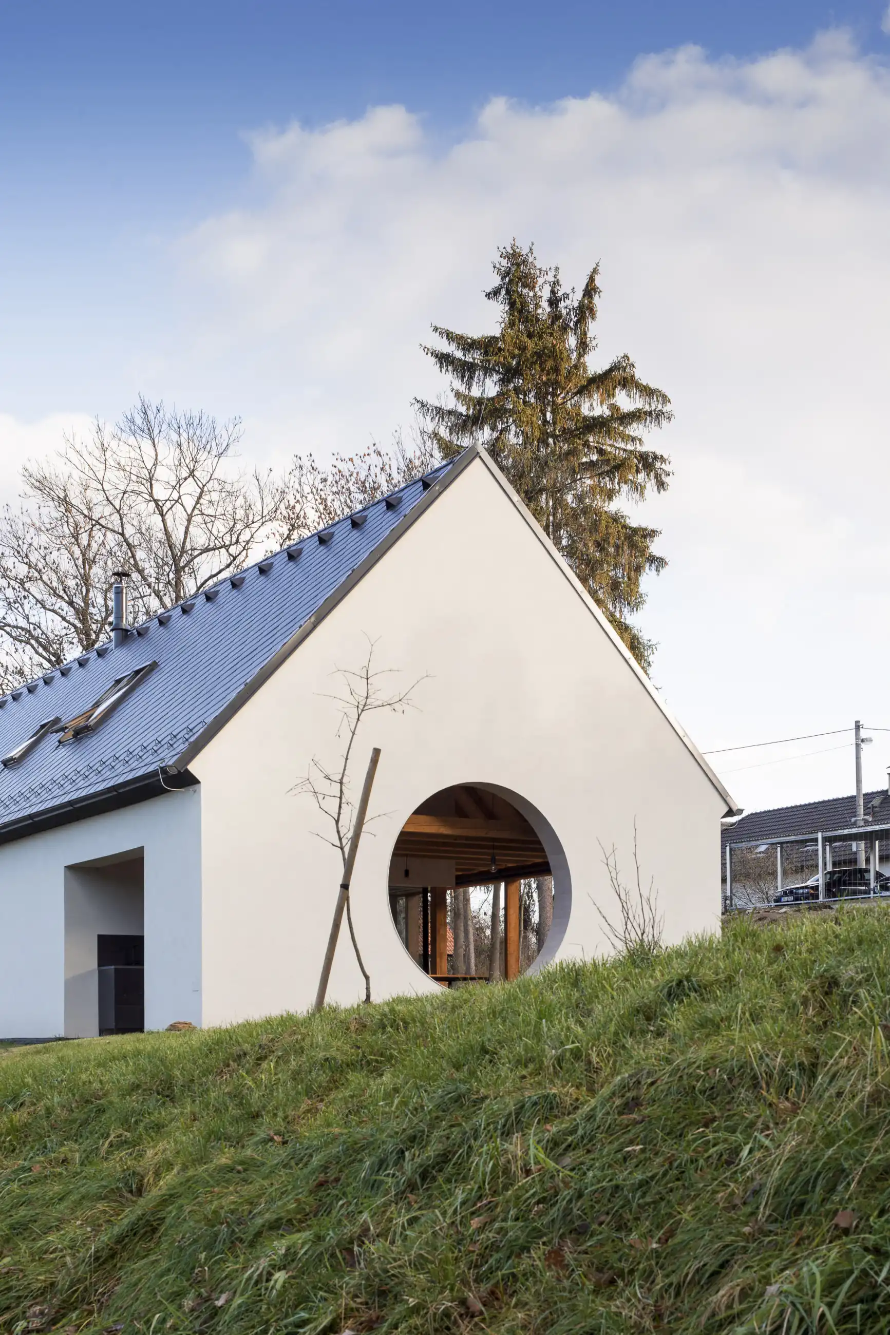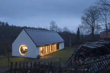 Dům s dírou. Dům, který pozoruje, některé možná i znervózňuje. Nicméně naplňuje přání investora, aby stavba sloužila i inspirovala něčím nad rámec nutného, navzdory velmi hlídanému rozpočtu. A taky přání nás architektů, aby dům byl zevnitř komplexní ač zvenku jednoduchý, současný a přitom zapadající do svého venkovského kontextu. Projekt začal se záměrem rekonstrukce staré chalupy se stodolou v malé vsi na rekreační objekt pro nyní už čtyřčlennou rodinu. Záhy se pro špatný stav obou staveb rozhodlo o demolici a novostavbě. Tu jsme umístili v téměř stejné pozici jako původní chalupu, usazenou podélně v severním svahu, orientovanou nejvíce na jih, zapuštěnou oproti příjezdové cestě. Naším primárním záměrem bylo i při novostavbě udržet určitý venkovský ráz a s tím protáhlou proporci a větší objem, než by s ohledem na zadání a omezený rozpočet stačilo. Návrh to řeší vkládáním prázdného prostoru, kterým vyplňuje zvolený objem. Na zateplený interiér domu proto navazuje venkovní krytá terasa, důležitá součást zadání, pod jednou průběžnou střechou. Terasa se otevírá až nahoru do krovu a ve štítové stěně skrz velký kruhový otvor, který dodává domu abstraktní tvář, velkorysost i intimitu. Na terasu navazuje na podélné straně zapuštěné zápraží, poskytující stínění i krytou předvstupní zónu. Díky dlouhému prosklení přes roh jsou terasa i zápraží vnímané jako součást interiéru. Ten zůstává v ploše i standardu úsporný, nicméně prostorově bohatý díky průhledům, zrcadlení i částečnému převýšení.