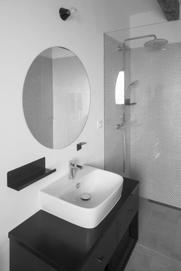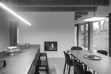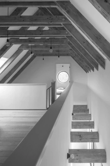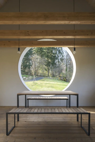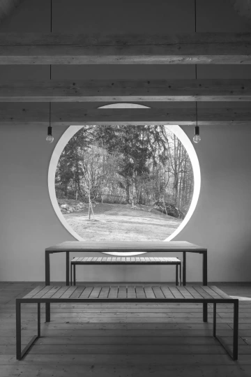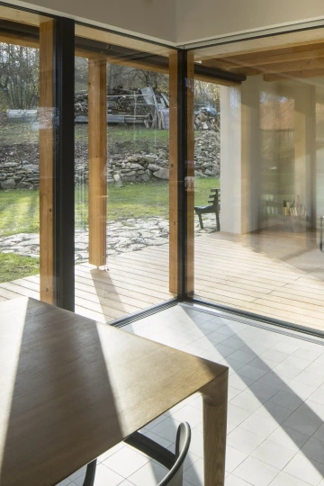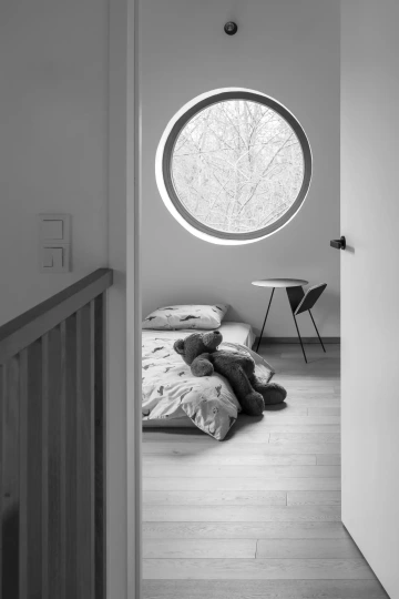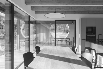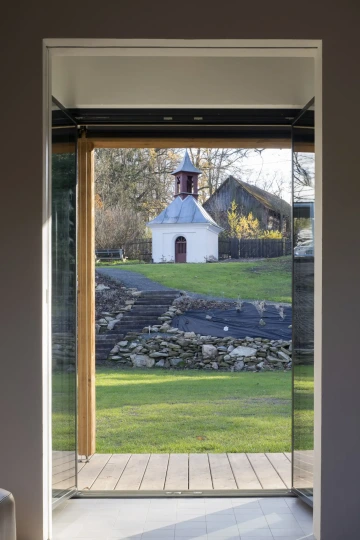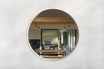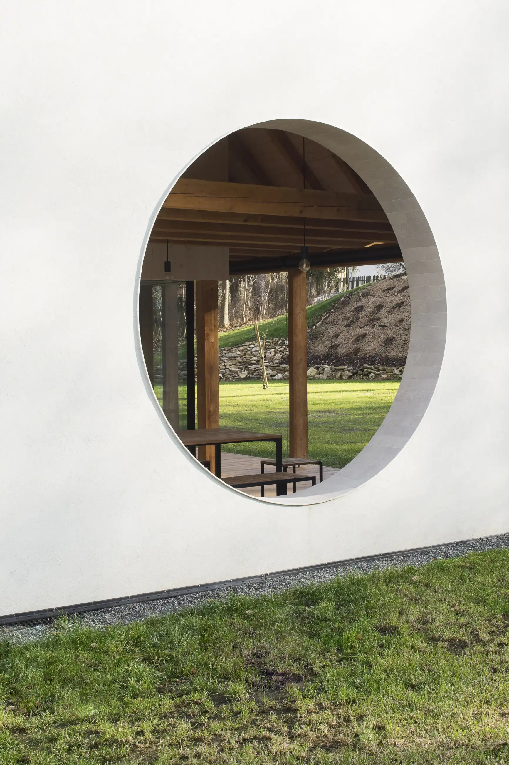 Dům s dírou. Dům, který pozoruje, některé možná i znervózňuje. Nicméně naplňuje přání investora, aby stavba sloužila i inspirovala něčím nad rámec nutného, navzdory velmi hlídanému rozpočtu. A taky přání nás architektů, aby dům byl zevnitř komplexní ač zvenku jednoduchý, současný a přitom zapadající do svého venkovského kontextu. Projekt začal se záměrem rekonstrukce staré chalupy se stodolou v malé vsi na rekreační objekt pro nyní už čtyřčlennou rodinu. Záhy se pro špatný stav obou staveb rozhodlo o demolici a novostavbě. Tu jsme umístili v téměř stejné pozici jako původní chalupu, usazenou podélně v severním svahu, orientovanou nejvíce na jih, zapuštěnou oproti příjezdové cestě. Naším primárním záměrem bylo i při novostavbě udržet určitý venkovský ráz a s tím protáhlou proporci a větší objem, než by s ohledem na zadání a omezený rozpočet stačilo. Návrh to řeší vkládáním prázdného prostoru, kterým vyplňuje zvolený objem. Na zateplený interiér domu proto navazuje venkovní krytá terasa, důležitá součást zadání, pod jednou průběžnou střechou. Terasa se otevírá až nahoru do krovu a ve štítové stěně skrz velký kruhový otvor, který dodává domu abstraktní tvář, velkorysost i intimitu. Na terasu navazuje na podélné straně zapuštěné zápraží, poskytující stínění i krytou předvstupní zónu. Díky dlouhému prosklení přes roh jsou terasa i zápraží vnímané jako součást interiéru. Ten zůstává v ploše i standardu úsporný, nicméně prostorově bohatý díky průhledům, zrcadlení i částečnému převýšení.