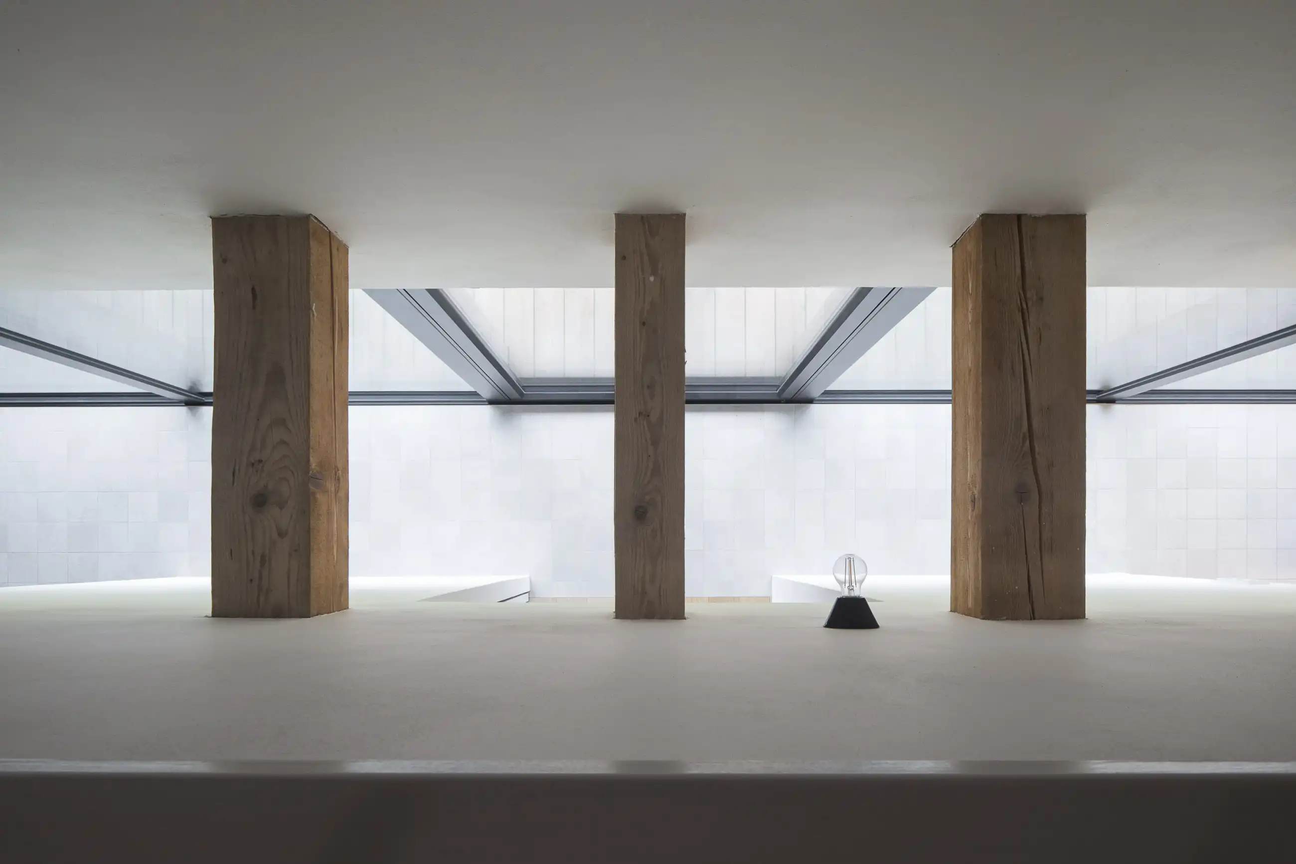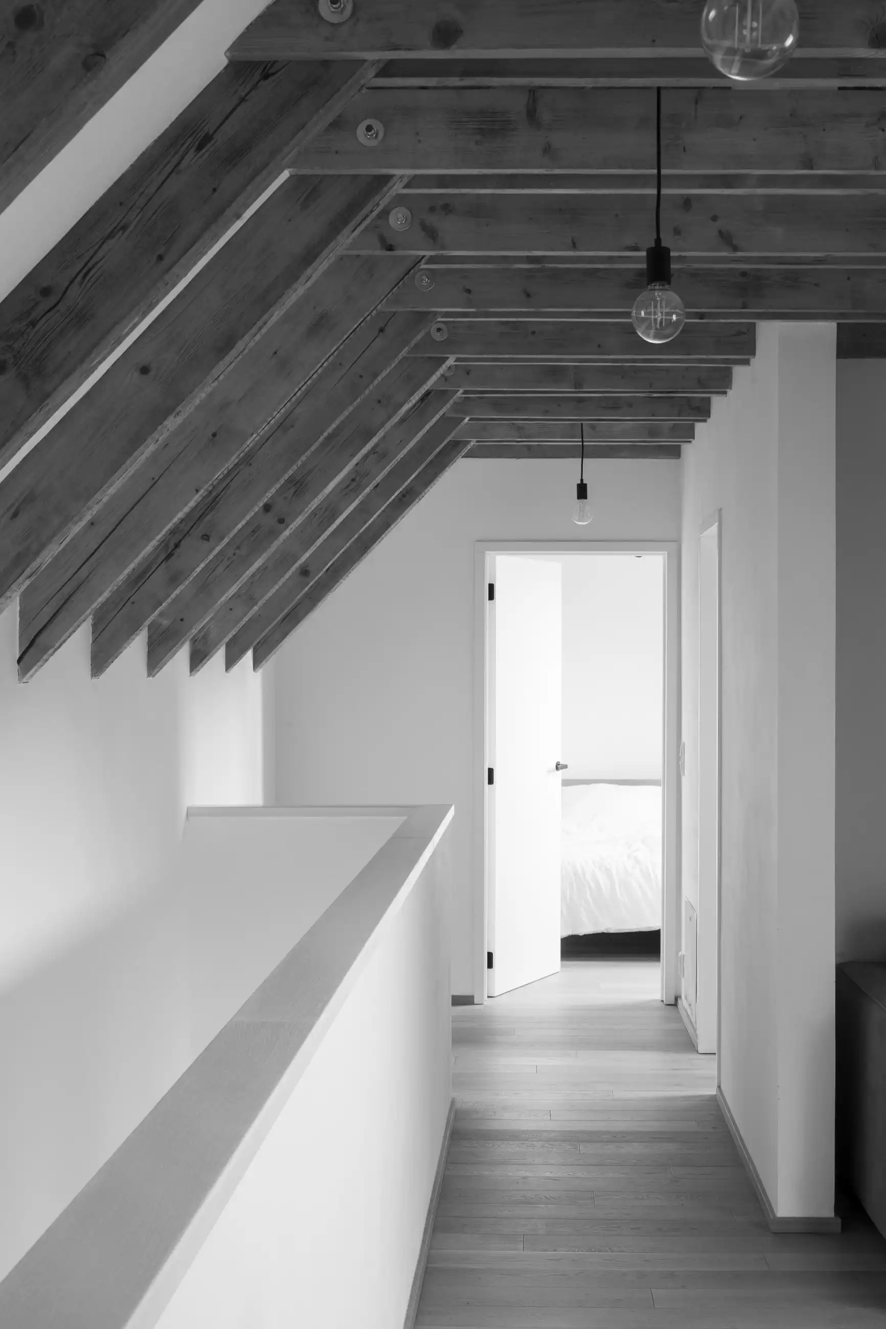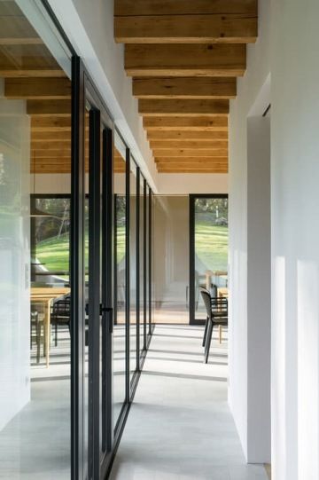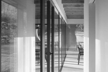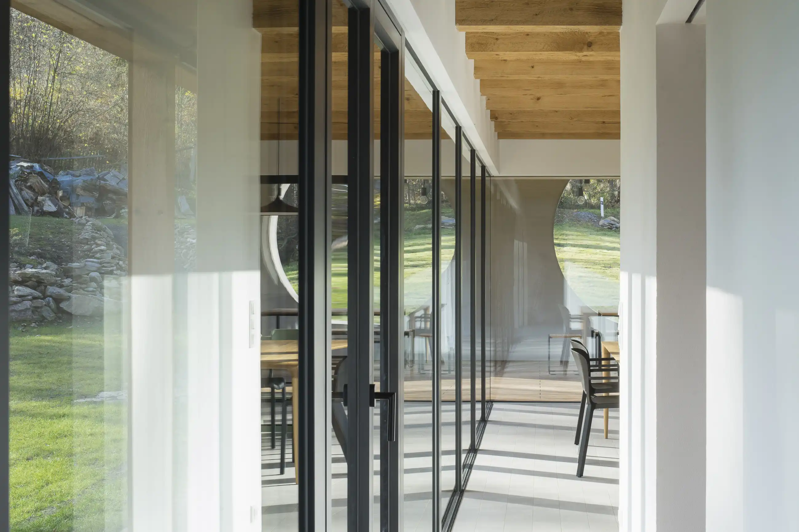 Dispozice a materiály podporují koncept vrstvení prostorů – vnější objem v omítce, v něm dřevěný krytý prostor, za ním omítané vnitřní stěny a uprostřed přízemí klubovna s krbem, knihovnou a dřevěnou podlahou jako nejintimější prostor domu. Chodba podél zápraží zůstává převýšená do šikminy v podkroví a přináší tím nahoru nepřímé prosvětlení i vizuální kontakt. Ačkoliv dům působí zvenku celkem objemný, uvnitř zůstává relativně malý a kompaktní – čímž vyhovuje i majitelům, kteří ve svém druhém domově chtěli být primárně spolu pohromadě a blízko přírodě.