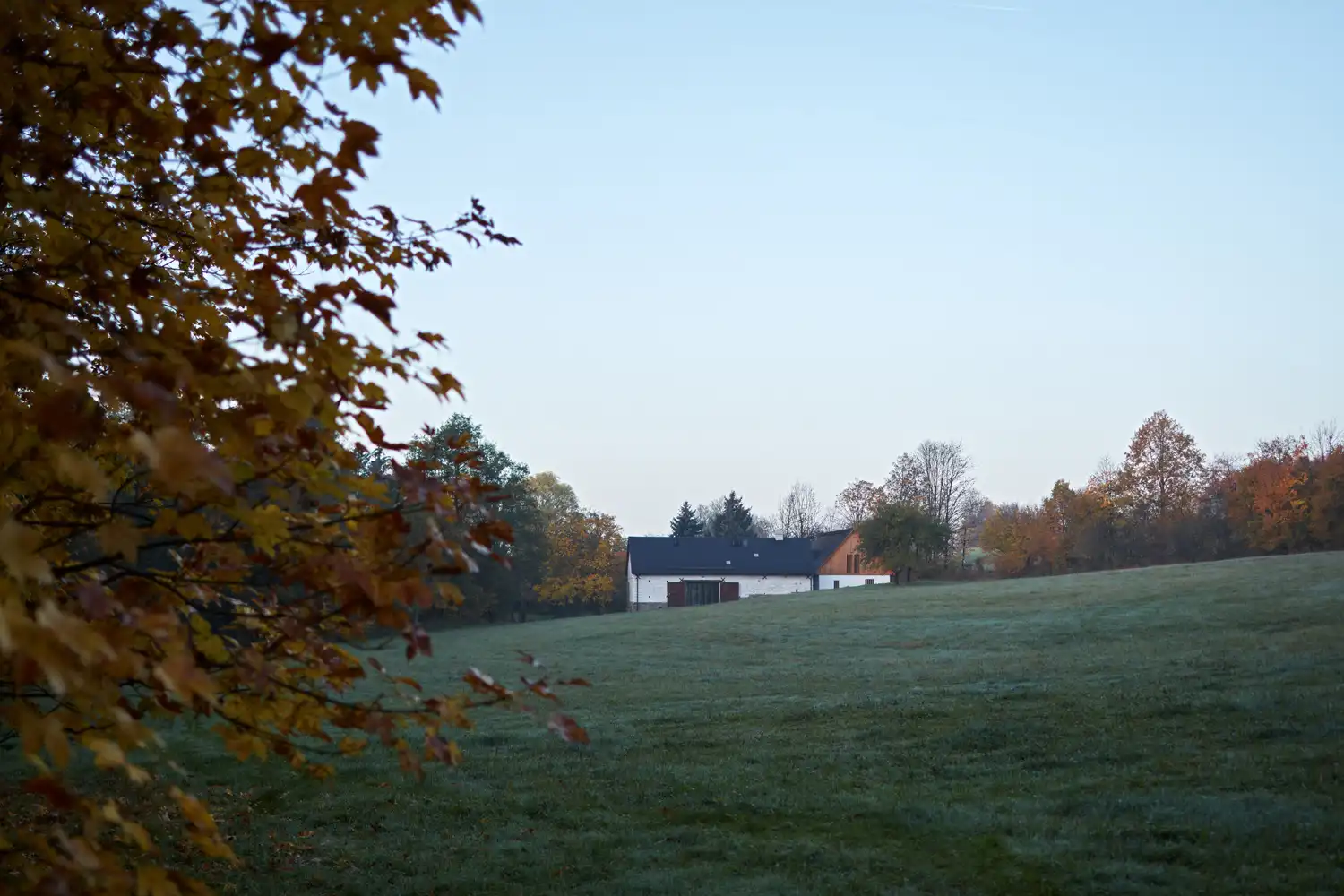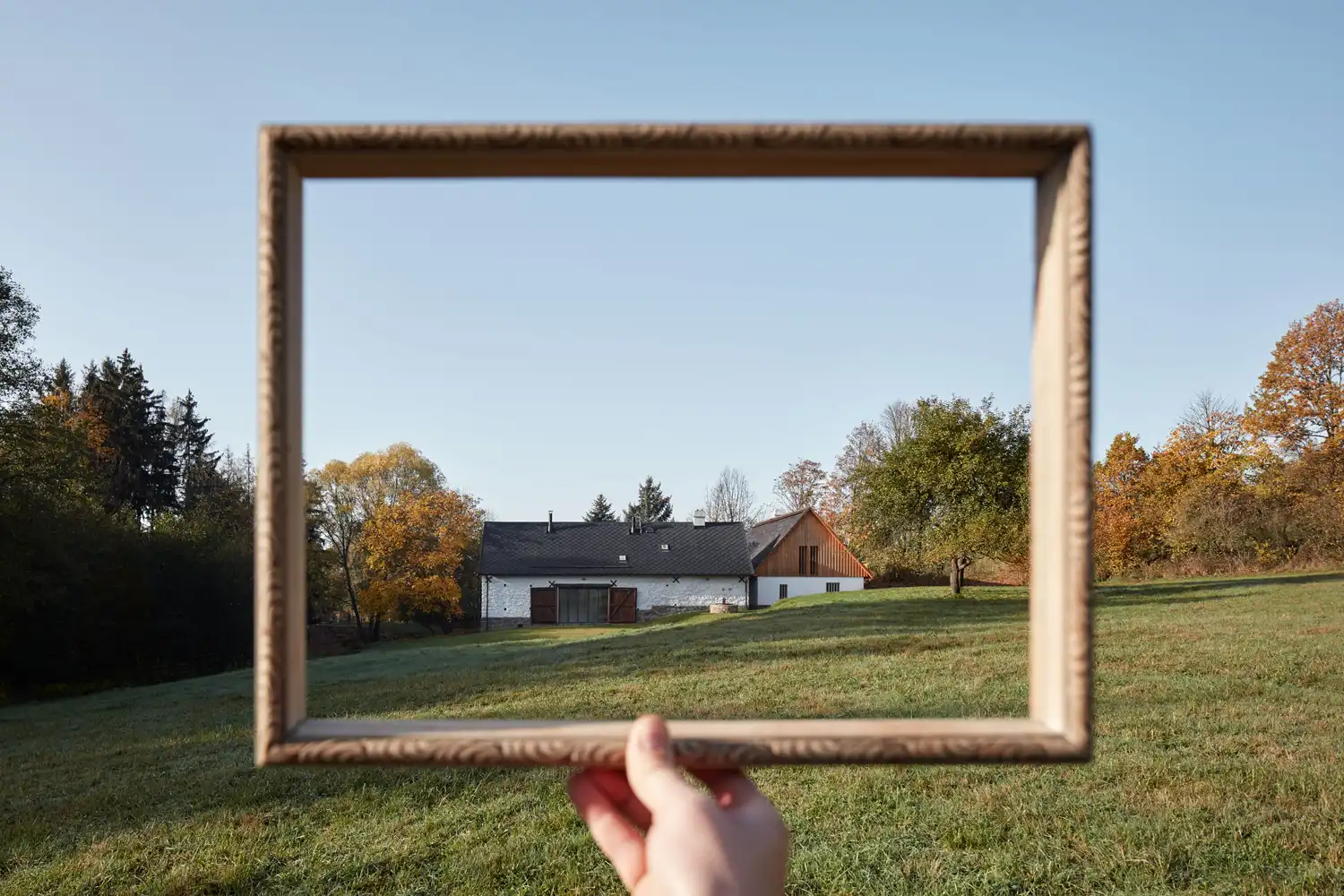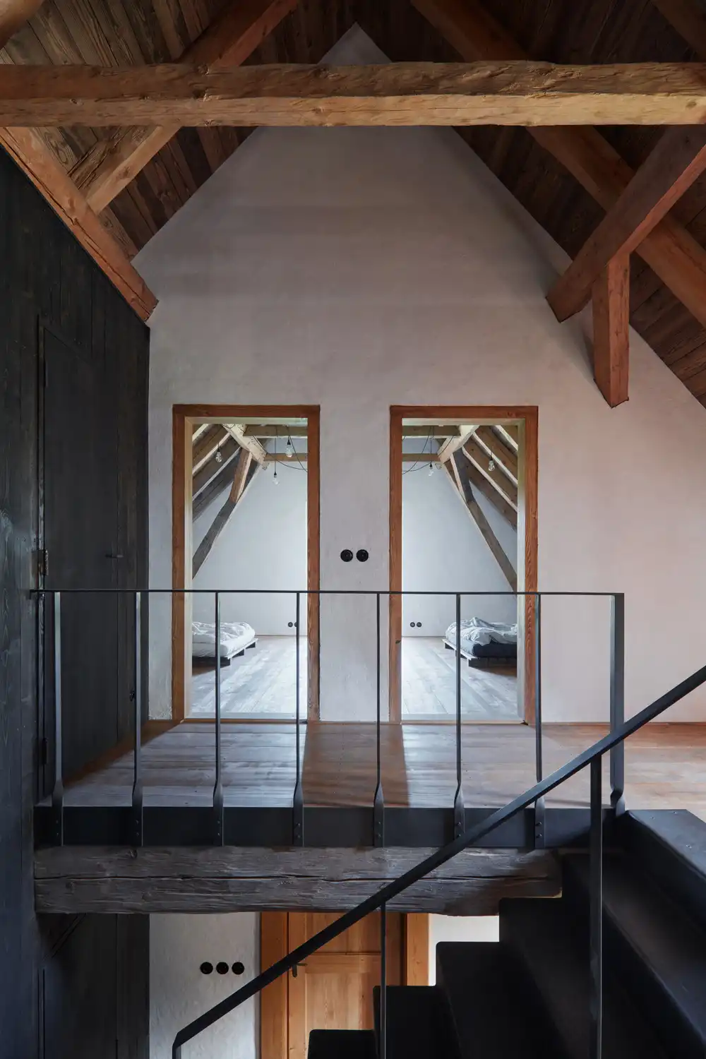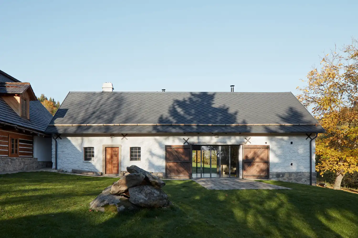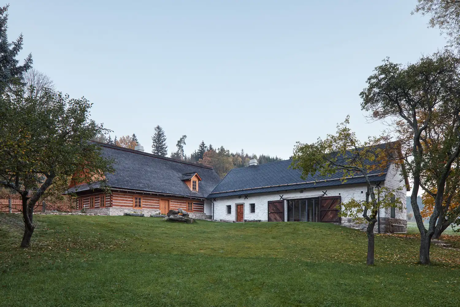 Původní usedlost stojící téměř na samotě zahrnovala dva domy umístěné do tvaru L – chalupu a stodolu, harmonicky posazené do svažité louky. Jejich soulad s okolím jsme se snažili nenarušit, proto obě stavby zůstaly zvenku víceméně v původní podobě, změny se dějí spíš uvnitř. Hlavní obytné prostory se otevřely až do krovu, aby vyniknul specifický prvek každého stavení - v chalupě černá kuchyně, ve stodole průhled skrz původní vrata. V obou je navíc vložený černý "komín", který skrývá hygienické zázemí a nese schody do patra. Ve stodole se tato vestavba tyčí jako dominanta, v chalupě je naschvál nenápadná.