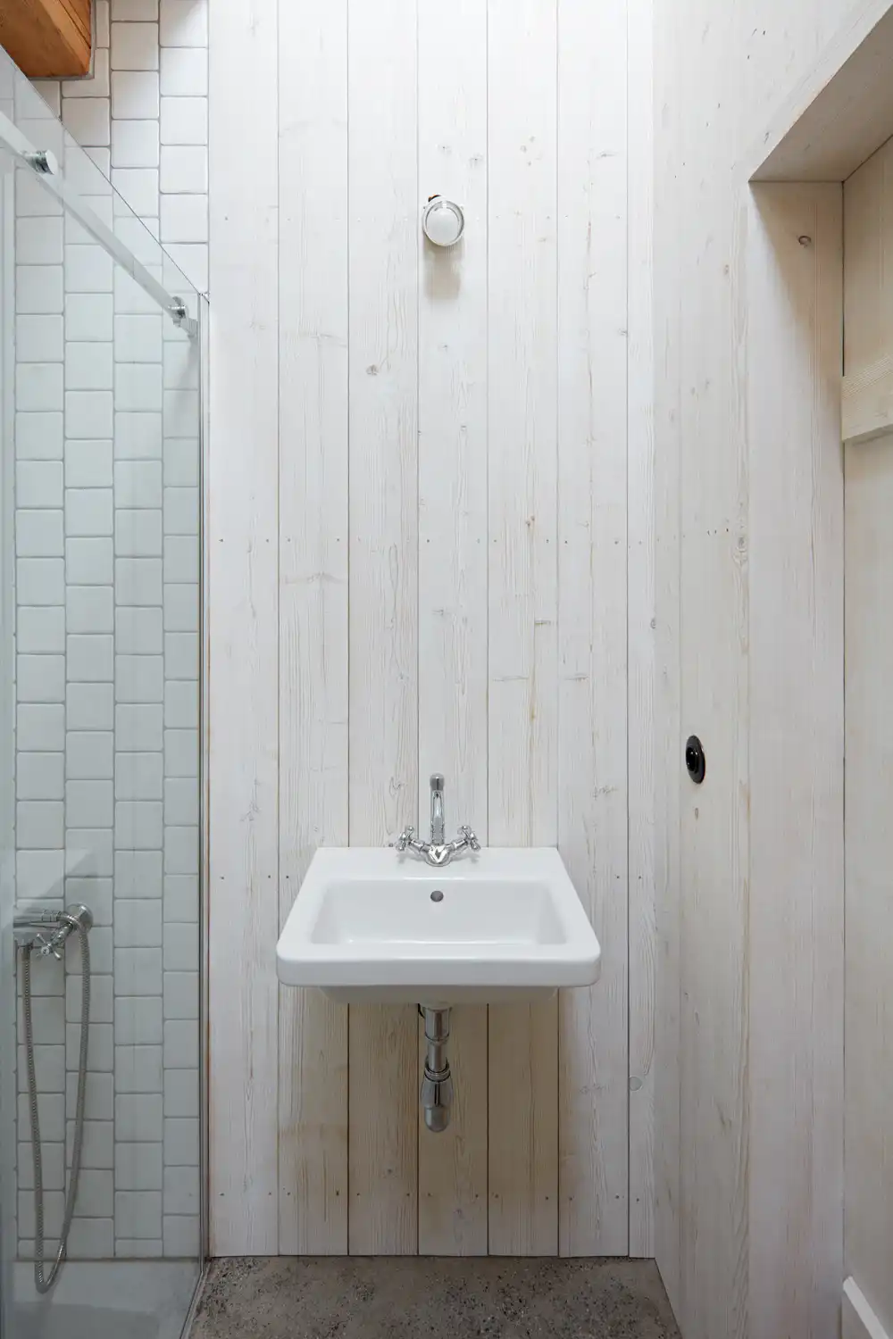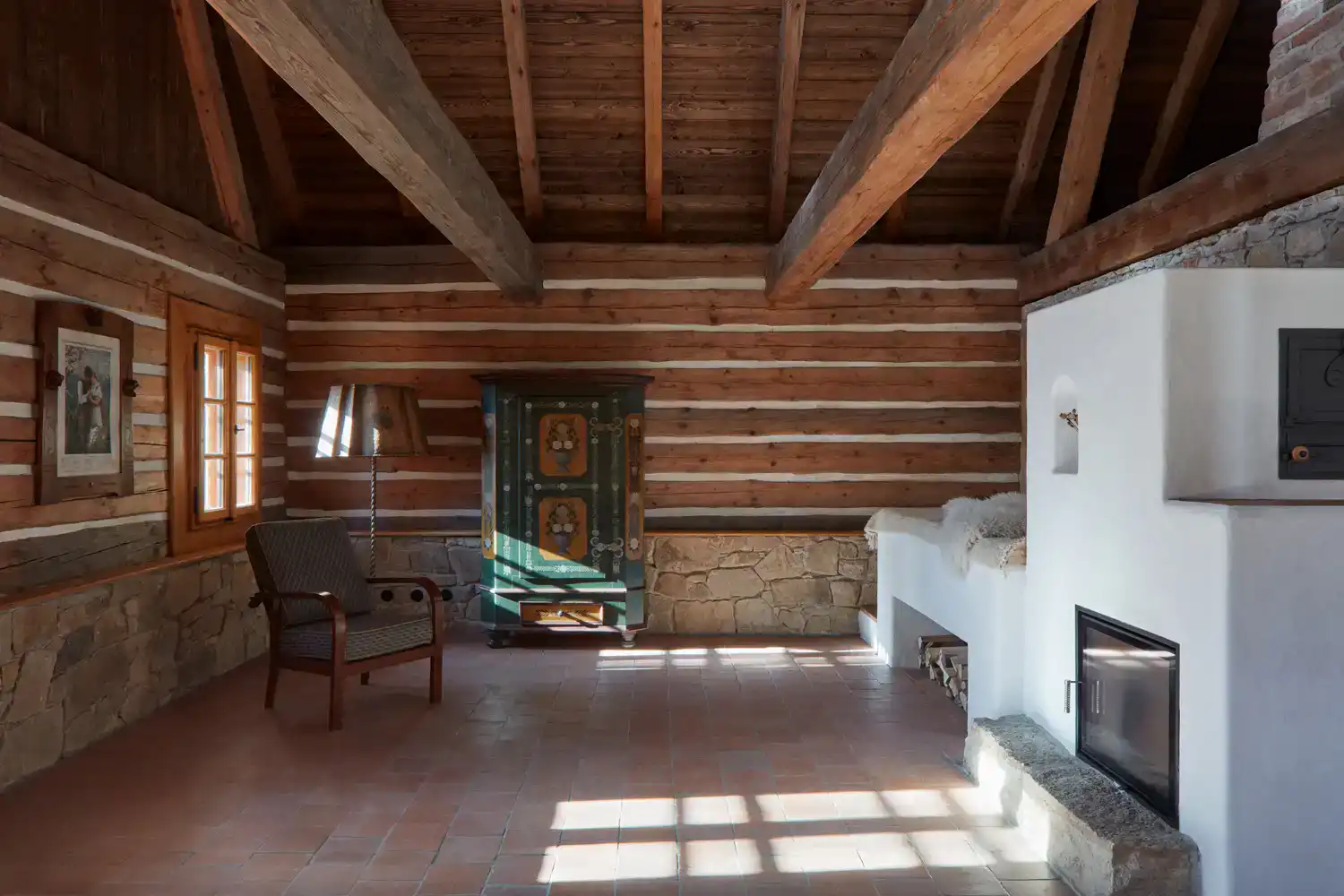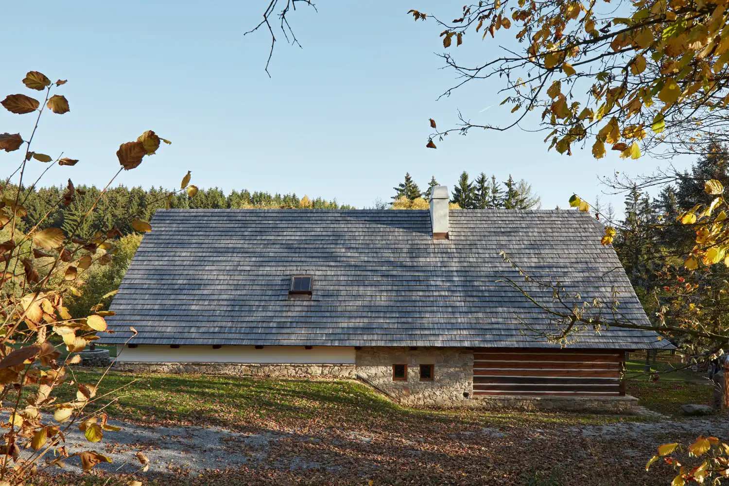 Dualita dvou domů se nese celým návrhem, navzájem se doplňují. Roubenka slouží pro celoroční pobyt majitele a je pojatá víc tradičně, přestože se musela z velké části postavit nově. V duchu starých chalup je tmavší, uzavřená a intimnější, zásadní roli tu hrají tradičně opracované povrchy – tesané trámy a roubení, hliněné omítky, ručně štípaný šindel. Nové prvky jako vložené patro nebo zádveří se snaží být spíš nerušivé.