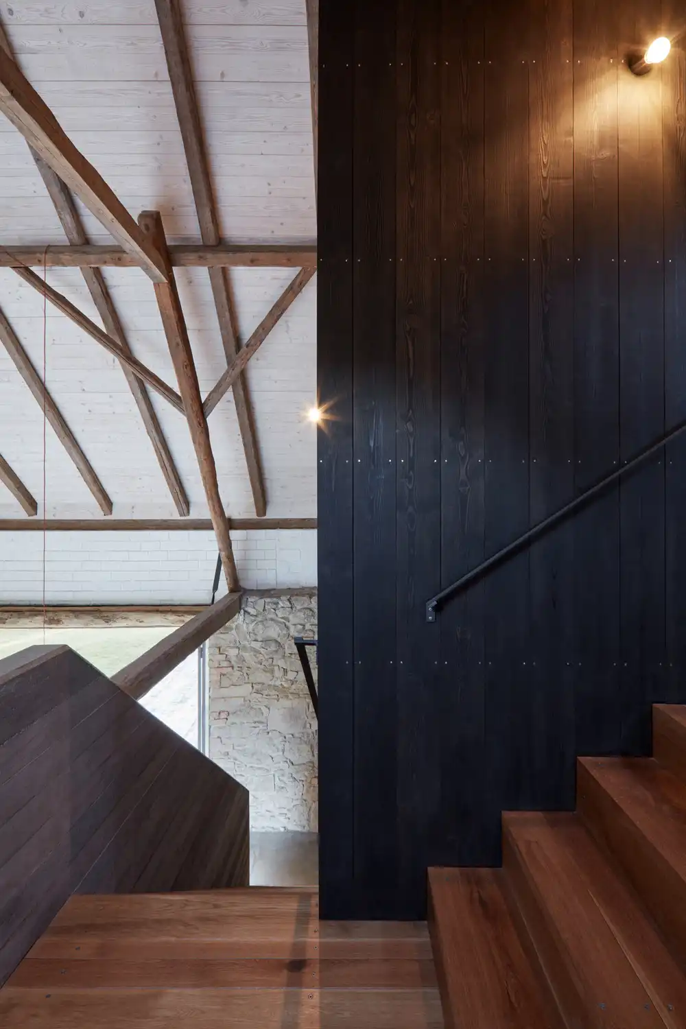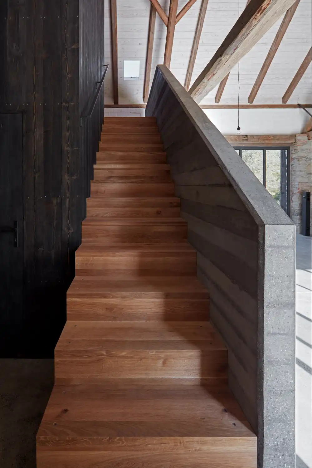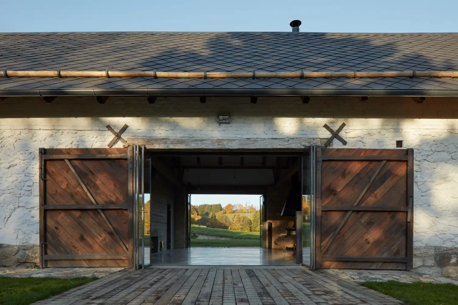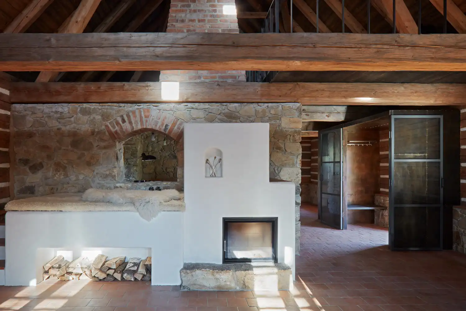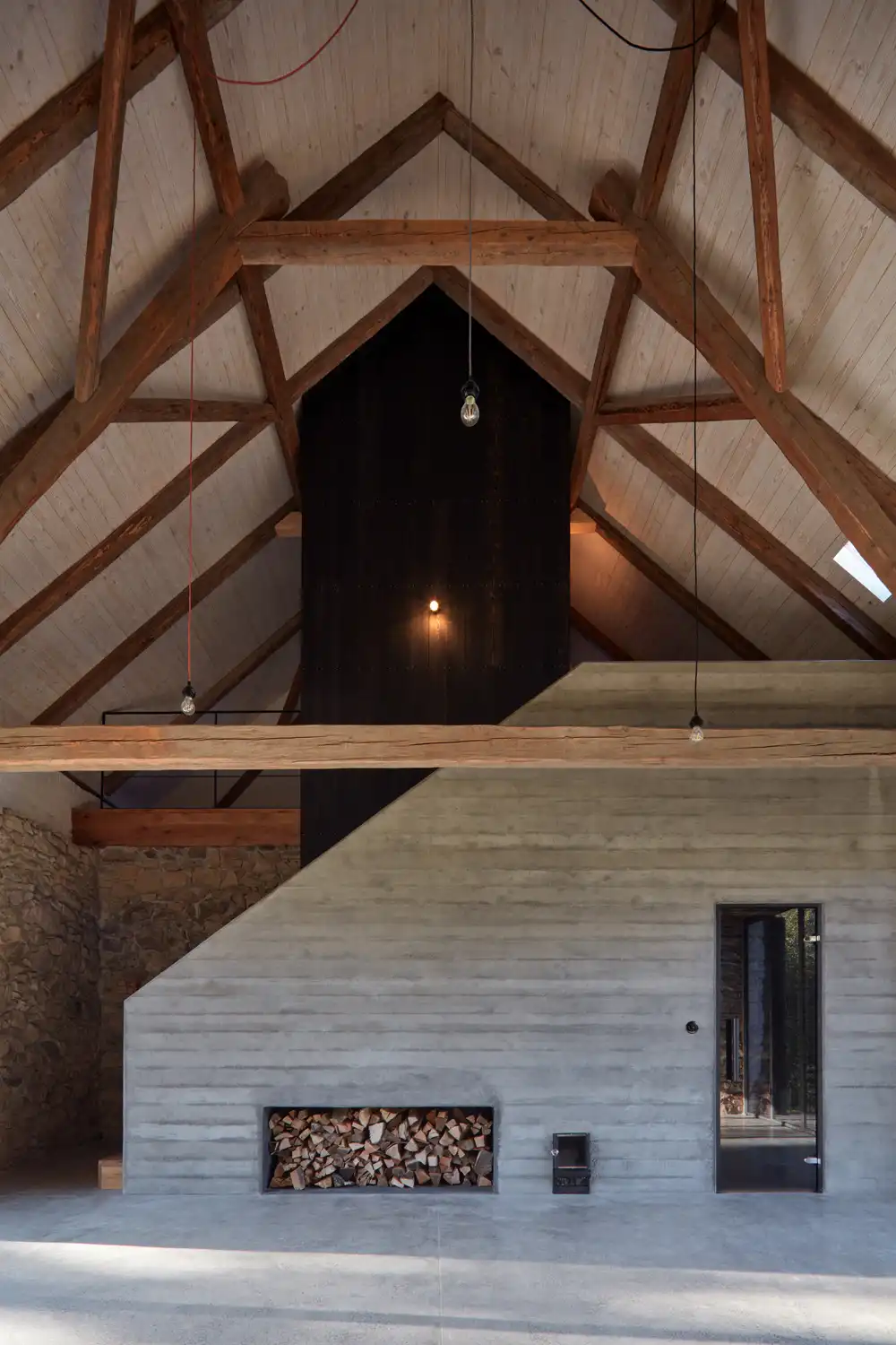 Stodola je doplňkové stavení, letní obývák a dům pro hosty, přístup k ní byl volnější a zásahy odvážnější. Původní kamenné zdivo doplňuje stěna z pohledového betonu s otisky prken, která skrývá schodiště a saunu. Na světlém podbití vyniká původní krov, prostor se otvírá skrz vrata a nové velké okno ve štítu na staré stromy. Pomyslným srdcem stodoly je otevřený krb na kameni z nedaleké stráně.