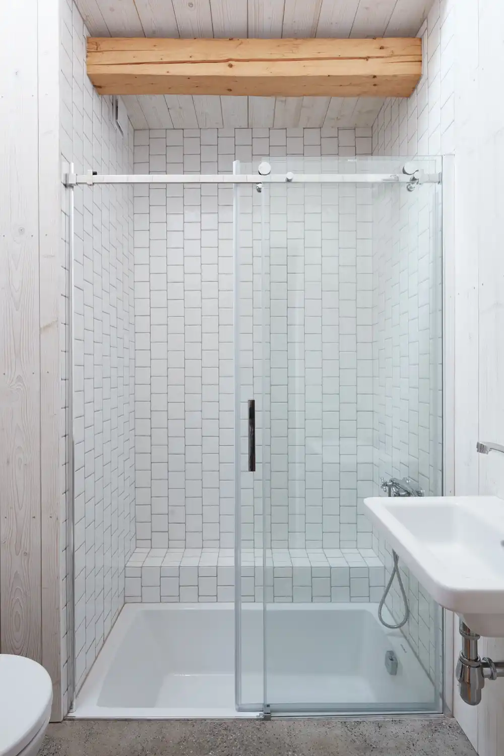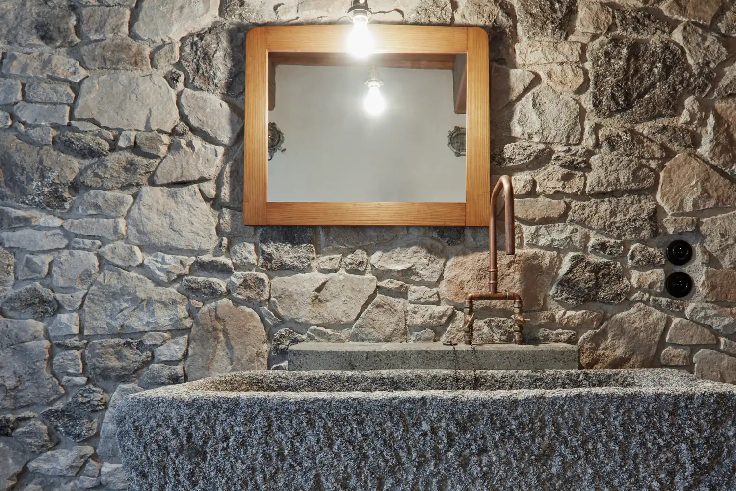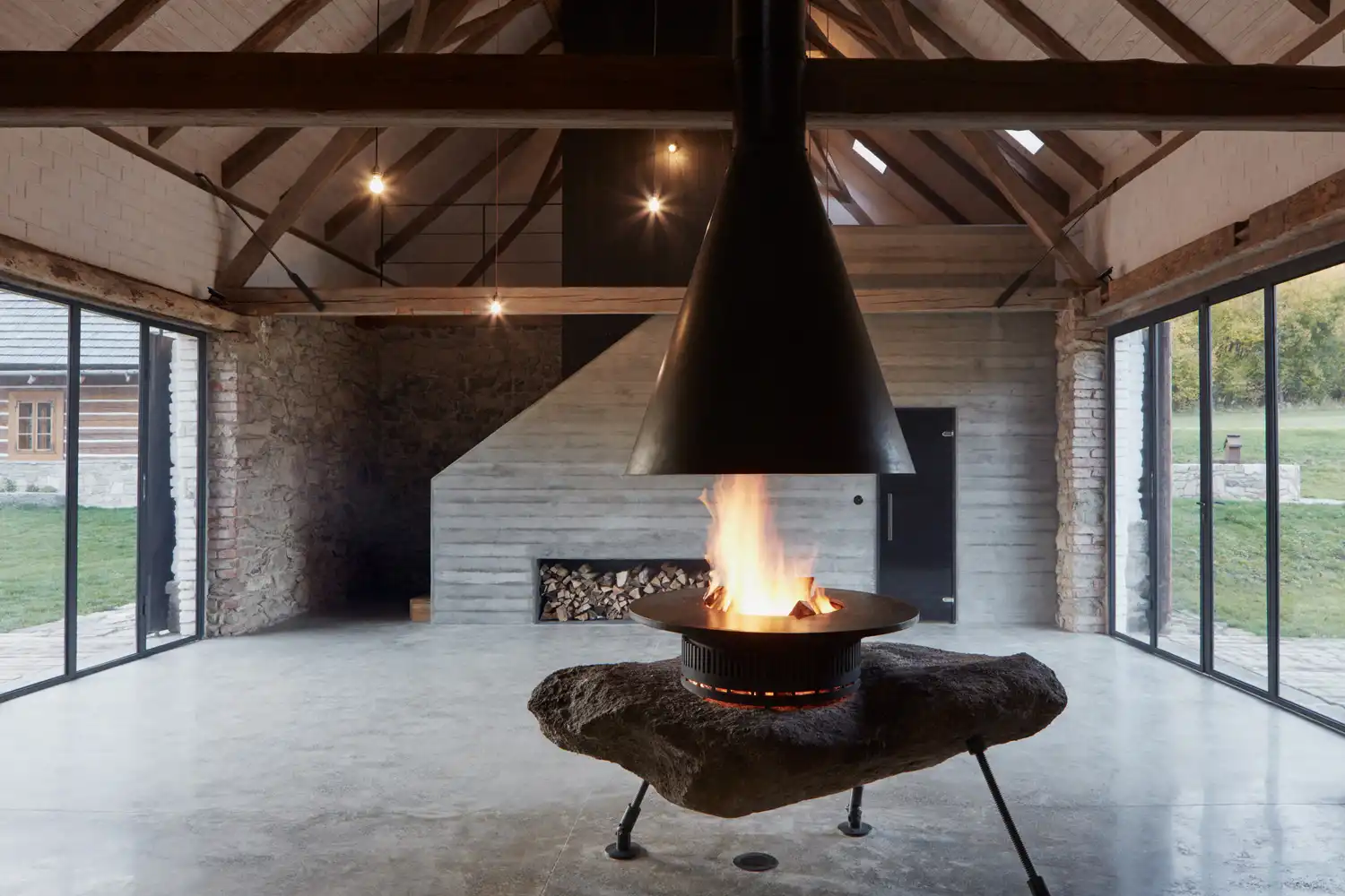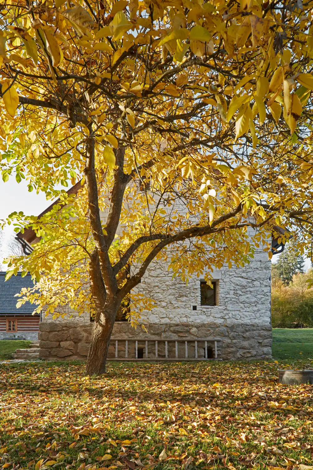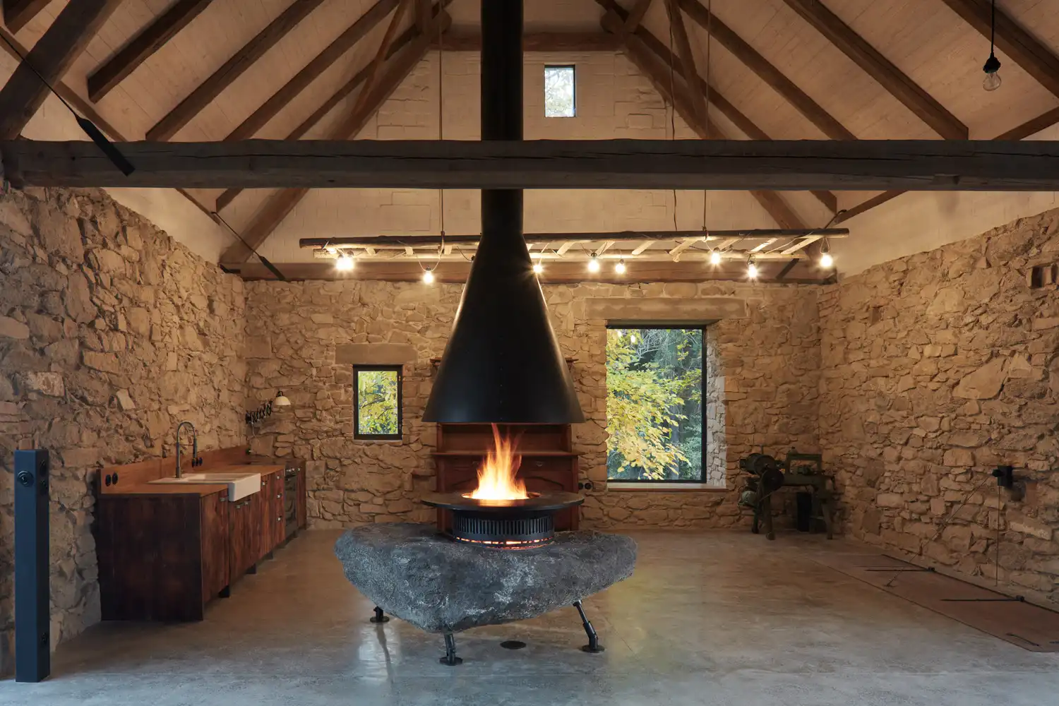 Stodola je doplňkové stavení, letní obývák a dům pro hosty, přístup k ní byl volnější a zásahy odvážnější. Původní kamenné zdivo doplňuje stěna z pohledového betonu s otisky prken, která skrývá schodiště a saunu. Na světlém podbití vyniká původní krov, prostor se otvírá skrz vrata a nové velké okno ve štítu na staré stromy. Pomyslným srdcem stodoly je otevřený krb na kameni z nedaleké stráně.