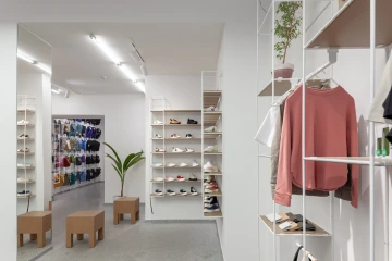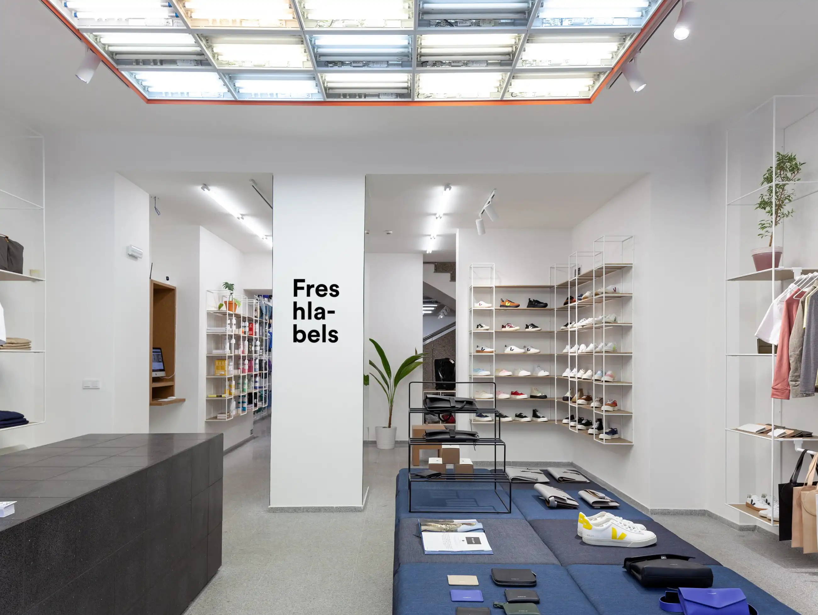 Freshlabels Sustainable Store na Letné je zatím největší obchod české prodejní platformy, která zde představuje pouze „udržitelné“ značky a produkty. Sortiment se různě mění a zahrnuje oblečení, boty i doplňky a kosmetiku. Zadání bylo nejen navrhnout funkční interiér z hlediska prodeje, ale především odrazit téma udržitelnosti právě i do interiéru obchodu.