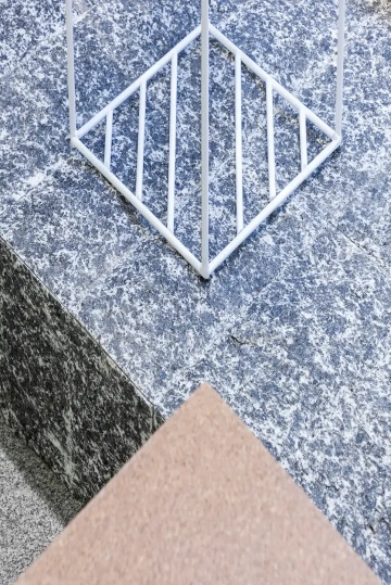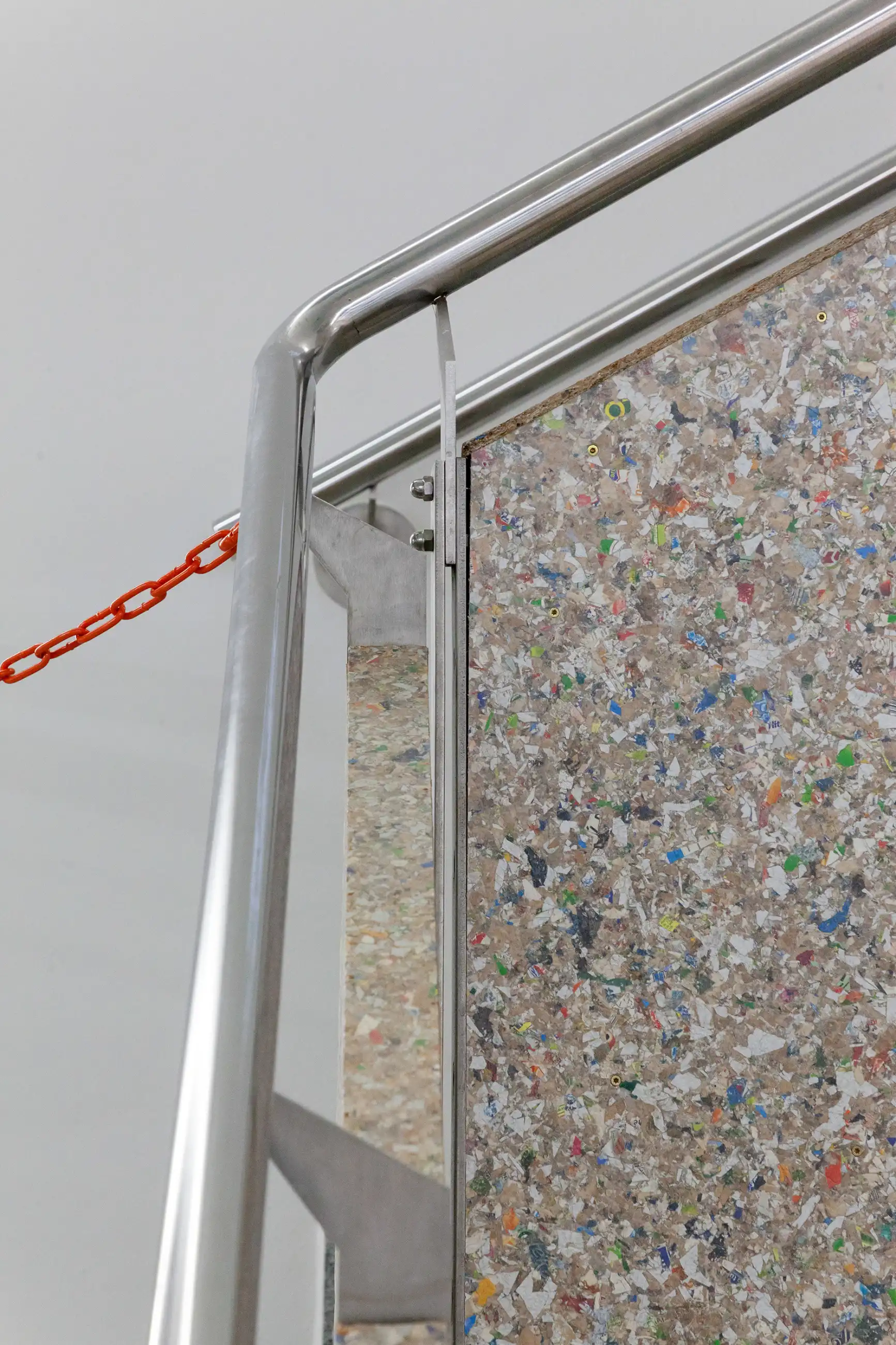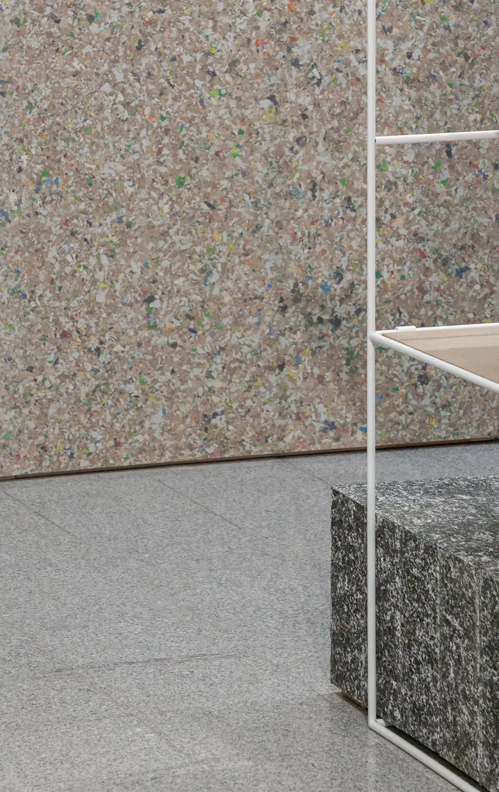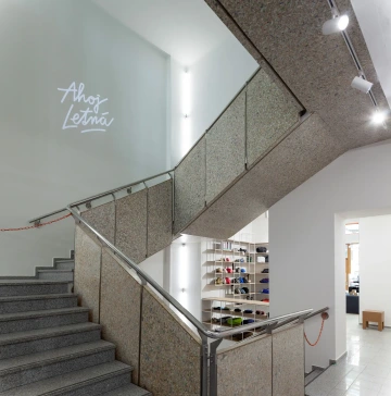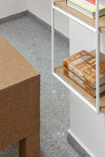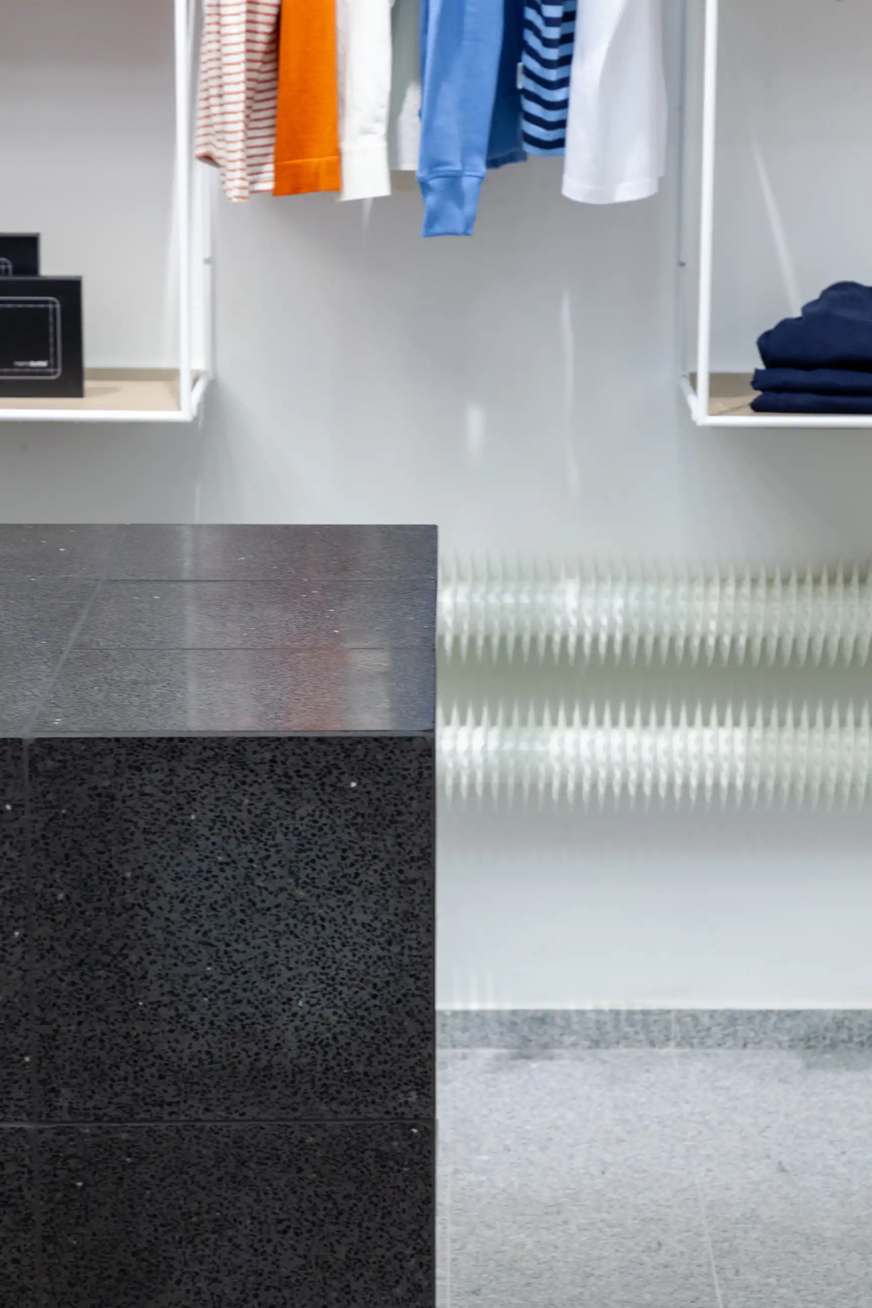 Některé takové pozůstatky dřívějšího interiéru banky z 90.let jsme se proto rozhodli zachovat a skrz nový kontext posunout jejich vzhled a celkový dojem do nové, současnější polohy. Konkrétně to byla hlavně žulová podlaha a schodiště přes tři podlaží s nerezovým zábradlím, které i z finančních důvodů nemělo smysl bourat. Podlahu jsme nechali přebrousit do matnějšího povrchu a lokálně doplnili obkladem soklů z hrubě štípané žuly, zbytkovým materiálem z jiné stavby. Schodiště jsme se snažili proměnit plošným obalením zábradlí do prostorové skulptury, na zakrytí byl zvolen levný deskový materiál zvaný Packwall z lisovaných tetrapak obalů od českého výrobce. Z něj jsou vytvořené i zkoušecí kabiny. Ze stávajících kancelářských svítidel jsme seskládali jedno super-svítidlo a staré dosluhující zářivky v nich doplnili novými s LED zdroji, čímž vznikla nečekaně zábavná světelná koláž a silný interiérový prvek dominující vstupní části obchodu. Pod ním stojí centrální prodejní sokl akcentovaný modrou barvou z recyklované džínoviny. Přírodní korek jako exemplární obnovitelný materiál zase vnáší do interiéru zateplení. Pokladny chrání a definuje černá terazzo dlažba s precizním detailem obložení navazující modulárně na spáry podlahy.