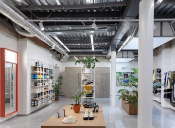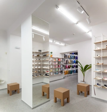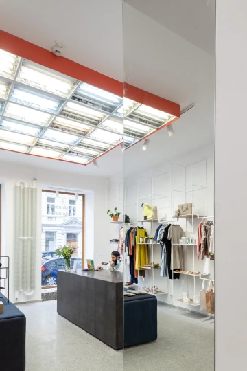 Zadní část obchodu zůstala záměrně s demontovaným podhledem a odhalenou hrubostí, z níž vystupuje pouze sádrokartonové opláštění stropních světlíků. Přední část obchodu je naopak pojatá jako světlý čistý prostor s velkorysejší expozicí vybraného zboží v návaznosti na výlohu do ulice. V rámci nového obchodu dostal kultivovanější podobu a barevnost i parter fasády domu.