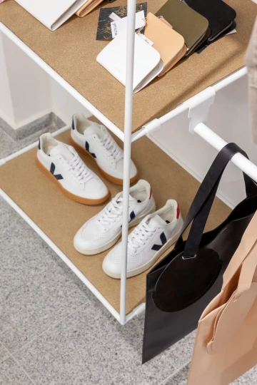 Dalším principem “udržitelnosti” je celková variabilita a flexibilita interiéru – hlavní výstavní mobiliář tvoří na míru navržené, nicméně modulární odlehčené konstrukce, které se dají snadno přestavět a přizpůsobit měnícím se potřebám prodeje a sortimentu, případně i adaptovat časem na úplně jiný prostor. Na míru vyvinutý systém zahrnuje nosný grid ve třech velikostech základního modulu a k němu pasující doplňky jako police, šatní tyče, háčky apod.