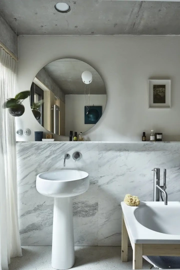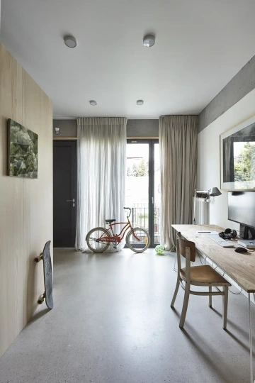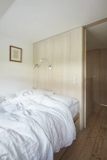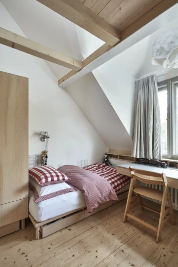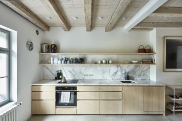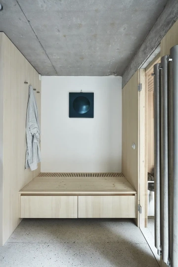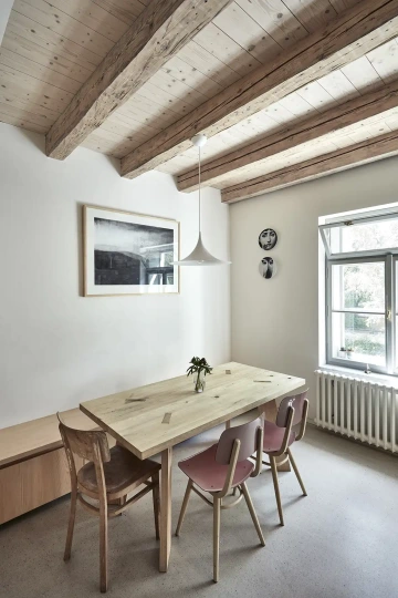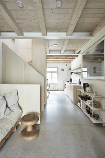 Všechny vestavné prvky propojuje povrch běleného dřeva, které svou jemnou kresbou zabydluje, ale nechává vzdušnost. Materiálovou škálu s ním harmonicky dotváří původní i nové smrkové stropní trámy, pohledový beton na nových stropech, litá cementová podlaha s jemným zrněním i lokálně použitý bílý mramor s výraznou žílou.