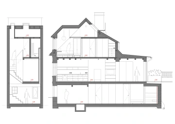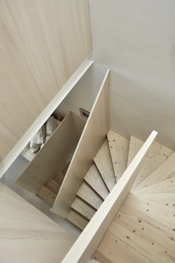 Pro maximální využití prostoru je interiér téměř celý navržený na míru, v podstatě na milimetry, a zahrnuje co nejvíc skrytých úložných prostor. Středobodem interiéru je nové zatočené schodiště přes tři patra, jeho dvě ramena jsou v přízemí navzájem posunutá a vytváří tak nečekaný průhled podpořený denním světlem z nového střešního okna. Zábradlí schodiště přechází plynule ve vestavěný nábytek a dřevěné příčky včetně integrovaných dveří se skrytou zárubní.