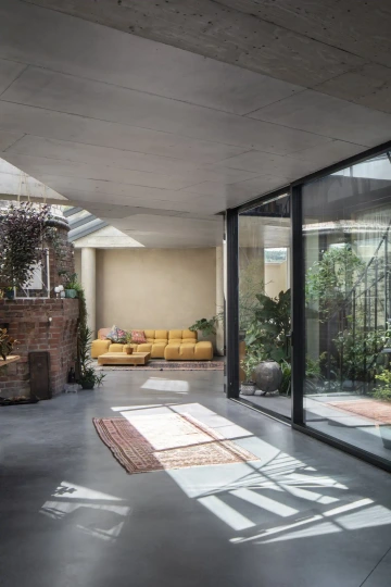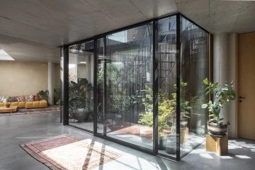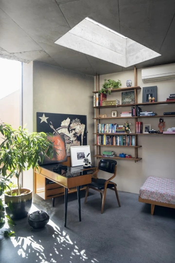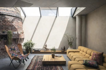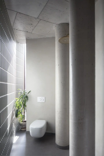Nevšední prostor v betonovém skeletu bez klasických oken, obrácený sám do sebe vytváří útočiště, vlastní svět měnící atmosféru podle denního světla a počasí.