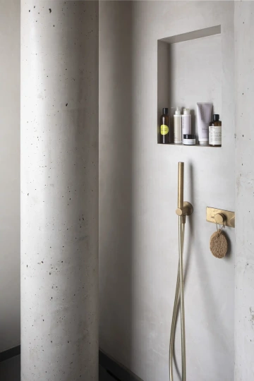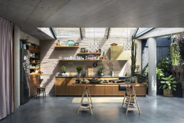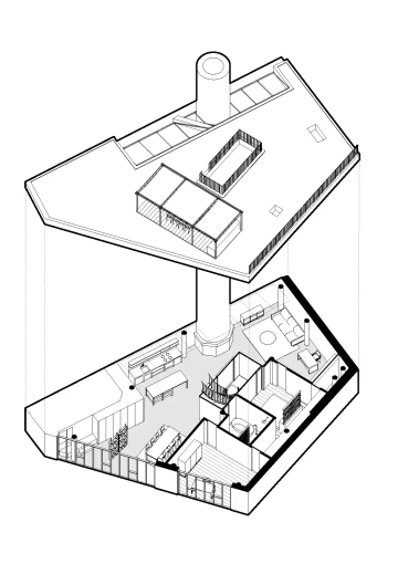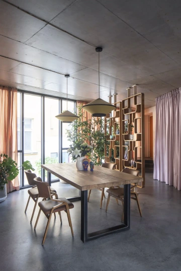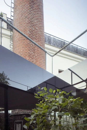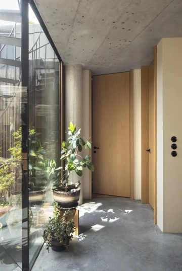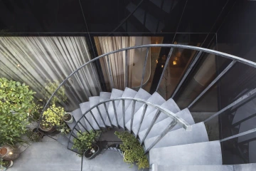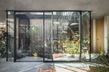 Prosklené atrium uprostřed bytu představuje ostrůvek exteriéru, kam klidně prší a sněží, jako malá vlastní krajina uvnitř obytného prostoru, pomlka a přitom středobod domova. A taky protiváha cihlového komínu, vertikální dominanty, které jde díky střešnímu světlíku dohlédnout až na vrchol. Intimitu vnitřku vyvažuje velká střešní terasa se zahradou a výhledy do okolí. Nové schody na terasu stojí v atriu jako socha pohledová ze všech stran, díky své subtilitě a zakřivení neclonící, zahalená v odrazech a zeleni. Prostor vznikl jako součást bytového domu z roku 2004 vestavěného do dvora bývalého mlýna v pražských Nuslích. V rámci rekonstrukce jsme měnili zasklení atria, světlíků i fasády a celé dispoziční řešení bytu. Většina bytu zůstala jako otevřený openspace, menší privátnější část zahrnuje ložnice a koupelny a průchozí šatnu. Pomyslná hranice těchto dvou zón je záměrně nepřímá a vytváří tak zákoutí, částečně probíhá skrz atrium a nabízí tak průhledy i průchody. Pohledový beton na stropech, kulaté nosné sloupy a nová stěrková podlaha vytváří minimalistický základ pro pestrost vybavení, barev, textur a rodinného života, kterou sem vnesli klienti se svým jedinečným vkusem.