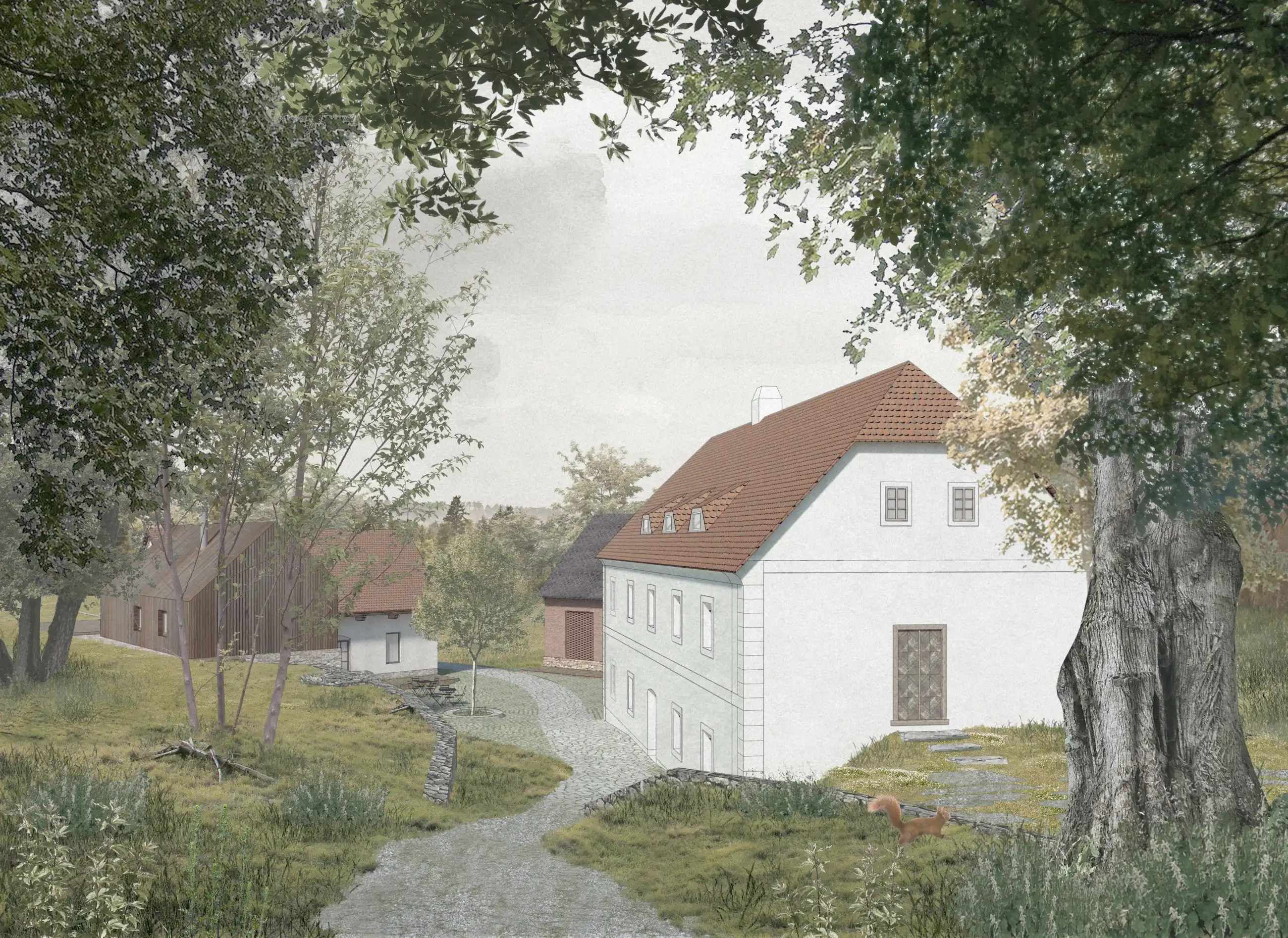 Koncept řešení areálu vychází z vlastní topografie místa – čitelnou linii původní kamenné zídky v terénním zlomu protahuje návrh jako jednotící linii a vytváří z ní čelní fasádu pro nové přístavby. Kamenná stěna pokračuje i na příjezdovou louku, vymezuje prostor parkoviště a ukrývá služební vjezd do provozní přístavby zapuštěné v terénu. Uvnitř dvora na místě rozpadlého chlívku vzniká na kamenném soklu drobná dřevěná nástavba – novodobá „kůlna“ s bytem správce. Jinak je zvenku zachován vlastní charakter všech budov, každá je pojatá specificky s ohledem na její původní funkci. V kamenné budově chlévů vzniká restaurace s venkovní zahrádkou na dvoře a s podkrovním sálem. Novodobější rozměrná budova stodoly zůstává jako vnější schránka, do které jsou doplněny ubytovací apartmány jako izolované vestavby, v meziprostoru zůstává patrná prostorová velkorysost původní konstrukce. Mlýn je srdce areálu uchopené s největší pokorou a snahou o obnovu, torzo historické mlýnské technologie zůstává v otevřeném prostoru mlýnice přístupné všem, s malou autentickou světničkou s pecí a kuchyní v přízemí a apartmány v části patra a v podkroví. Záměr zamýšlí dotvoření celého areálu včetně okolních lesů, louky a obnovy rybníka a posiluje provázanost s vodou skrz sérii drobných staveb a míst.