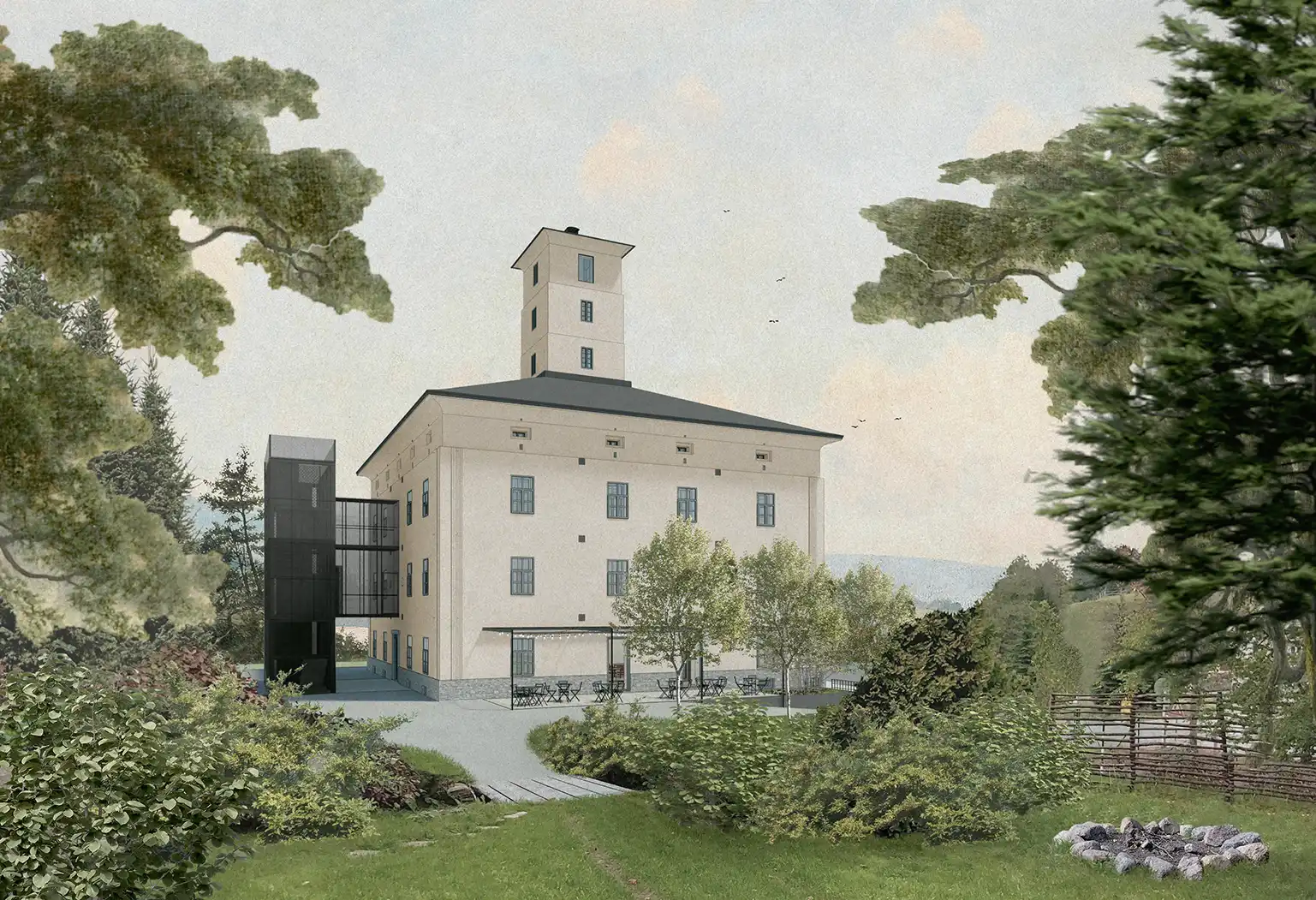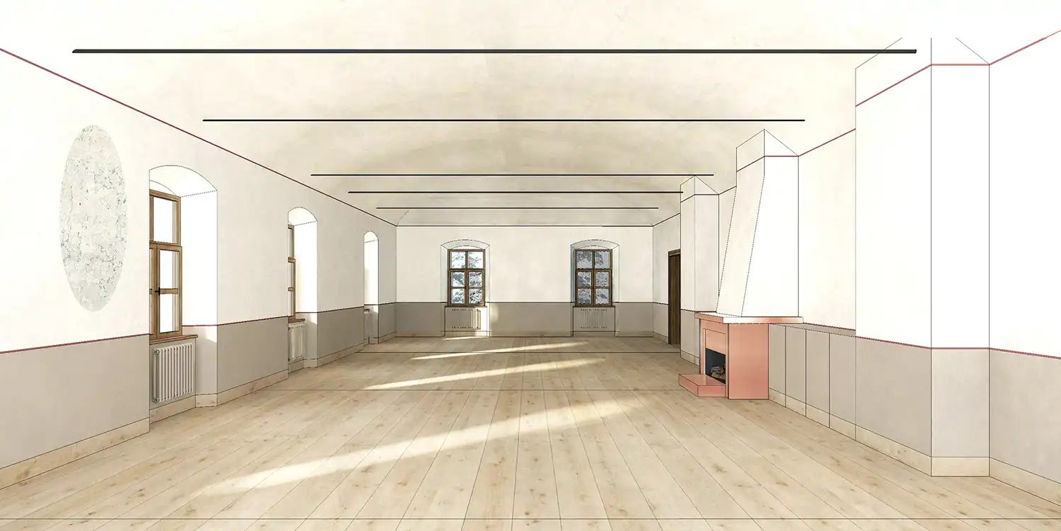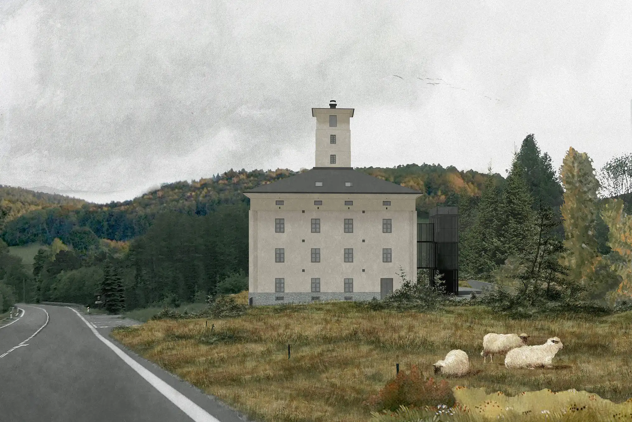 Jedinečná stavba na úpatí Jeseníků nás od začátku nadchla svojí geometrií, technickým řešením a stavební velkorysostí – v symetrii, bytelnosti konstrukcí, v rozponech sálu nebo i formátech kamenné dlažby… Díky strategické poloze vznikla v 2. polovině 19. století na místě staré rychty jako poštovní přepřahací stanice s pohostinstvím, tanečním sálem a ubytováním. Postupné obnovení této funkce je i záměr nových majitelů a našeho návrhu. Nové zásahy nutné pro adaptaci na současné využití se snažíme navrhovat s respektem k vnitřní logice stavby a zároveň přiznaně, aby i navenek avizovaly nový život. V exteriéru se jedná hlavně o přístavbu nové komunikační věže k zadní fasádě, skrývající výtah a schody do vyšších pater. Na boční fasádě v místě dřívější předzahrádky vkládáme venkovní terasu pro vlídnější vstupní zónu k občerstvení v části přízemí a při čelní fasádě definujeme jasně vymezený předprostor domu. Ostatní zásahy jsou spíš drobné a chirurgicky precizní úpravy otvorů, nenarušující symetrii a řád budovy. V posledním patře věže dávají zvětšená protilehlá okna přehled i majákový signál do dálky. Věž v sobě skrývá sofistikovaný komín, rozvětvený v celé budově kolem středového schodiště, na který se vážou i vnitřní topeniště. V interiérech budovy se návrh snaží zachovat a využít původní působivé prvky a autentickou patinu, s kterou v různé míře pracuje v prostorech bistra, společenského sálu i ubytovacích apartmánů.