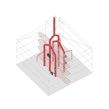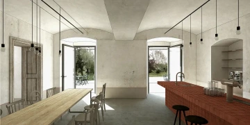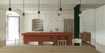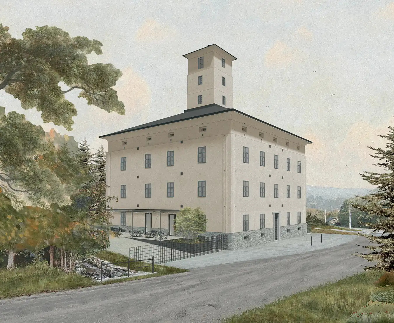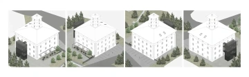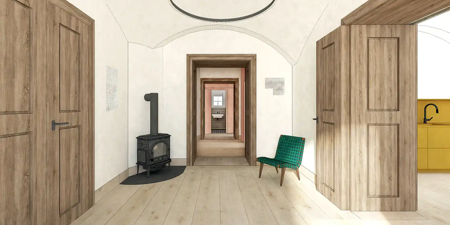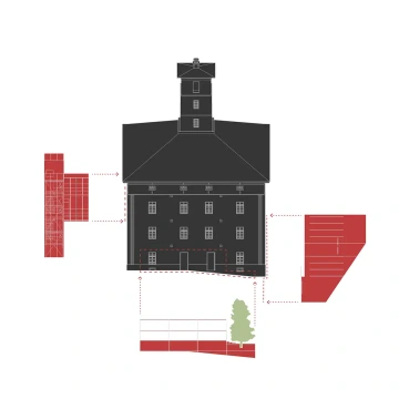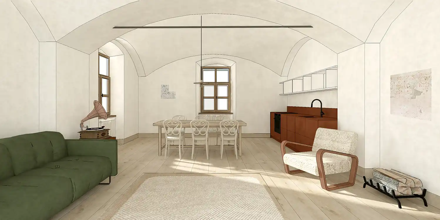 Jedinečná stavba na úpatí Jeseníků nás od začátku nadchla svojí geometrií, technickým řešením a stavební velkorysostí – v symetrii, bytelnosti konstrukcí, v rozponech sálu nebo i formátech kamenné dlažby… Díky strategické poloze vznikla v 2. polovině 19. století na místě staré rychty jako poštovní přepřahací stanice s pohostinstvím, tanečním sálem a ubytováním. Postupné obnovení této funkce je i záměr nových majitelů a našeho návrhu. Nové zásahy nutné pro adaptaci na současné využití se snažíme navrhovat s respektem k vnitřní logice stavby a zároveň přiznaně, aby i navenek avizovaly nový život. V exteriéru se jedná hlavně o přístavbu nové komunikační věže k zadní fasádě, skrývající výtah a schody do vyšších pater. Na boční fasádě v místě dřívější předzahrádky vkládáme venkovní terasu pro vlídnější vstupní zónu k občerstvení v části přízemí a při čelní fasádě definujeme jasně vymezený předprostor domu. Ostatní zásahy jsou spíš drobné a chirurgicky precizní úpravy otvorů, nenarušující symetrii a řád budovy. V posledním patře věže dávají zvětšená protilehlá okna přehled i majákový signál do dálky. Věž v sobě skrývá sofistikovaný komín, rozvětvený v celé budově kolem středového schodiště, na který se vážou i vnitřní topeniště. V interiérech budovy se návrh snaží zachovat a využít původní působivé prvky a autentickou patinu, s kterou v různé míře pracuje v prostorech bistra, společenského sálu i ubytovacích apartmánů.