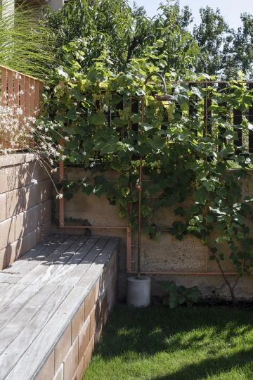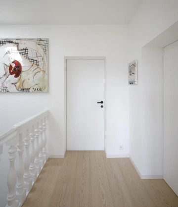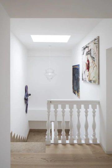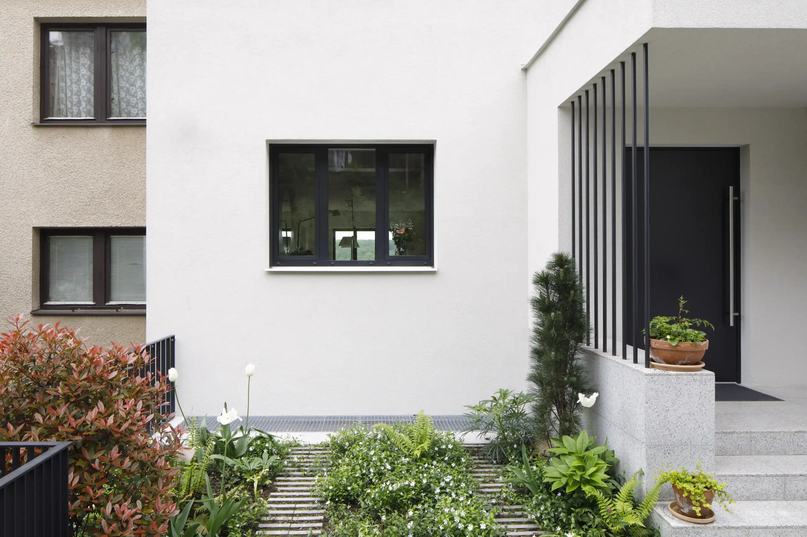 Rodinný dům je součástí řadové zástavby z 90.let posazené na jižním svahu v klidné rezidenční části Prahy. Domy mají klasicky trojdělená okna a odskočený objem s garáží, postupem času se jednotlivé řadové domy proměňují. Záměrem rekonstrukce bylo nevystupovat z řady navzdory požadovaným úpravám. Hlavní bylo zateplení a rozšíření vstupní stříšky k průchodu z garáže. U ní došlo jen ke kultivaci nájezdu a soklu. Malá předzahrádka domu slouží jako malé rezervní parkovací stání za posuvným plůtkem, na který navazuje kryt popelnice, úpravou prošel i anglický dvorek.