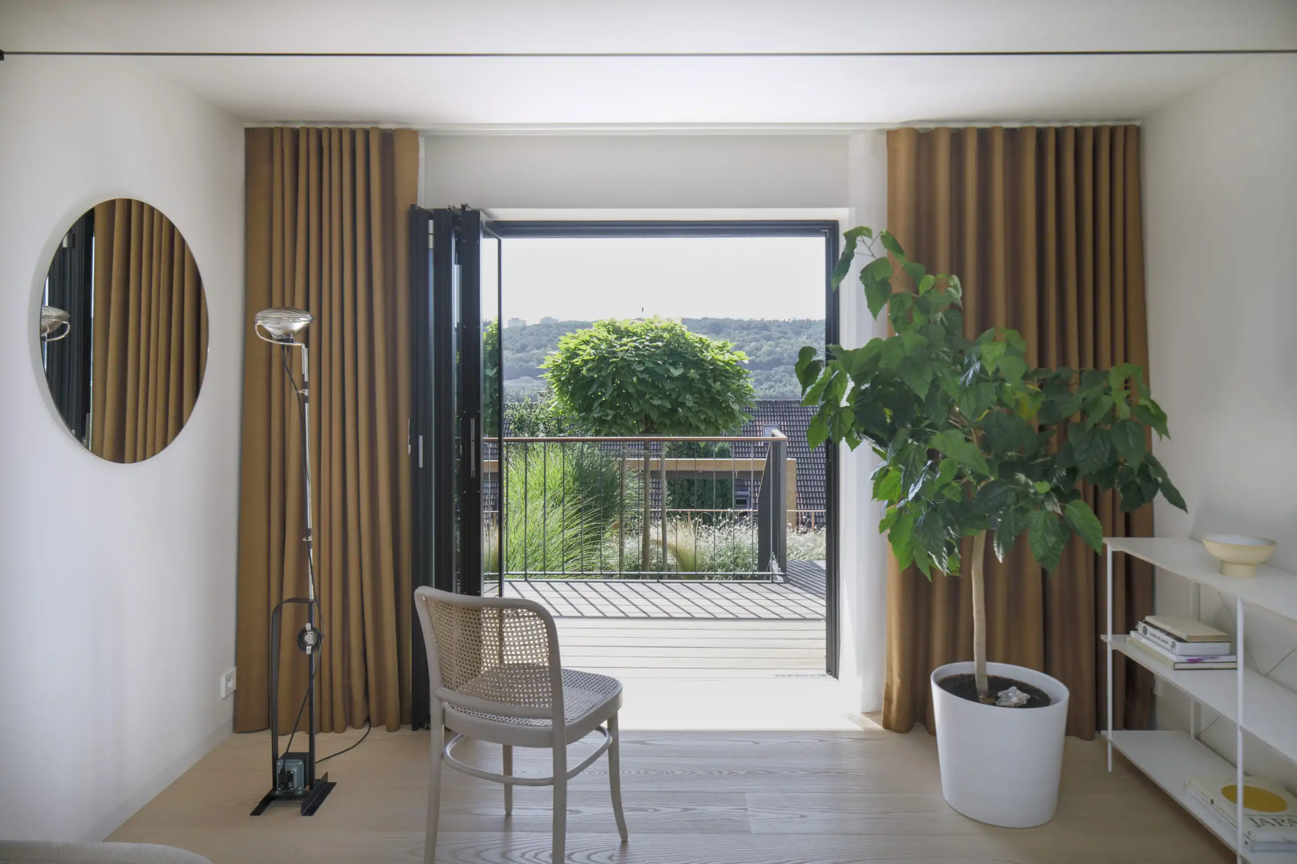 Do třípatrového domu se vstupuje z ulice v úrovni prostředního podlaží, vlivem svahu se pak na protější straně do zahrady vystupuje o patro níž v polosuterénu.