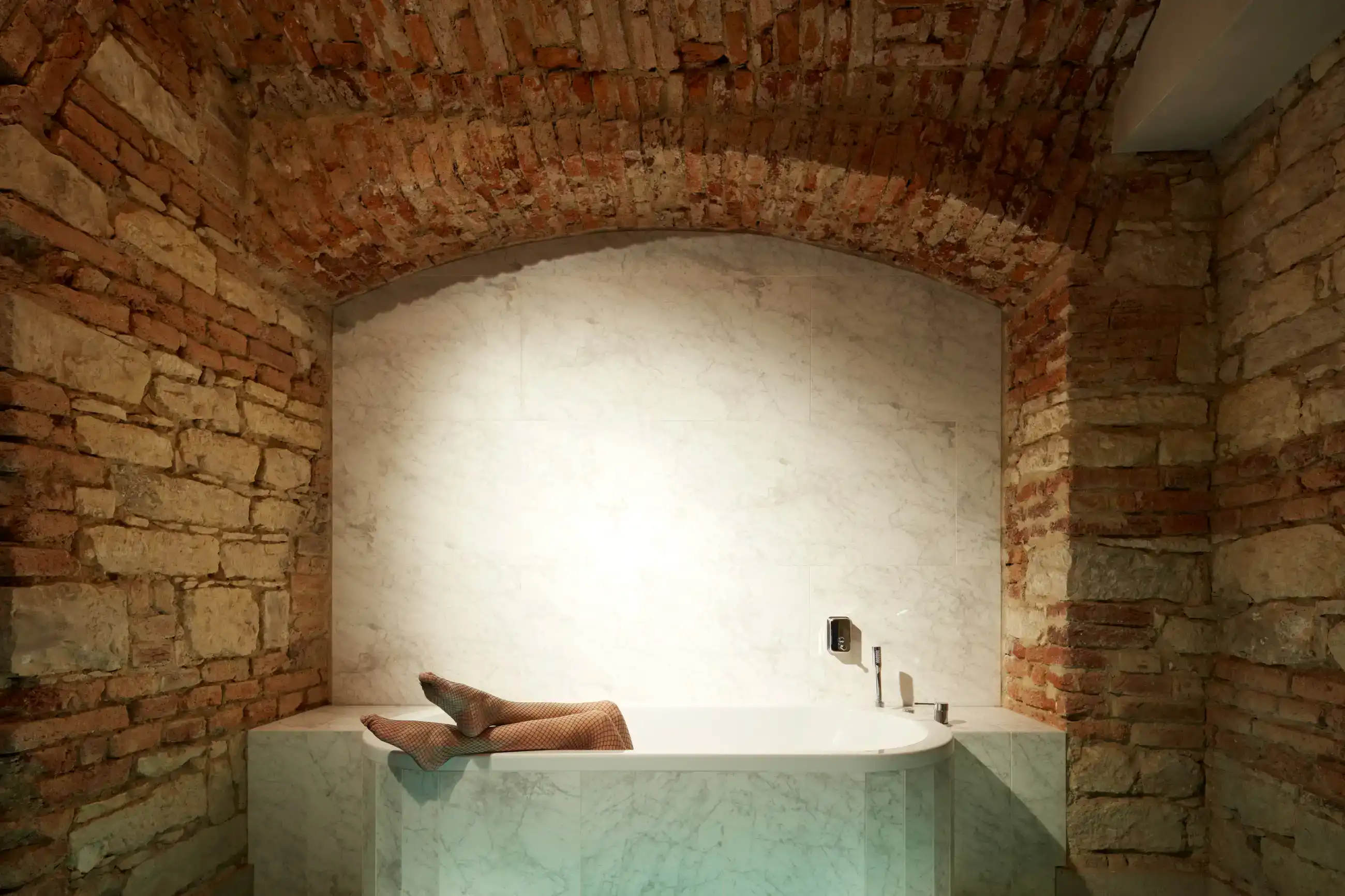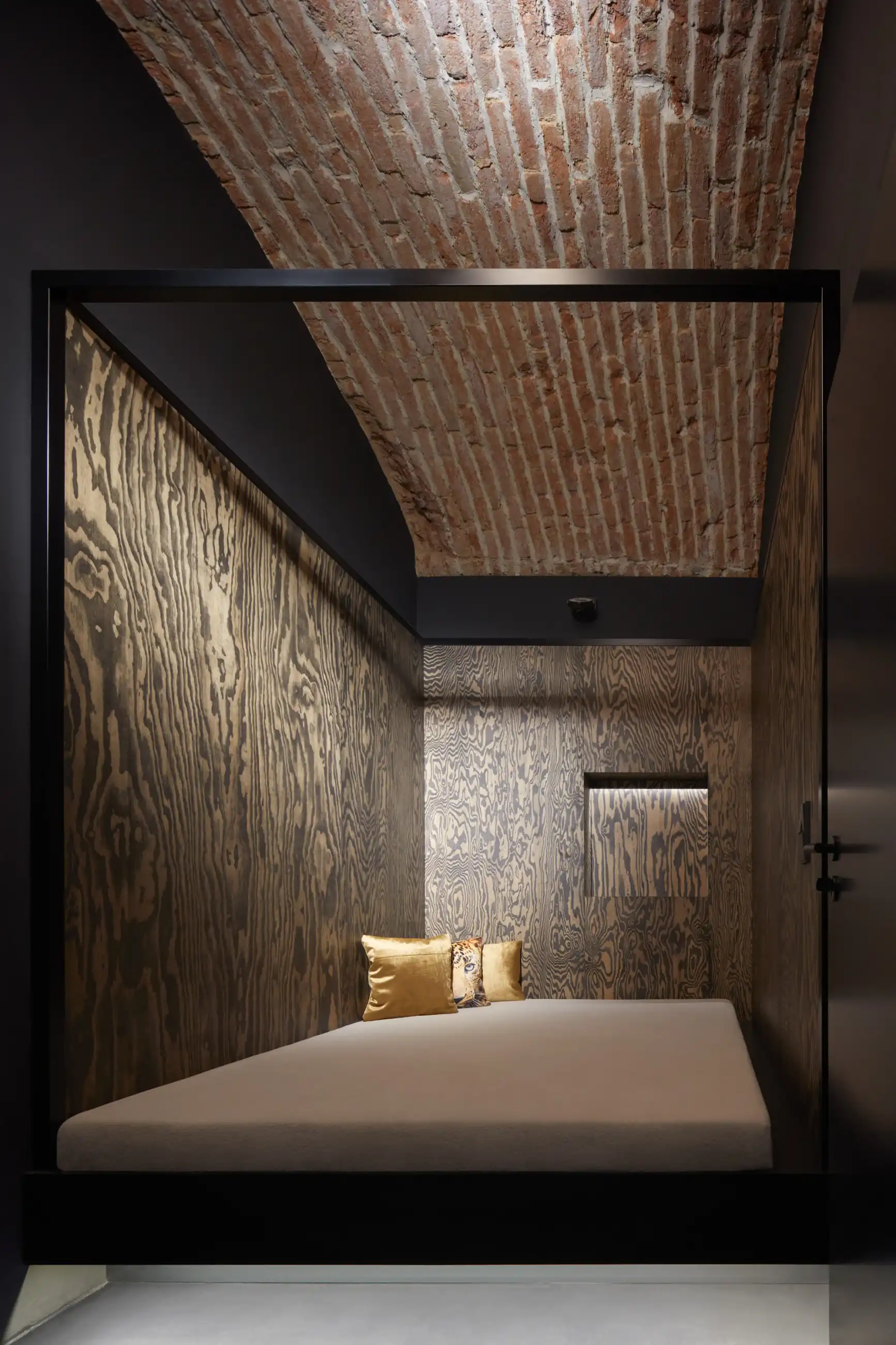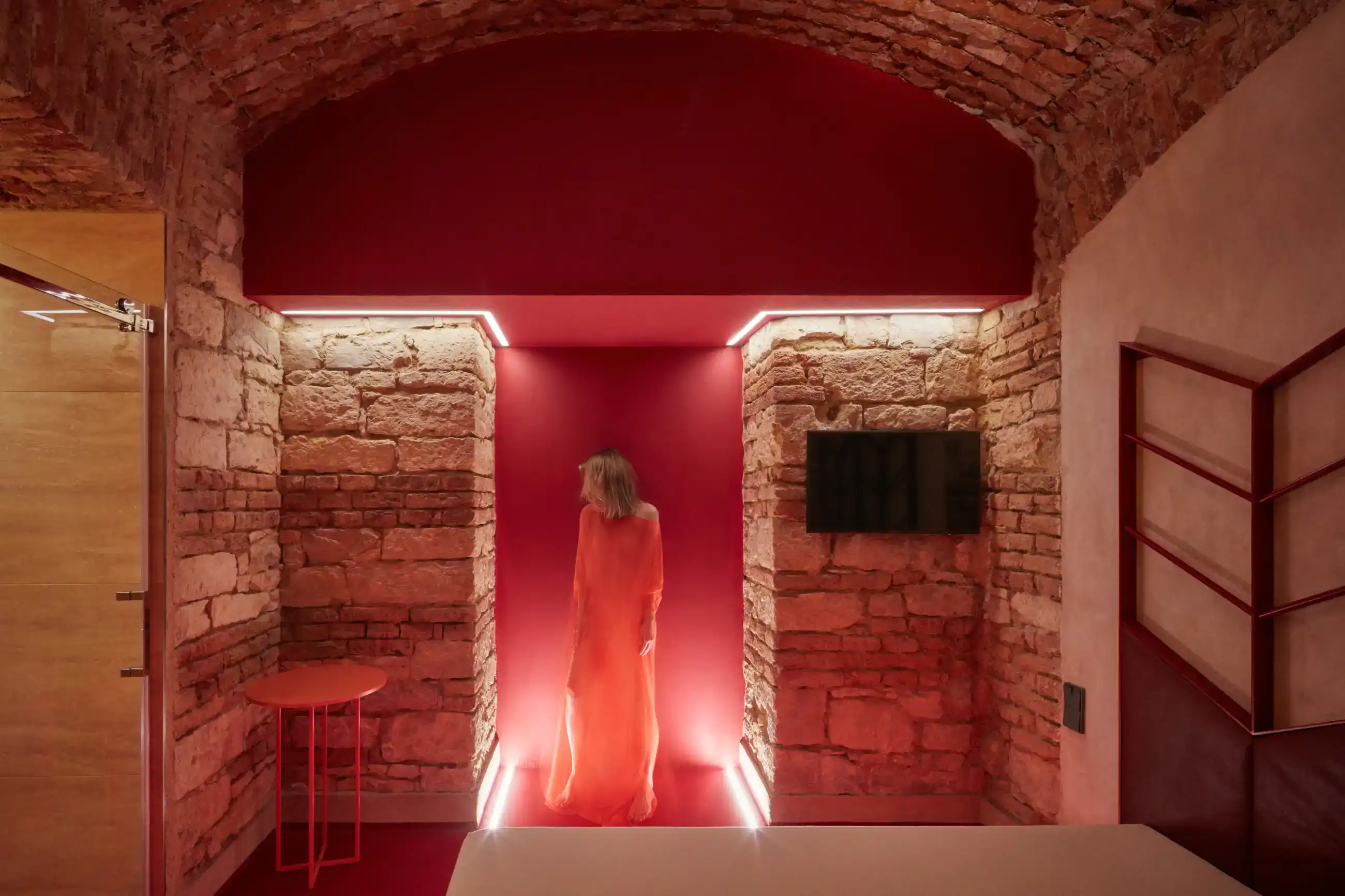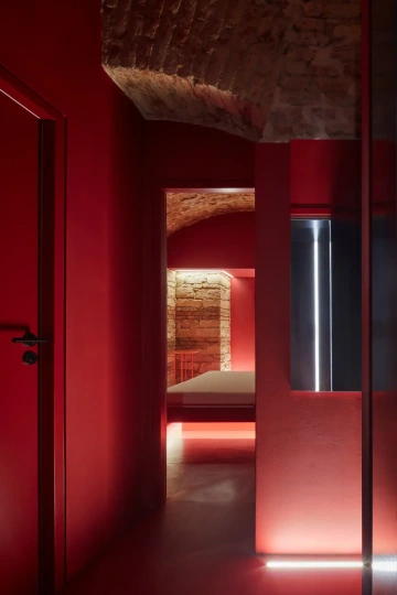 Navrhnout speciální „relaxační centrum“, které v podstatě funguje jako hodinový hotel, může pro někoho znít jako zadání snů, nicméně byla to spíš výzva, stejně jako daný sklepní prostor bez oken. Zásadní otázky této výzvy – jak nepůsobit vulgárně, navodit pocit intimity, přitom prakticky odpovědět na specifika provozu? Jak využít původní klenby a zdivo, aby to zároveň nepůsobilo jako středověká mučírna? Odpovědí je snaha vytvořit lehce snový paralelní svět v podzemí, který by navozoval patřičnou atmosféru... s tajemnou, až lehce bizarní elegancí, mimo všední realitu. Inspirace estetikou Davida Lynche byla nasnadě, předobrazem tmavé vstupní chodby se stala zase scéna z filmu Pod kůži. Intimitu podporuje hra s umělým osvětlením a jeho různé efekty. K odhalenému hrubému zdivu kontrastuje minimalistické pojetí nových povrchů, které sjednocuje vždy jedna barva na všechno – podlahy, stěny, dveře i nábytek a doplňky. Pro posílení dojmu „luxusu“ je přidán další doplňkový dekor – ve větších pokojích textura kamene, v těch menších pak téměř exotická kresba dřeva. Balancování na hranici kýče v tomto případě vůbec nevadí...