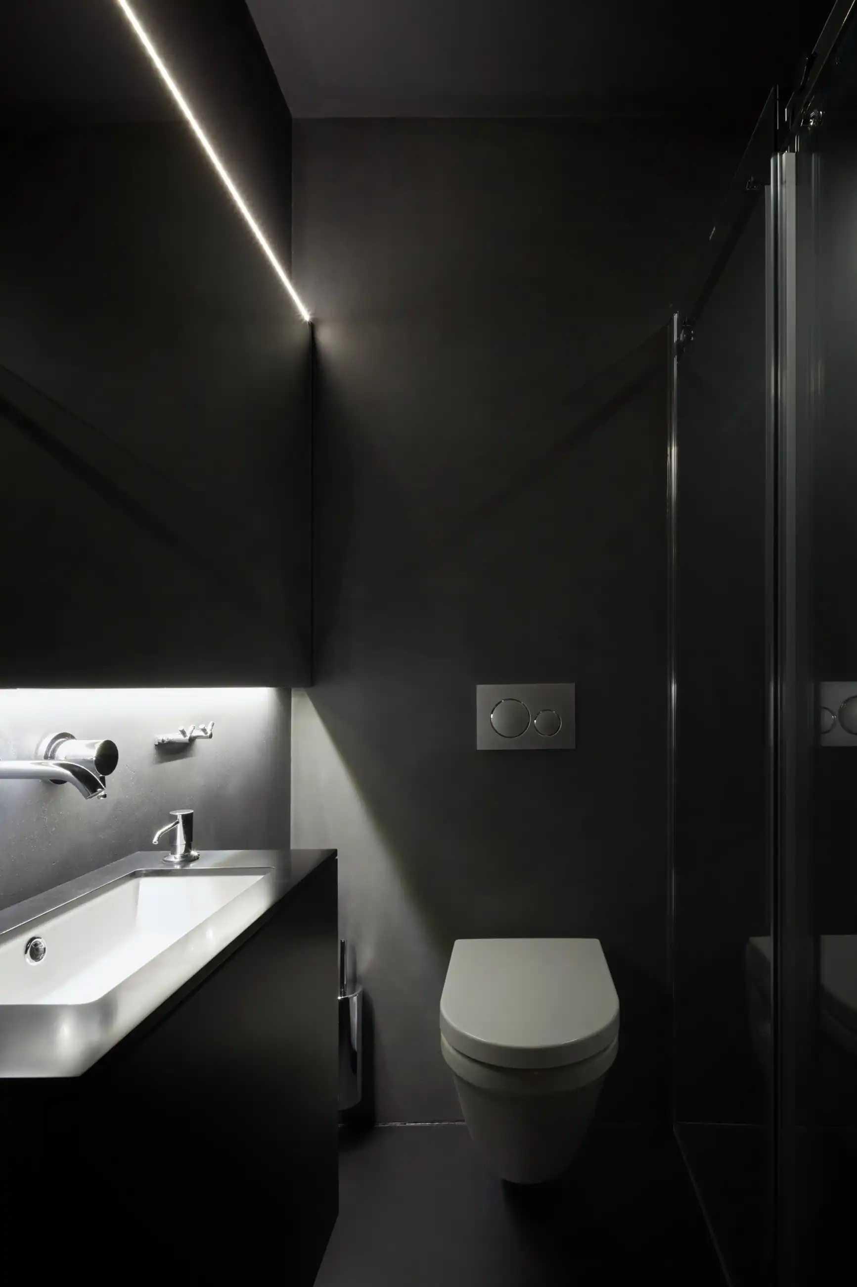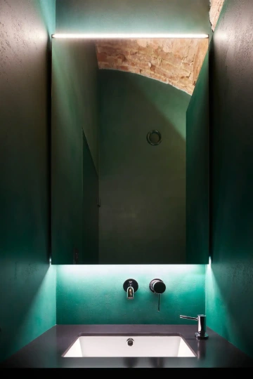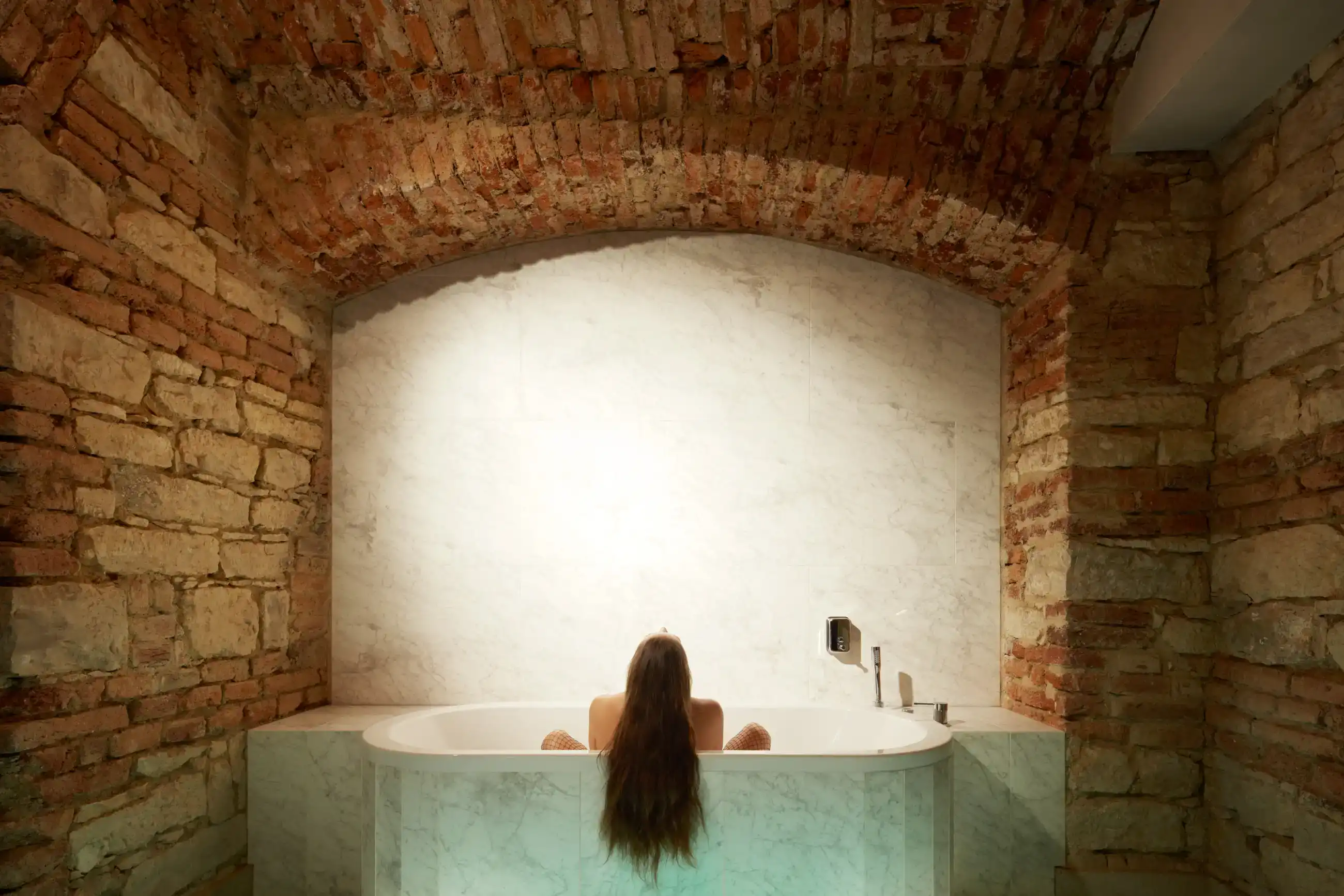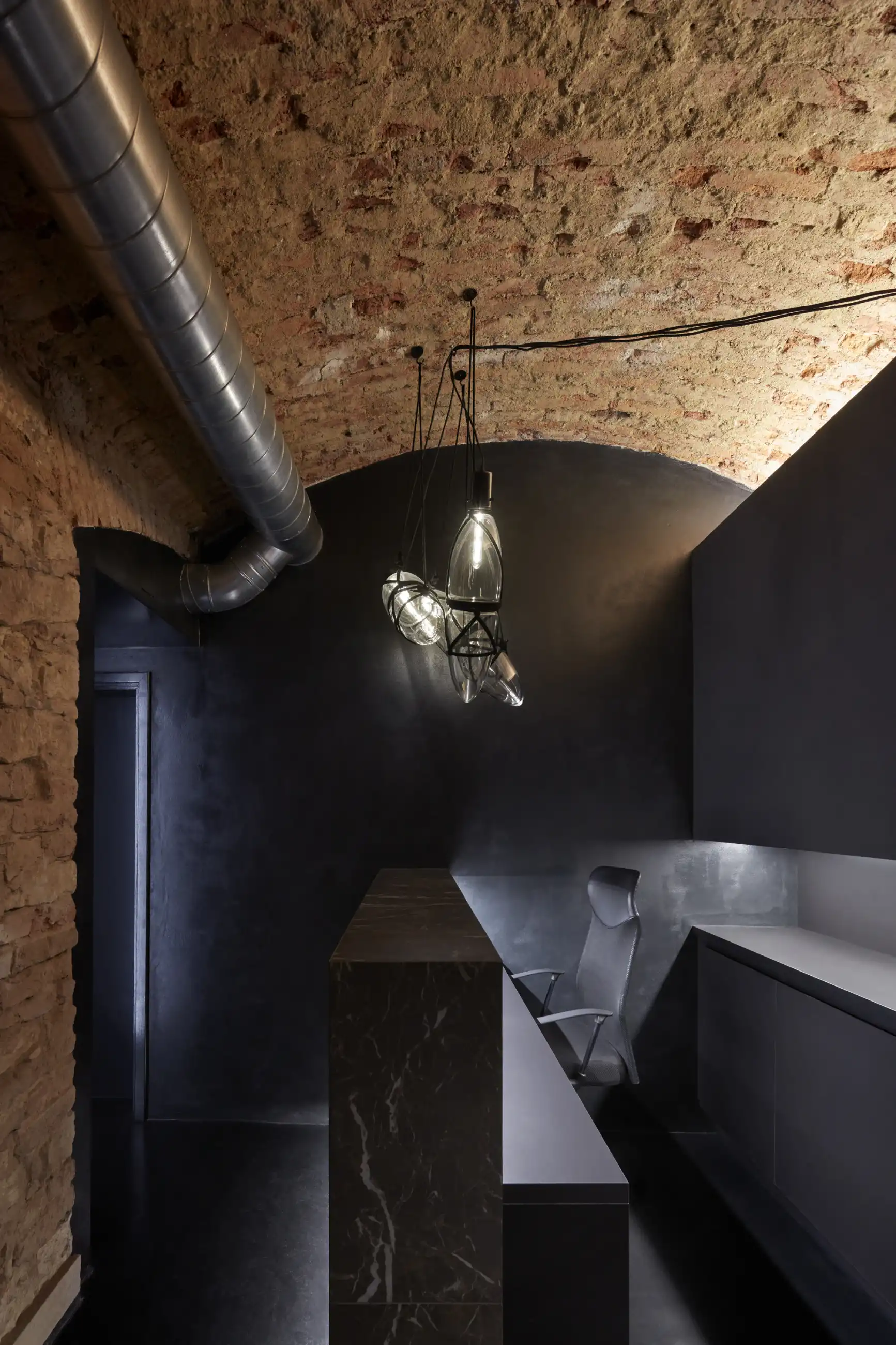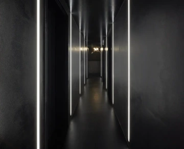 Navrhnout speciální „relaxační centrum“, které v podstatě funguje jako hodinový hotel, může pro někoho znít jako zadání snů, nicméně byla to spíš výzva, stejně jako daný sklepní prostor bez oken. Zásadní otázky této výzvy – jak nepůsobit vulgárně, navodit pocit intimity, přitom prakticky odpovědět na specifika provozu? Jak využít původní klenby a zdivo, aby to zároveň nepůsobilo jako středověká mučírna? Odpovědí je snaha vytvořit lehce snový paralelní svět v podzemí, který by navozoval patřičnou atmosféru... s tajemnou, až lehce bizarní elegancí, mimo všední realitu. Inspirace estetikou Davida Lynche byla nasnadě, předobrazem tmavé vstupní chodby se stala zase scéna z filmu Pod kůži. Intimitu podporuje hra s umělým osvětlením a jeho různé efekty. K odhalenému hrubému zdivu kontrastuje minimalistické pojetí nových povrchů, které sjednocuje vždy jedna barva na všechno – podlahy, stěny, dveře i nábytek a doplňky. Pro posílení dojmu „luxusu“ je přidán další doplňkový dekor – ve větších pokojích textura kamene, v těch menších pak téměř exotická kresba dřeva. Balancování na hranici kýče v tomto případě vůbec nevadí...