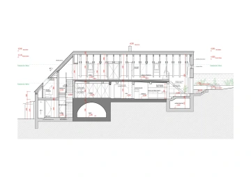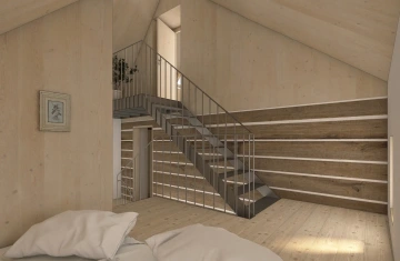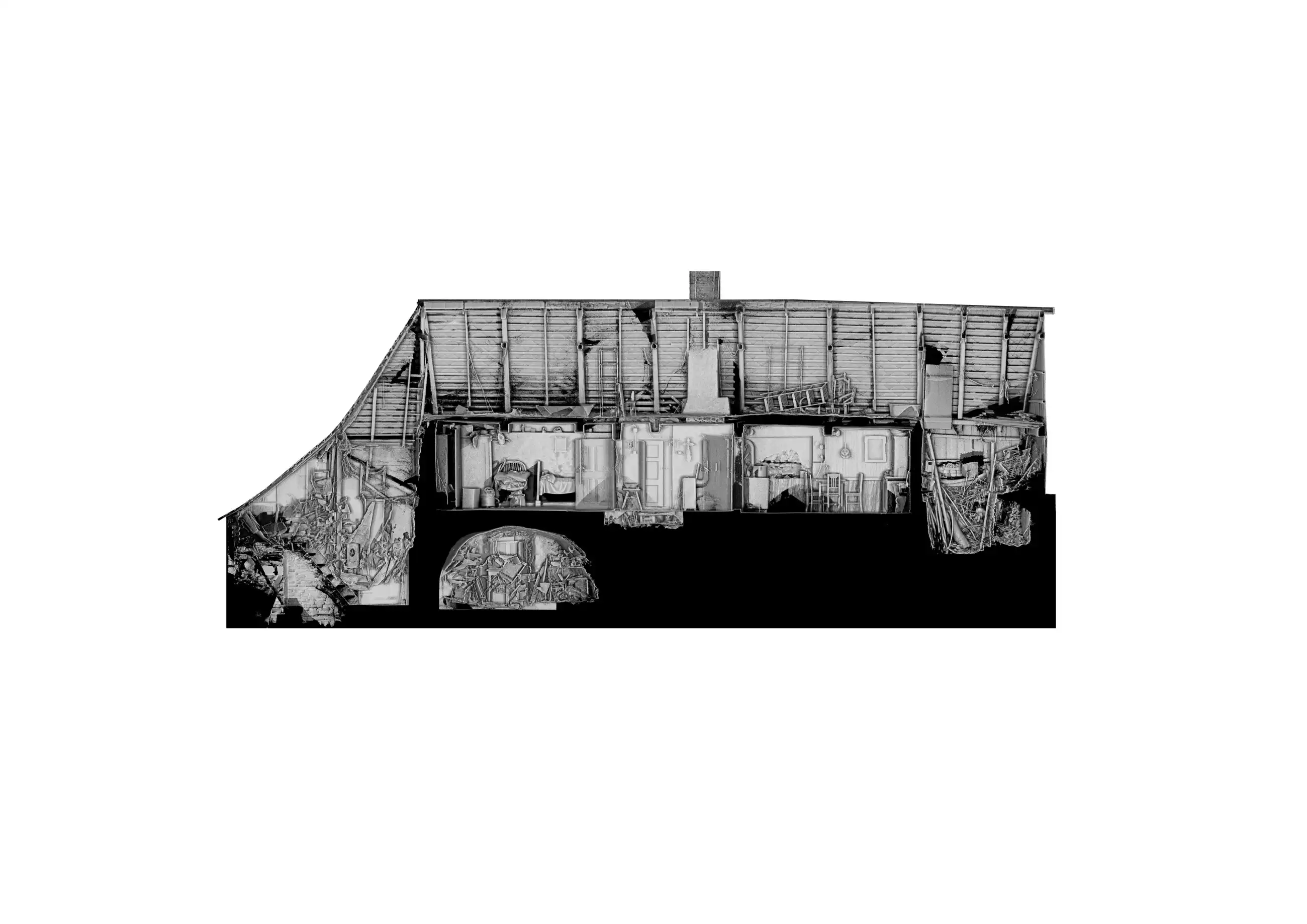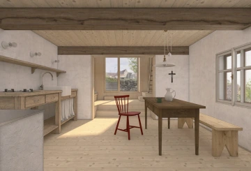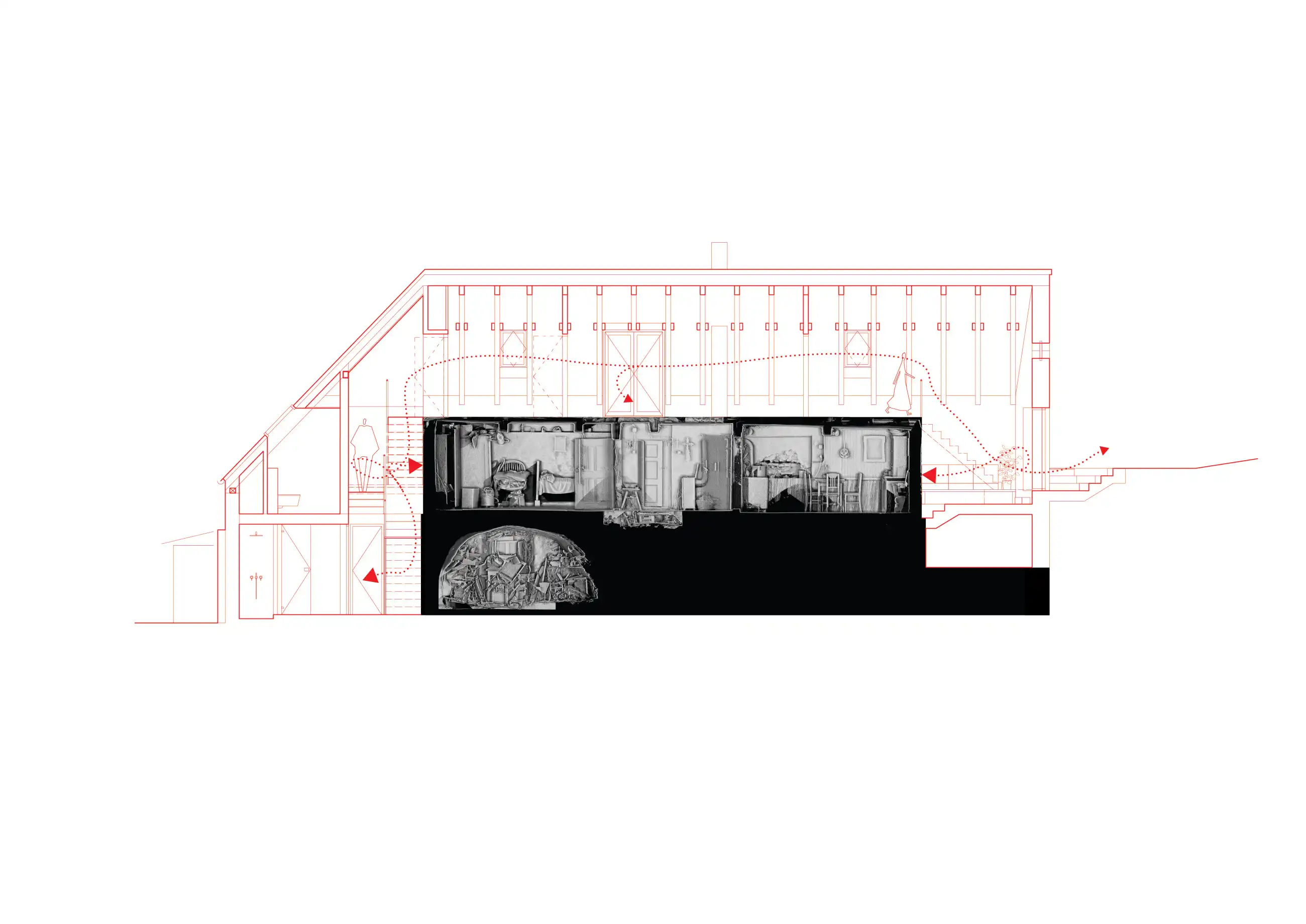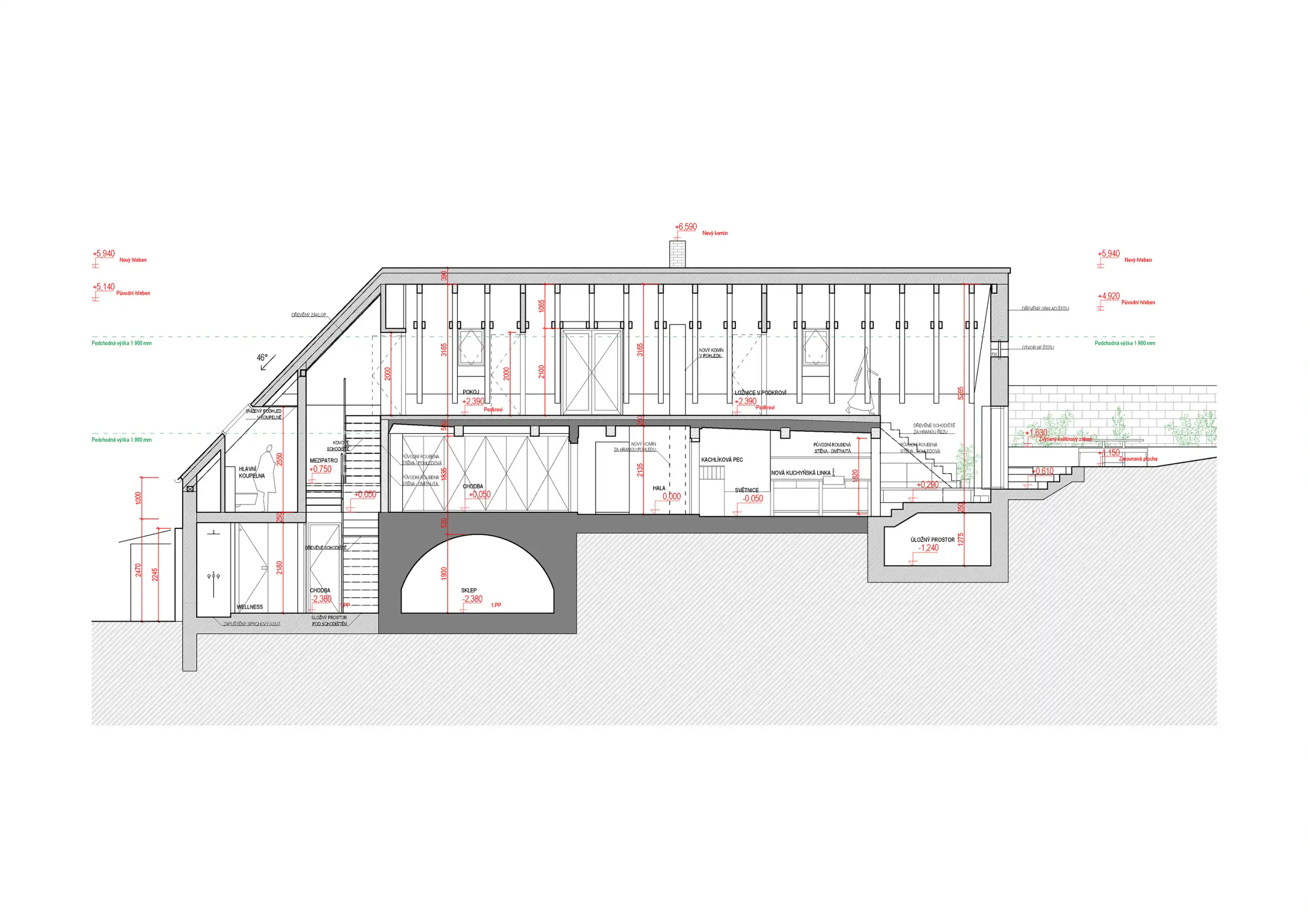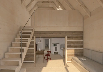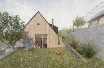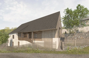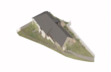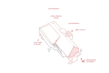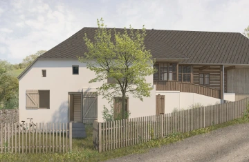 Roubená chalupa si zachovala svůj specifický tradiční výraz navzdory necitlivým dodatečným zásahům zejména z 2. poloviny 20. století. Rušivá je hlavně přístavba garáže, která mylně vytváří dojem hlavního štítu domu, přístavba koupelny a novodobá okna. V současnosti je obytná pouze střední část přízemí, obklopená stodolami u štítů a nevytápěnou půdou – jak se hezky propsalo i ve fotoscanu při zaměření. Návrh toto původní obytné jádro zachovává se snahou udržet zde co nejautentičtější podobu včetně nízkých stropů a všudypřítomné křivosti, zároveň ho obklopuje novou obálkou. Ta rozšiřuje užitnou plochu a řeší stávající nedostatky – zahrnuje hygienické zázemí, větší prosklení a výlezy na přilehlý terén pro lepší propojení s exteriérem, díky zvýšenému podkroví i nové vnitřní propojení.