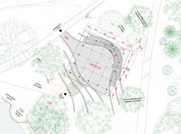 Organicky vymezená plocha v terénu má hlavní napojení bezbariérově z boční cesty a další dva směry se napojují stupni. V kontrastu k ploše stojí jasná geometrická struktura s diagonálním natočením, ketré reflektuje nedaleké budovy. Čtvercová střecha zastřešuje plošinu i sedací schody, její pilíře jakoby sestupují po stupních ve svahu dolů. Díky natočení vzniká lákavá proměnlivost z různých úhlů pohledu. Konstrukce z křížových sloupů se zaklenutím probíhá po obvodu plochy, uprostřed se do ní grid propisuje jen jako symbolické značky, možné orientační body pro tanec i jiné aktivity. Nízká zelená skladba střechy tvoří horní fasádu stavby a propojuje ji s parkem.