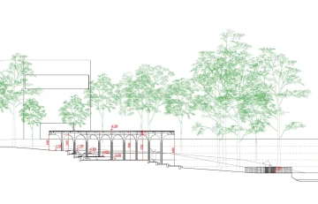 Zámecký park, dnes veřejně přístupný a oblíbený pro společenské akce i individuální rozjímání, paradoxně postrádá budovu zámku. Navíc však stejně v mezičase prošla významnou přestavbou. Návrh proto nabízí trochu nostalgický symbolický odkaz na původní pseudorenesanční budovu zámečku a přináší motiv loubí s klenutými oblouky, který přitom zůstává dostatečně abstraktní pro vlastní asociace. Jako současná parafráze je znásobené klenuté loubí zakončené rovnou konstrukcí střechy, tvořící klidnou horizontálu v protiváze vertikálám okolních stromů.