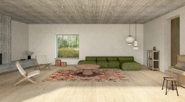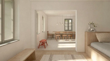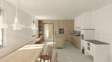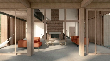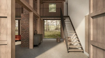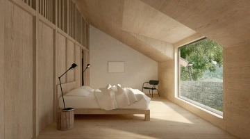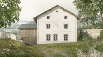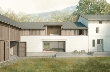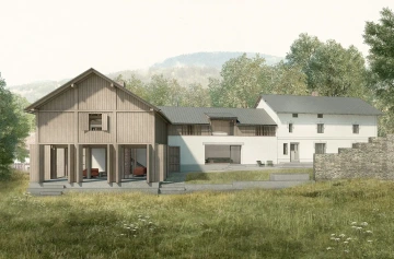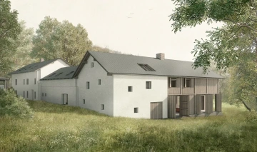 Usedlost zasazená v krásné přírodě šumavského podhůří, v malé obci, kde končí cesty v lesích a pár mohutných chalup ještě připomíná tradiční ráz šumavských roubených domů. Tuhle konkrétní usedlost sice poznamenalo několik radikálních přestaveb, i tak ale její půdorys a objem nese určité svědectví, které má smysl zachovat. Hospodářská část stodoly a chlévů byla proměněna v 80.letech nenávratně, návrh sem proto přináší už přiznaně současné dostavby. Skrz mírnou úpravu hmot a tvarování střech získává nový celek čistější výraz a nechává tak zároveň vyniknout přední části domu, kde se aspoň částečně dochoval historický charakter a konstrukce. Hlavní štít do návsi tak zachovává tradiční tvář, zatímco dostavba střední části se už otevírá velkorysým prosklením na výhledy do krajiny. Provozně jsou tyto části uvnitř propojené a nabízejí tak pestrou škálu prostorů jako zázemí pro rozvětvenou rodinu na rekreační pobyt, vnitřní členění umožňuje užívání domu v zónách podle obsazenosti. Nová dřevěná konstrukce stodoly drží její tradiční objem a uvnitř vytváří velkorysý otevřený prostor a kryté zázemí k posezení na terase nebo kolem otevřeného krbu a také nezávislý přístup do jednoho dalšího apartmánu.