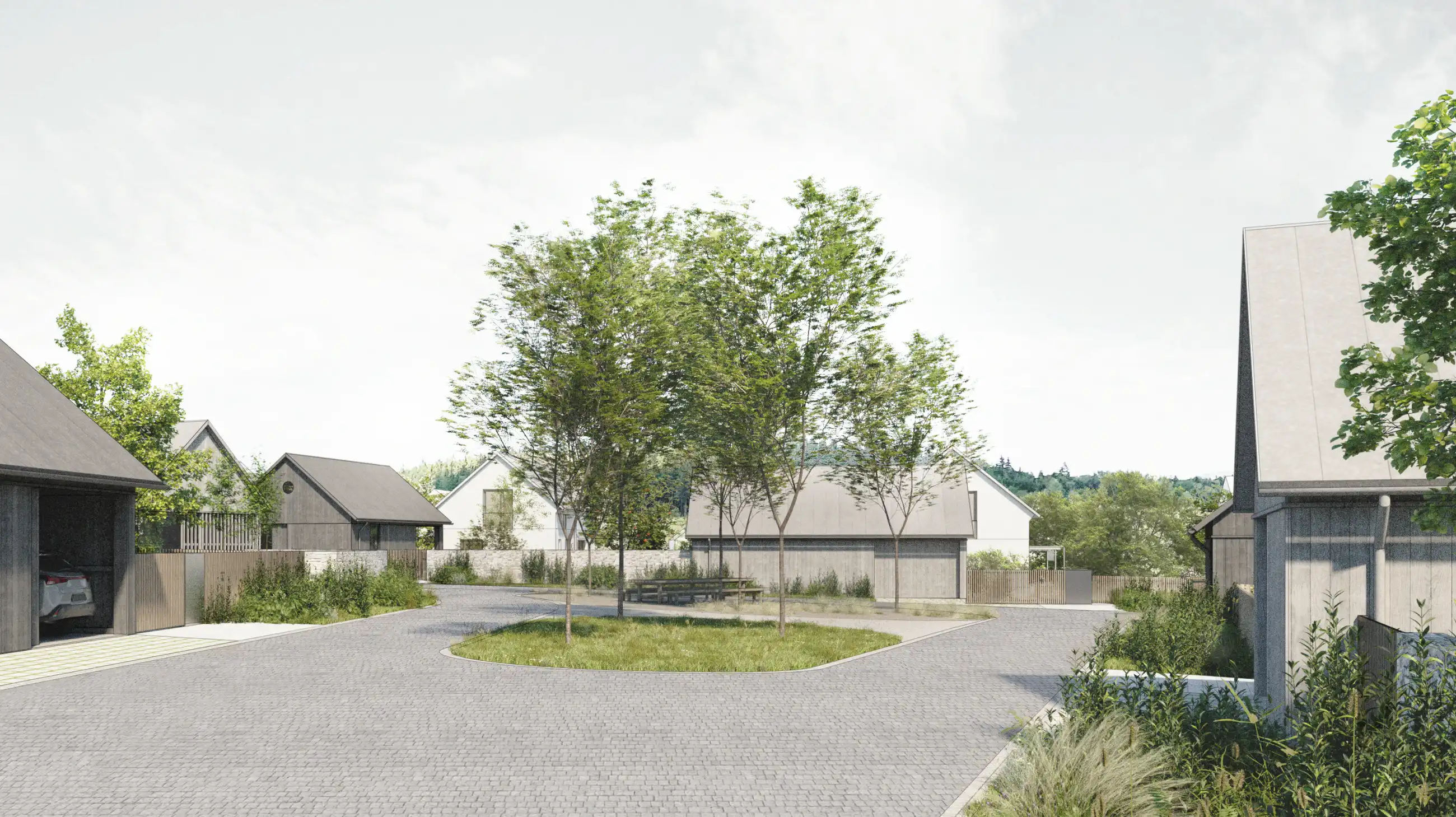 Stodoly někdy přiléhají k hranici pozemku a pomáhají tak definovat veřejný prostor i posílit soukromí jednotlivých parcel. Vzájemným natočením k hlavním domům vytváří prostorová zákoutí a určitou intimitu. Soukromé zahrady jsou dále vymezeny oplocením, jehož umístění směrem do ulice záměrně neodpovídá přesně definovaným hranicím parcel. Neoplocené předzahrádky tak oživují příjezdovou komunikaci, stejně jako ustoupené vjezdy i společná náves. Oplocení je navrženo jako kombinace kamenných zídek a dřevěného plaňkového plotu. Výsledkem je urbanisticky i architektonicky různorodou zástavba vycházející z kontextu místa.