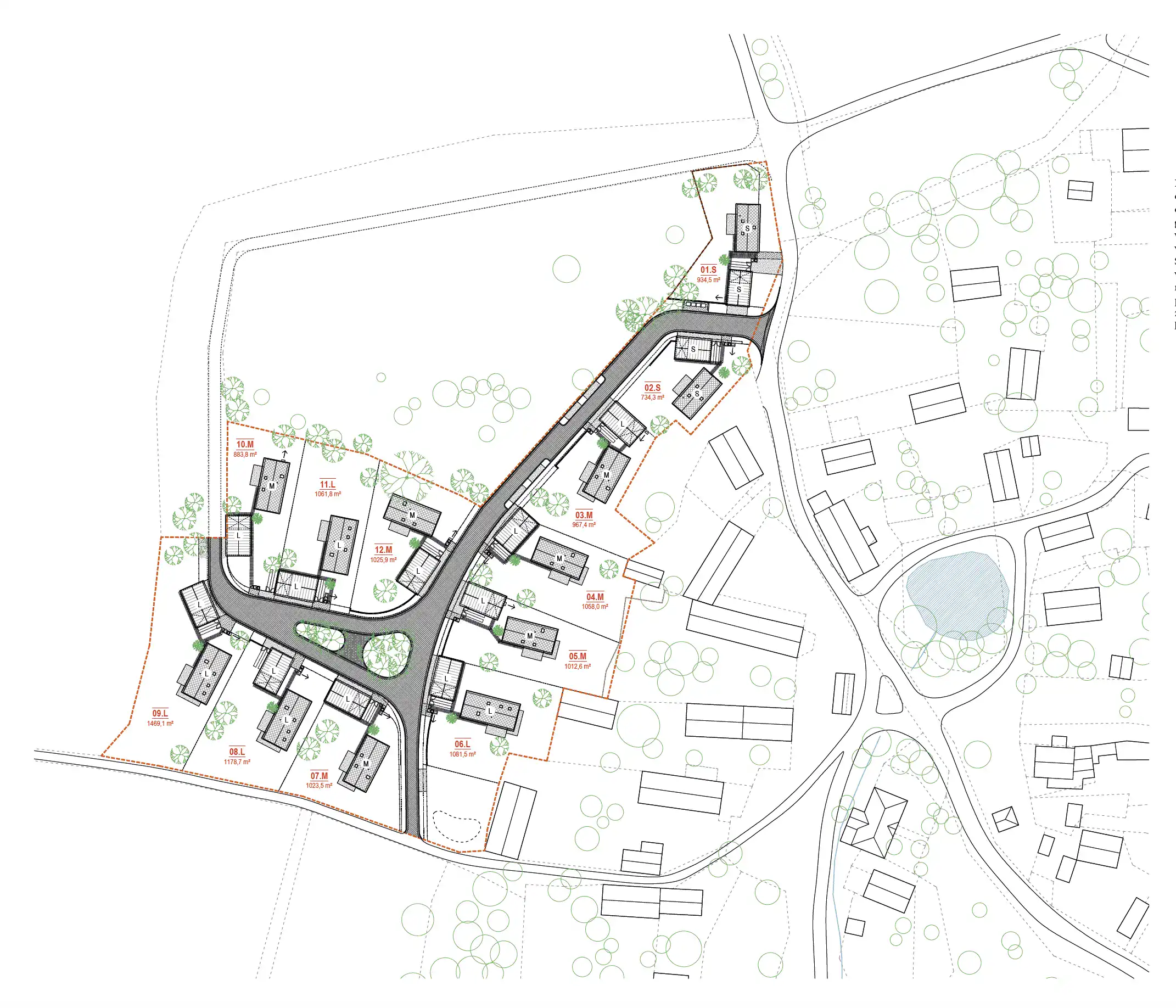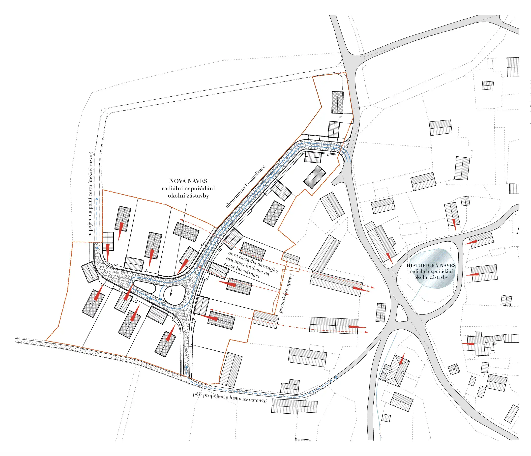 Cílem bylo co možná přirozeně navázat na původní místní zástavbu a volnou inspirací ji napojit na nový veřejný prostor i samotnou architekturu novostaveb. Každý pozemek má vedle hlavního obytného domu i doplňkovou “stodolu” s variabilním využitím, kterou je možné využít jako garáž, dílnu nebo letní kuchyni s posezením. Návrh zahrnuje tři varianty velikosti rodinných domů a dvě varianty velikosti stodol, celkem vzniká 5 variant velikostí.