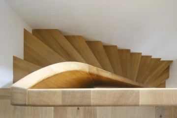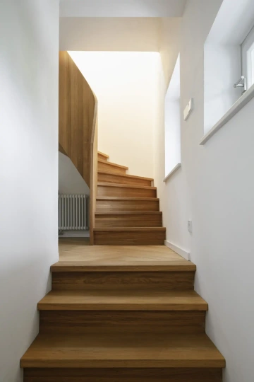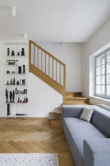Vnitřní dispozice zůstávají v zásadě dle původního rozvržení – přízemí jako hlavní obytné patro s kuchyní a jídelním koutem, další patro jako ložnice a zázemí́ pro děti, případně hosty. Nástavba obsahuje soukromí prostor rodičů - hlavní ložnici, šatnu, koupelnu a pracovní́ kout. V suterénu se ukrývá zázemí – místnost na cvičení, malá dílna, sklad a technická komora. Interiér v přízemí a patře prolíná dobové prvky a odkazy s čistým současným řešením, zatímco v nástavbě už zůstává bez nich. Mění se tak stromeček podlahy i charakter schodiště, původní spodní část s replikou zábradlí u nástupu přechází k novému zaoblenému rameni vloženému do prostoru jako objekt celý z masivního dřeva.