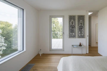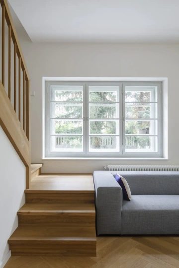 Snahou je prolnout staré i nové v jeden soudržný celek, rozlišení ponechat spíš v detailech. Vedle zateplení celé původní stavby ji nenásilně doplňuje střešní nástavba s mírným uskočením a současnější fasádou. Okna v nástavbě navazují proporcemi na původní tabulkové dělení, ale vynechávají ho pro velkorysejší výhled. Navíc se tak dům směrem nahoru opticky odlehčuje, omítka nástavby má sice stejnou barvu ale jemnější zrnitost. Zásadní bylo zachování vzrostlých stromů v těsné blízkosti vily, které stavbu i s nástavbou stále převyšují a trochu kryjí, dávají jí měřítko a intimitu.